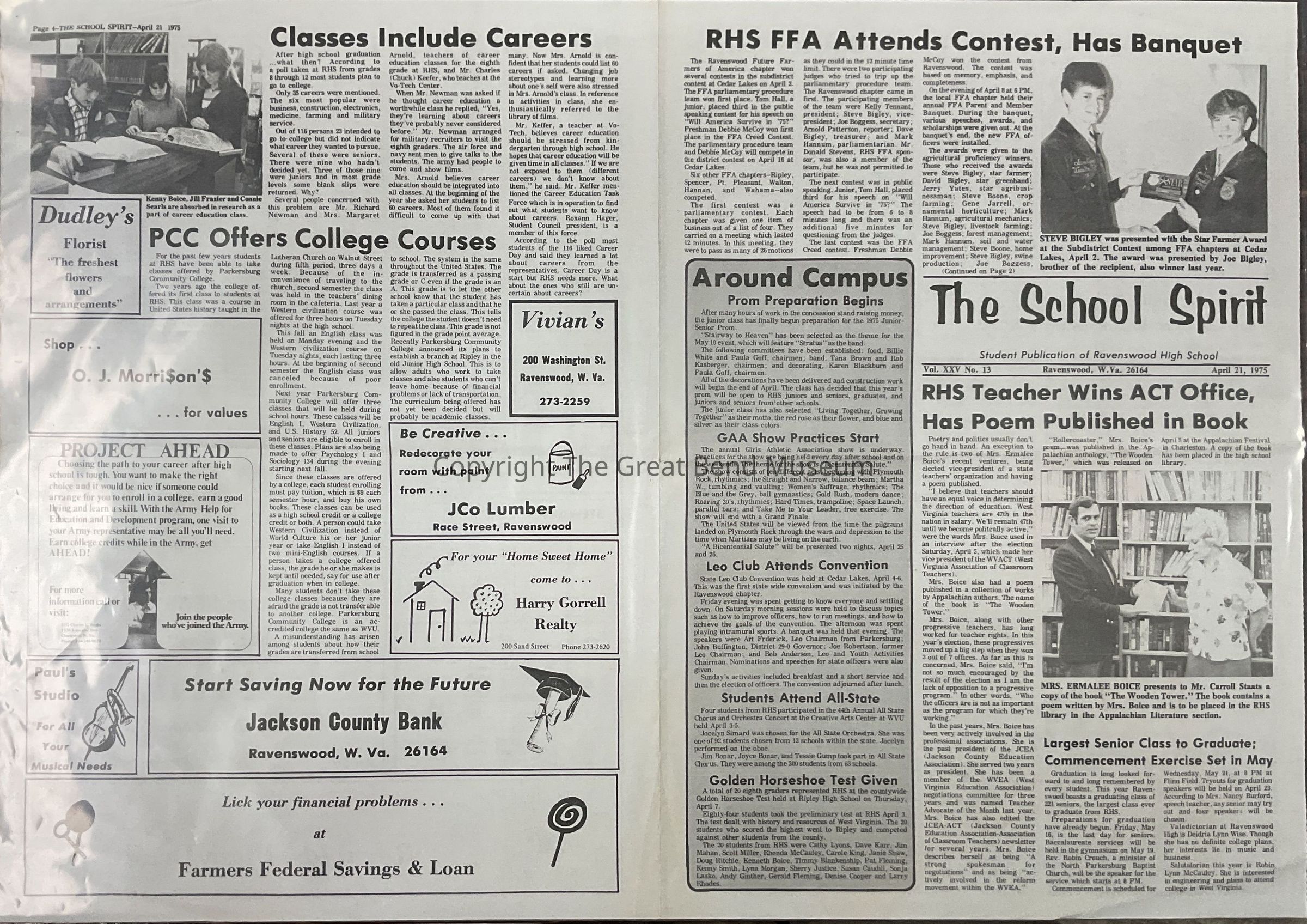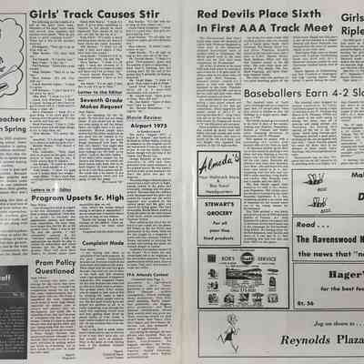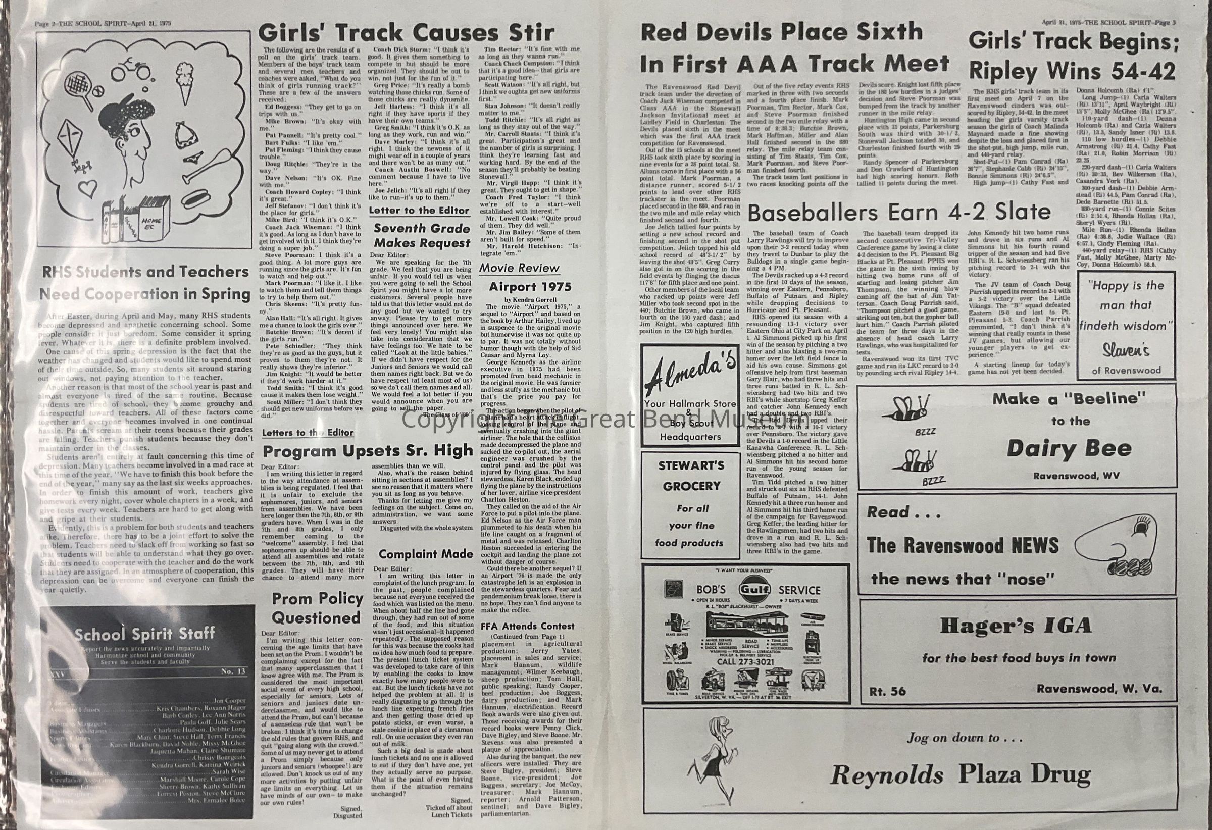 Vol. XXV, No 13, 4/21/1975 - Articles: RHS FFA attends contest, has banquet; RHS teacher wins ACT office, has poem published in book (Carroll Staats); largest senior class commencement exercise set in May (221); prom preparations begin; GAA show practice start; Leo club attends convention; students attend All-State (chorus + orchestra concert); golden horseshoe test given; girls track causes stir; movie review - Airport 1975; RHS students and teachers need cooperation in spring; Red Devils place sixth in first AAA track meet; baseballers earn 4-2 slate; girls track begins, Ripley wins 54-42; classes include careers; PCC offer college courses.