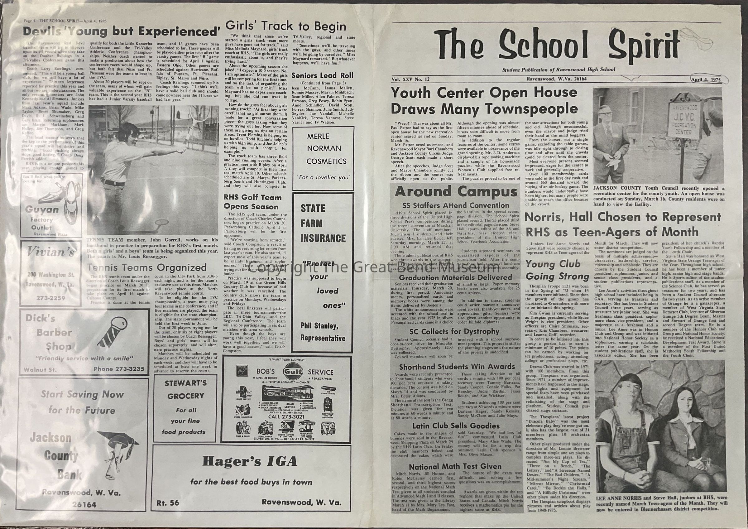 Vol.XXV, No. 12 - 4/1975 - Articles: Youth center open house draws many townspeople; Norris, Hall chosen to represent RHS as teenagers of the month; young club going strong - Thespian Troupe 1121; student council collects for dystrophy; drama groups make effort, should have more funding - Thespians and the Drama club; majority of RHS students dislike restroom smoking; guys feel coaches should be examples (smoking); seniors lead in 4th sex weeks honor roll; devils young but experienced; tennis teams organized; girls track to begin; RHS golf team opens season.Acquisition