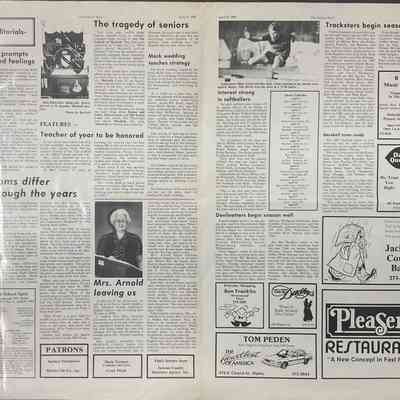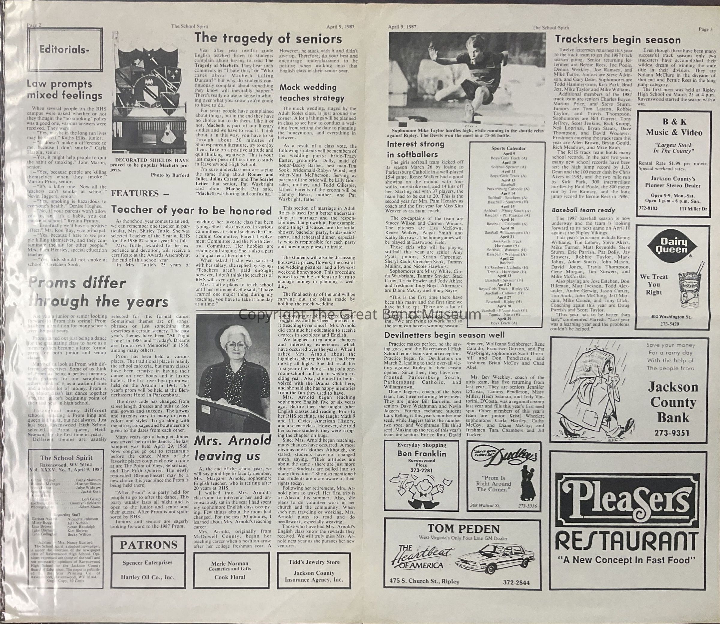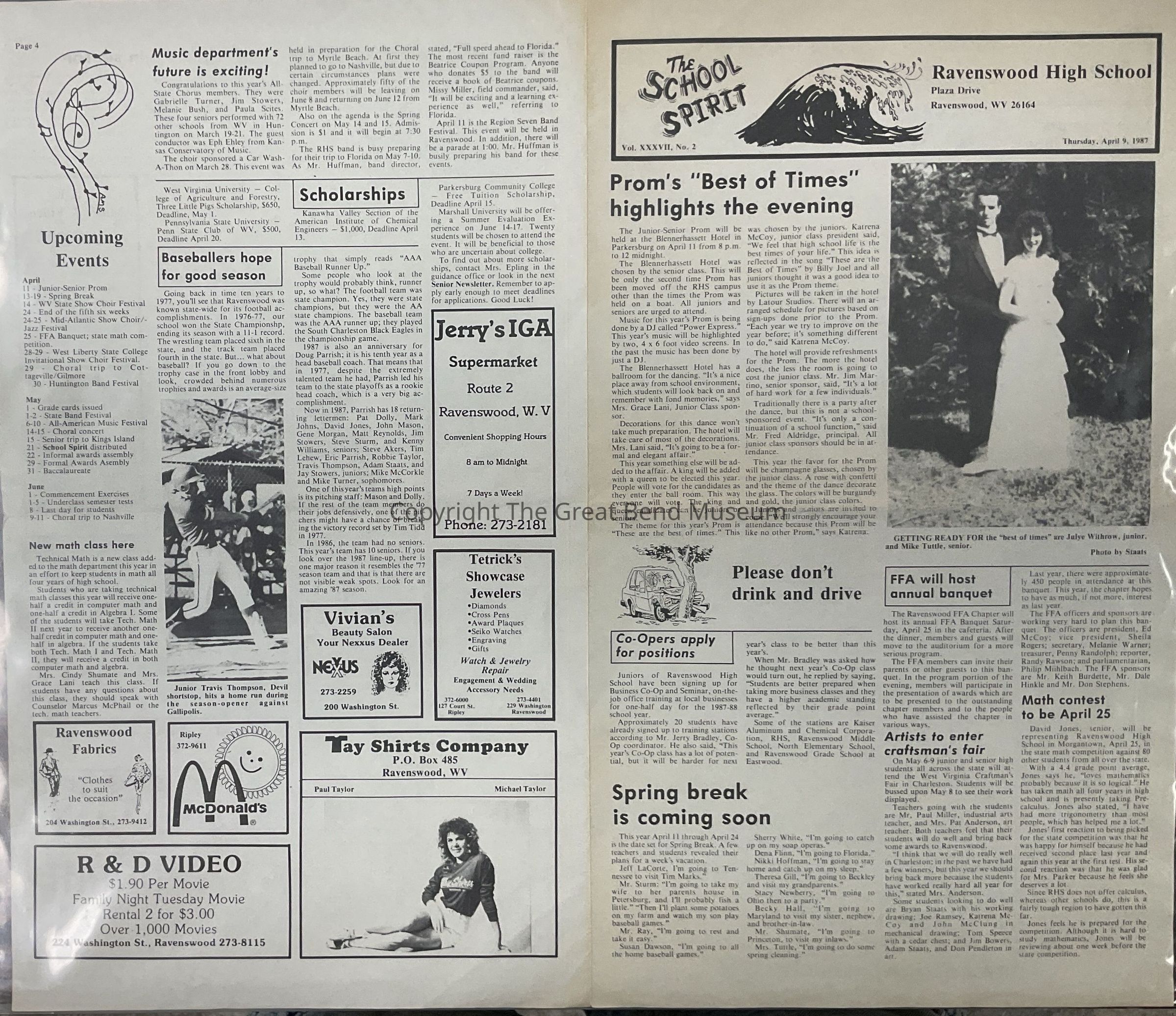 Articles: prom's best of times "highlights the evening" - king and queen - Julye Withrow, Mike Tuttle; Co-opers apply for positions; FFA hosts annual banquet; artists to enter craftsman's fair; math contest to be April 25; law prompts mixed feelings - no smoking policy; teacher of the year to be honored - mrs Shirley Tuttle; Mrs Margaret Arnold retiring - 20years; interest strong in soft ballers; tracksters begin season; baseball team ready; devil netters begin season well; music departments future is exciting; baseballers hope for good season; New math class here.