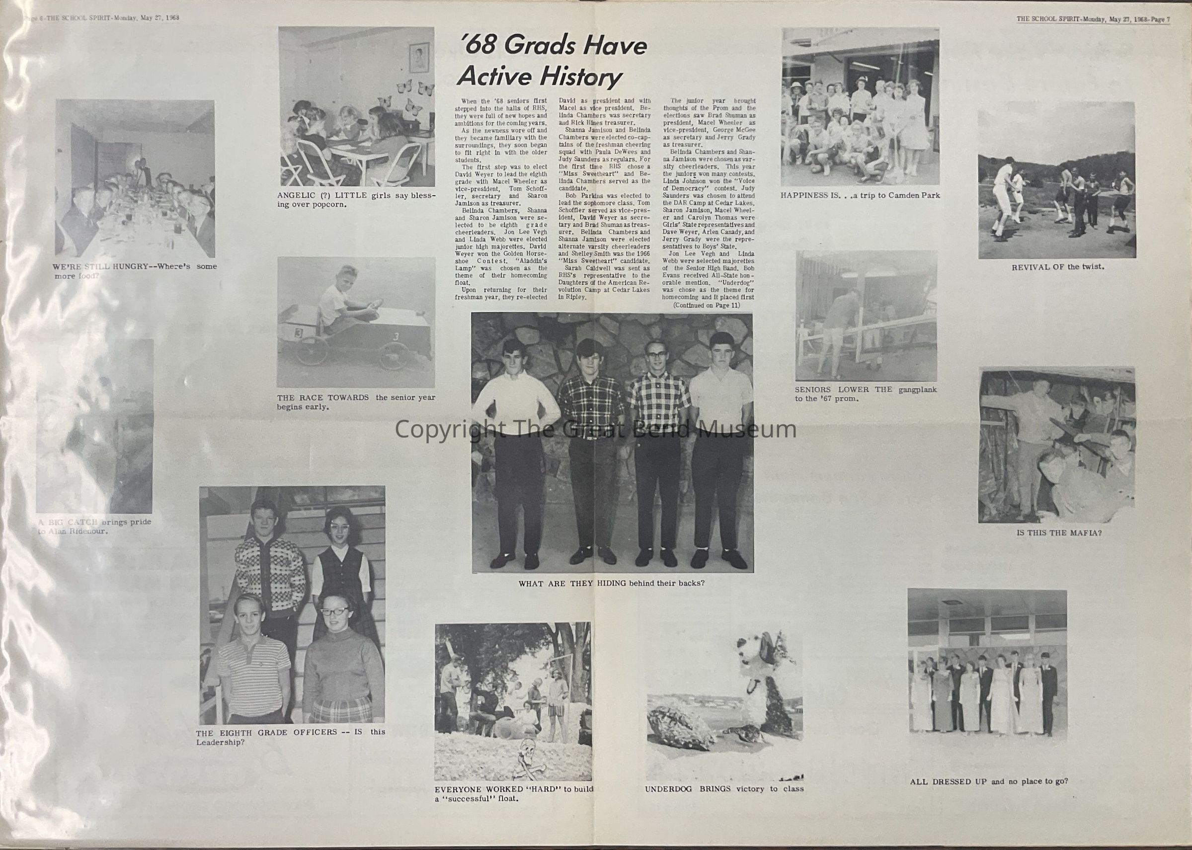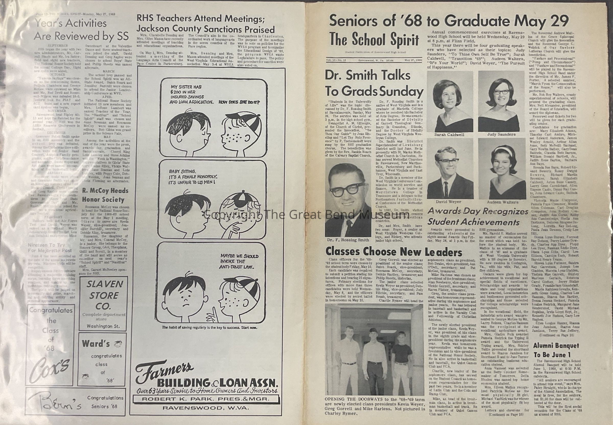 Vol 16, No 16 - 5/27/1968 - articles: seniors of '68 to graduate May 29 - 4 speakers; Sarah Caldwell, Judy Saunders, David Weyer, Audeen Walters; awards Day recognizes student achievements; Dr F Rossing Smith talks to Grads Sunday; Classes choose new leaders; personal experience shows highways insafe anytime; pictures of wrecked car; Pat Writt voices new student council plans; Juniors receive key in annual ceremony - front door of schools; varsity to lose 20 to graduation; track team sweeps LKC; Vikings nip devils - Baseball; Devils take first in regional meet - track; girls athletic association sponsors playday at RHS; '68 grads have active history - pictures; seniors take routes to future destinies; candy strippers hold first awards night; Jerry Grady selected to attend national christian leadership camp four originaal students to graduate from RHS- k-12th; Jackson County improvement selects 13 from RHS for leadership conference; seven accepted into Thespians Audeen Walters and David Weyer graduate no.1 in class of '68Acquisition