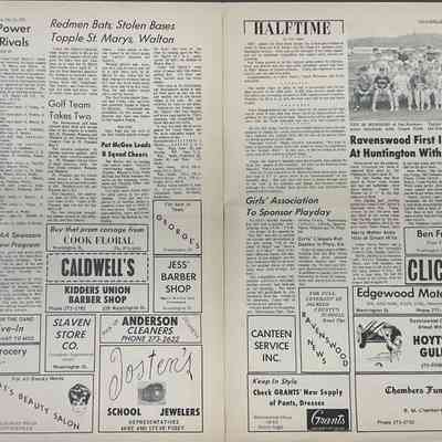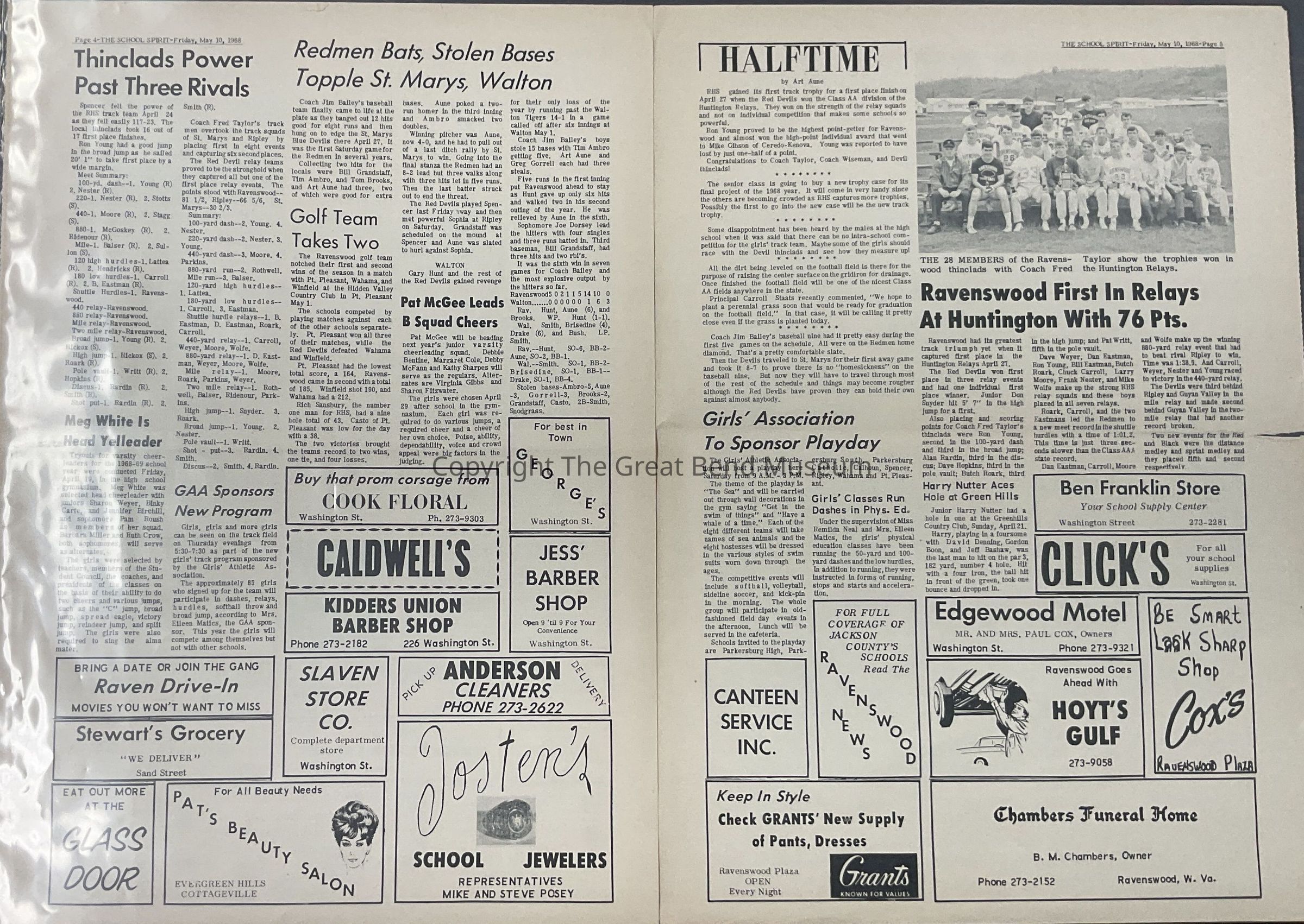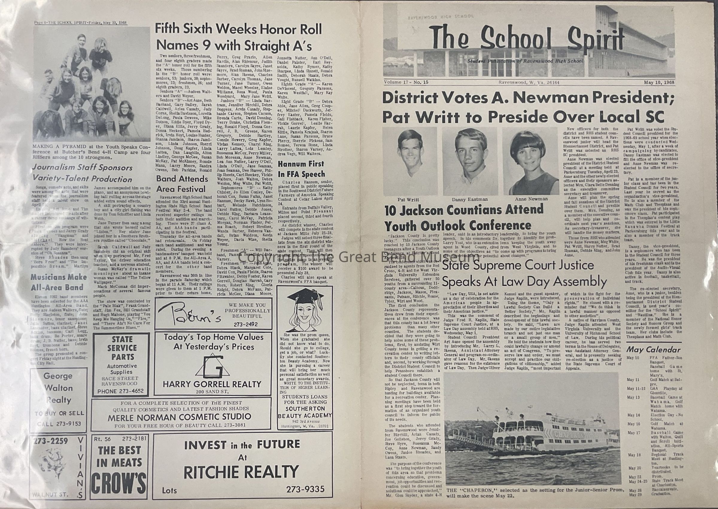 Vol 17, No 15 - 5/10/1968 Articles: District votes Anne Newman president - Blennerhassett District SC, Pat Writt to preside over local student council, Danny Eastman V.P.; 10 Jackson Countians attend youth outlook conference; state supreme court justice speaks at law day assembly; picture of the "Chaperon" setting for junior/ senior prom; actors initiate 8 members - Thespians; girls prove coutious in drivers ed class; medical check ups in RHS lobby; 14 eighth graders take annual test in ripley April 19; four juniors chosen to attend girls state; thinelads power past three rivals - RHS, Spencer, St. Marys; Redmen Bats, Stolen Bases topple St. Mary's, Walton; Golf Team takes two - Pt Pleasant, Wahama, Winfield; Pat McGee leads B squad cheers; Ravenswood first in relays at Huntington with 76pts, picture of 28 members of Ravenswood thinclads with coach Fred Taylor shoe the trophies won in Huntington relays; girls association to sponsor playday; girls classes run dashes in phys. ed; journalism staff sponsors variety - talent production; fifth six-week Honor Roll - names 9 with straight A'sAcquisition