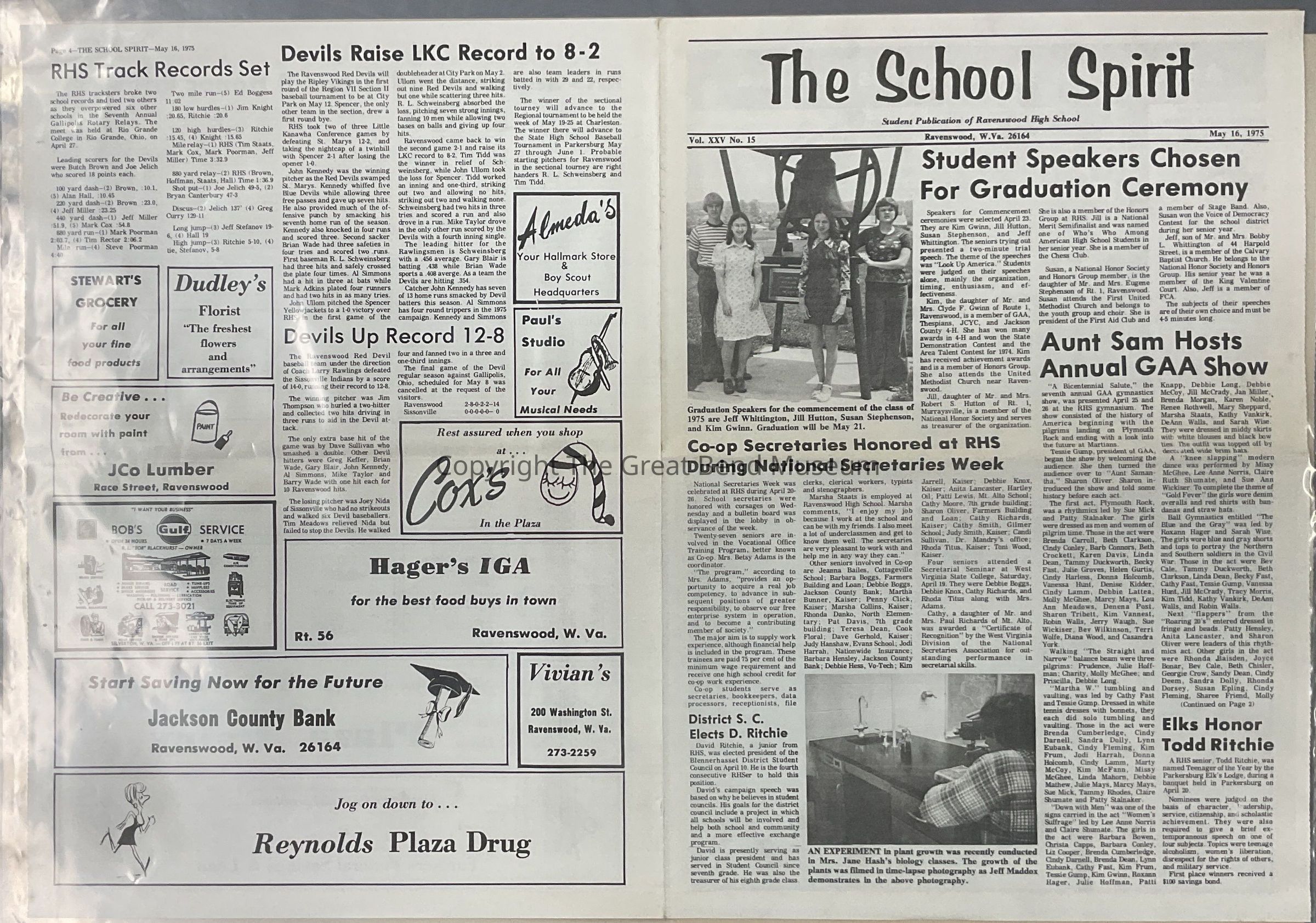 Vol. XXV, No 15 - 5/16/1975 - Articles: student speakers chosen for graduation ceremony (Jeff Whittington, Jill Hutton, Susan Stephenson, Kim Gwinn); Co-op secretaries honored at RHS during national secretaries week; district student council elects Doug Ritchie (president); Aunt Sam hosts annual GAA shoe; Elks honor Todd Ritchie - teenager of the year; annual GAA show salutes America - pictures; RHS seniors lead A and B honor rolls; RHS track records set; devils raise LKC record to 8-2(baseball), devils up record 12-8(baseball).Acquisition