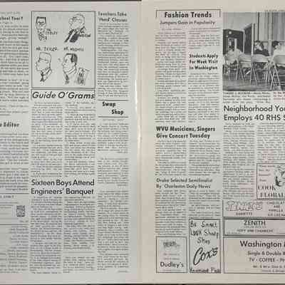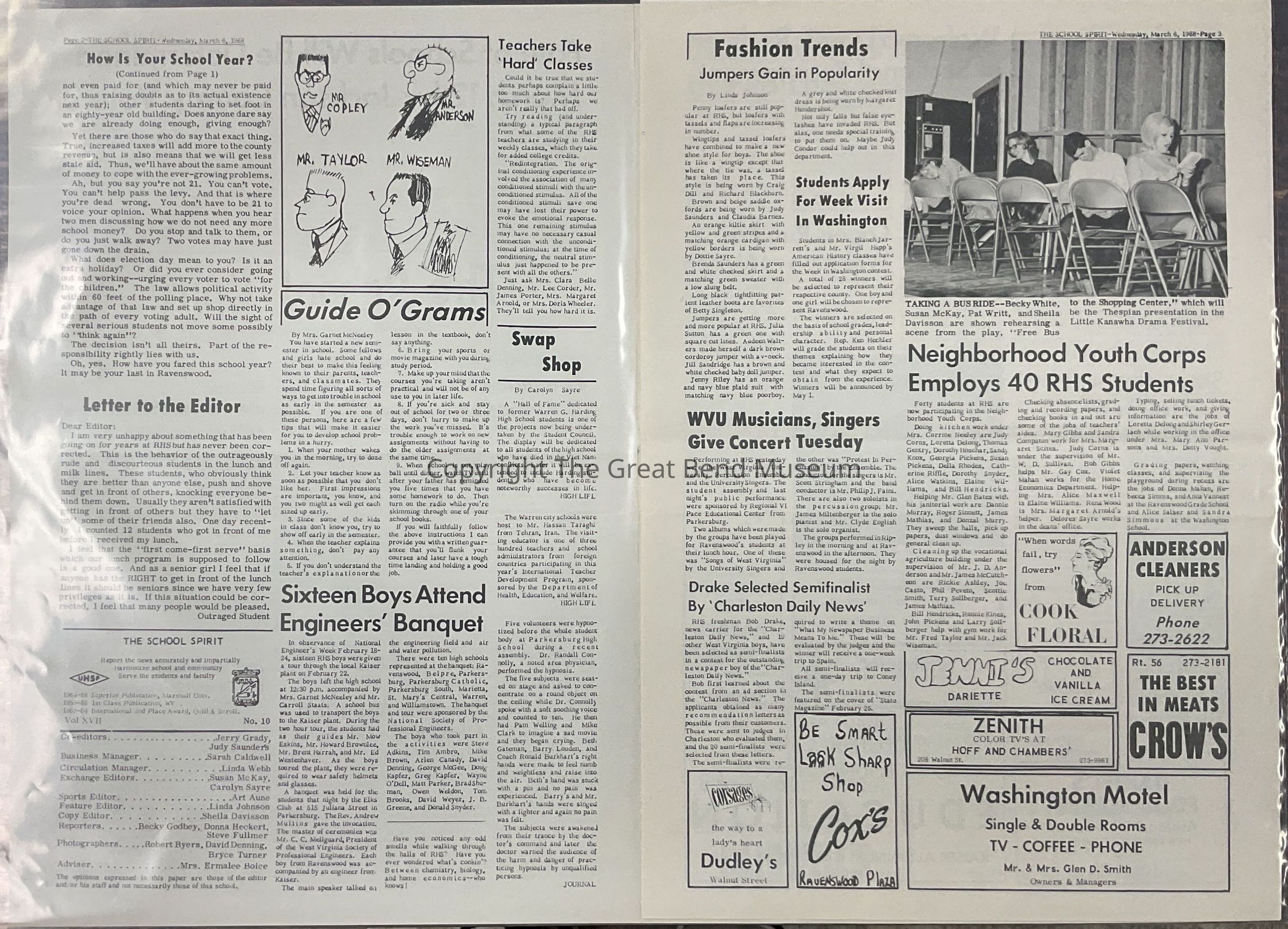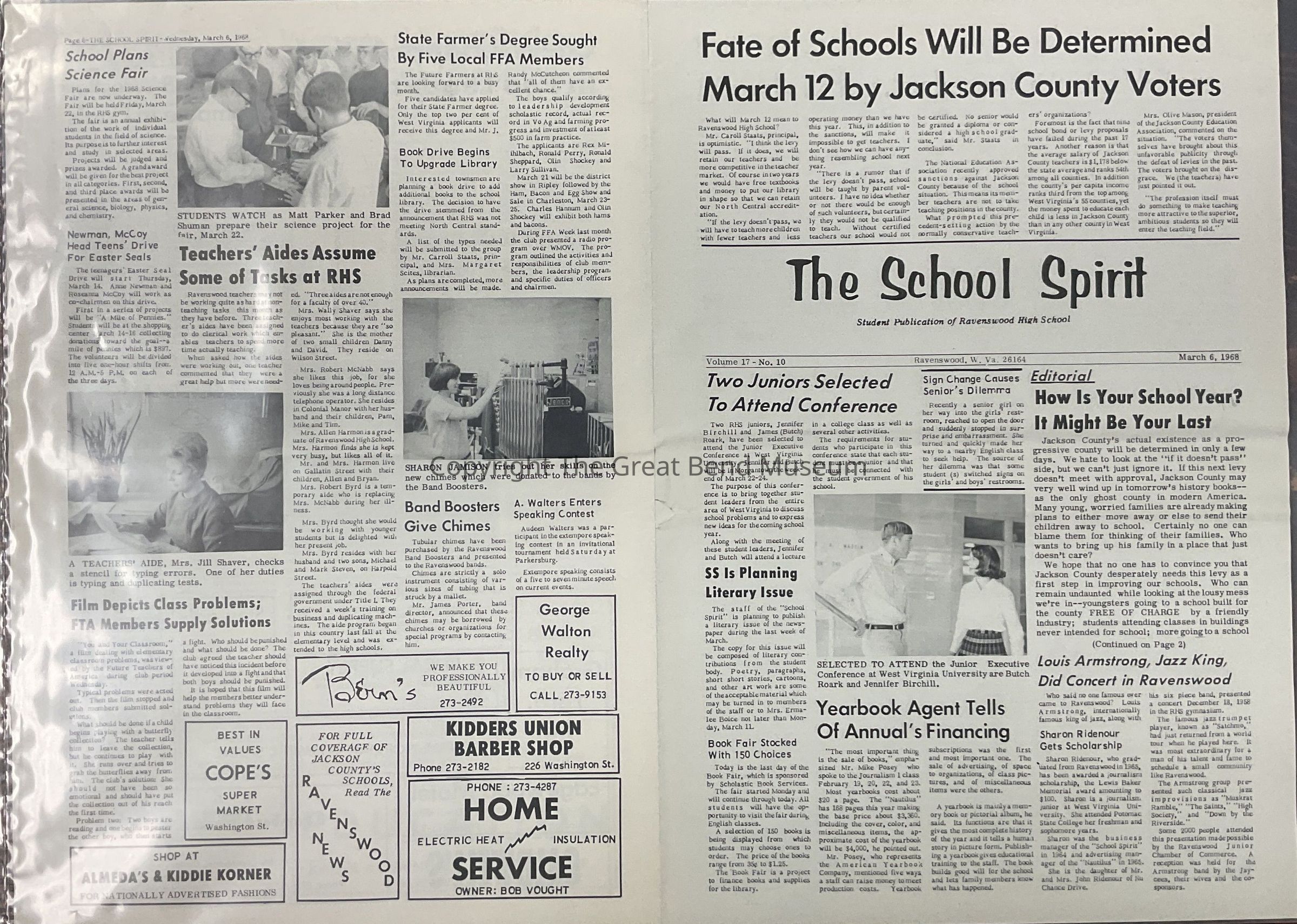 Vol.17, No 10 - 3/6/1968 - Articles: Fate of Schools will be determined 3/12 by Jackson County voters; two juniors selected to attend conference; school spirit is planning literary issue; book fair stocked with 150 choices; Louis Armstrong, Jazz king, did concert in Ravenswood; Sharon Ridenour gets scholarship; 16 boys attend engineer's banquet; fashion trends; students apply for week visit in Washington; WVU musicians, singers give concert Tuesday; Bob Drake selected by "Charleston Daily News"; Neighborhood Youth Corps employs 40 RHS Students; cheerleaders active in pep leadership; two RHS wrestlers compete in finals, Burton places fourth; Frosh Coach comments on his first season; freshman end season with revenge victory; Teachers aides assume some of tasks at RHS; state farmer's degree sought by five local FFA members, band boosters give chimes to Ravenswood Band.Acquisition