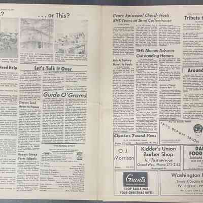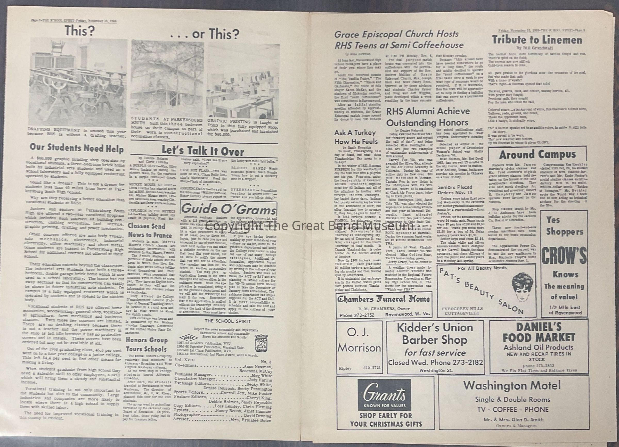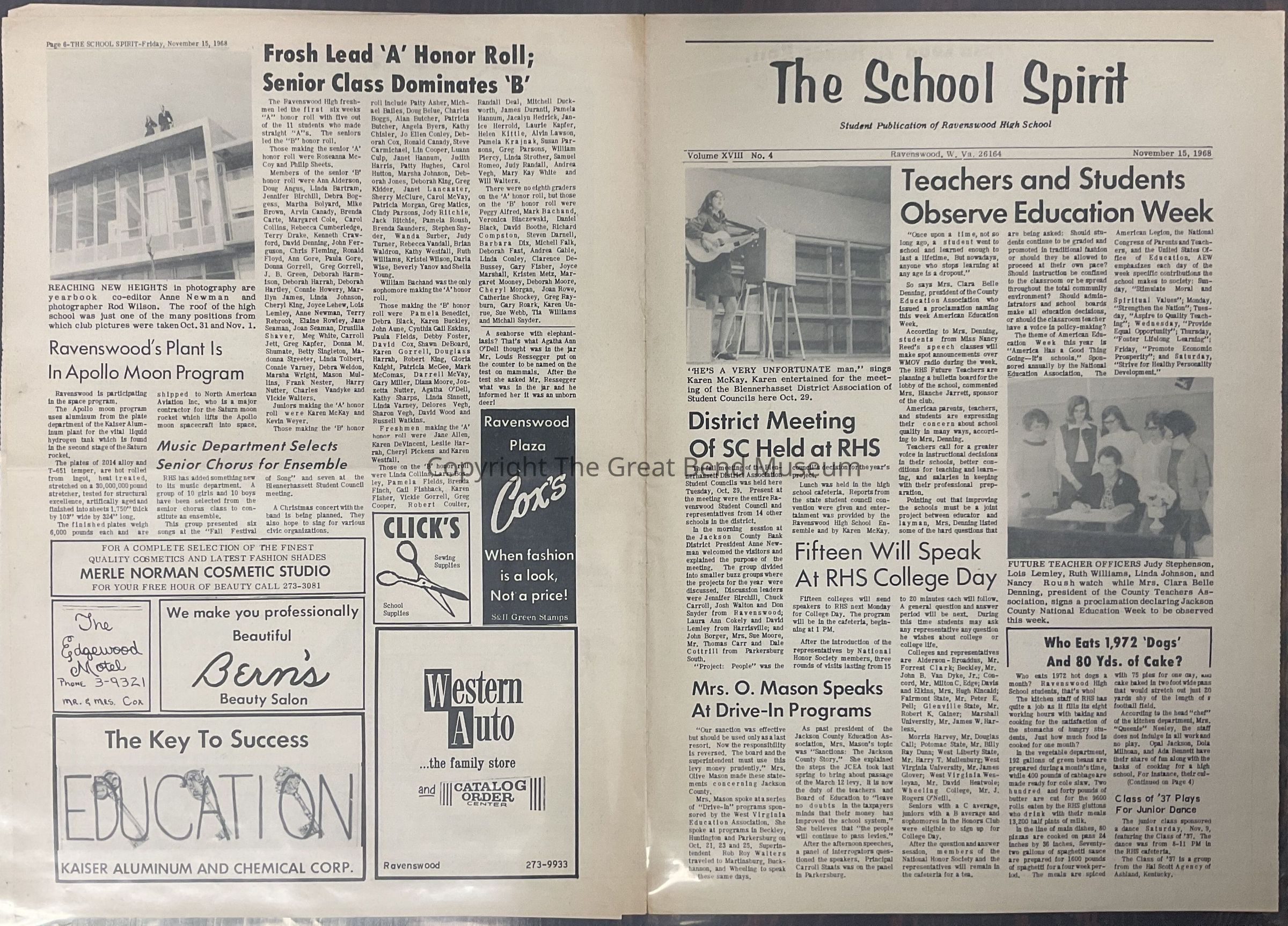 Vol.XVIII, No 4 - 11/15/1968 - Articles: teachers and students observe education week; district meeting of student council held at RHS; fifteen will speak at RHS College Day; class of '37 plays for junior dance; Our students need help (for vocational classes); Grace Episcopal Church hosts RHS teens at semi coffee house; seniors placed orders Nov.13 (for graduation announcements, etc) Taylor's troops beat big blacks (football); twirlers stage fire routine; school spirit staff to sell "The Viking Press" (in RHS lobby); devils crush warriors with 63-13 shellacking, "J" students go to workshop (journalism); Red Devils winning streak ends; 1968-1969 Basketball schedule; Frosh leads "A" Ravenswood Plant's on Apollo Moon program (Kaiser Aluminum)