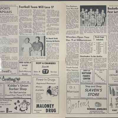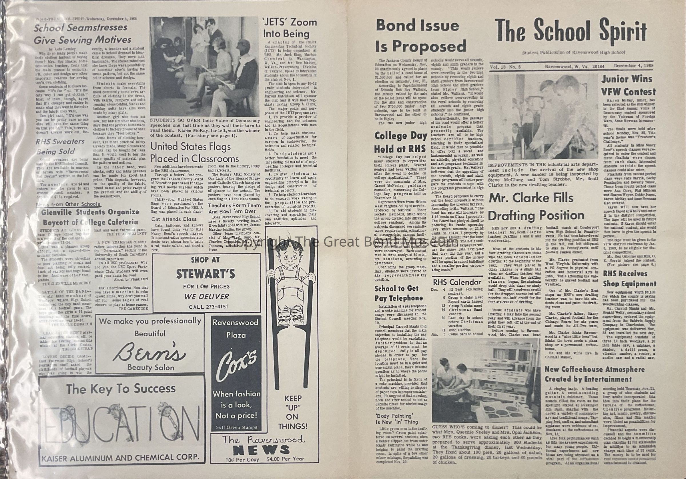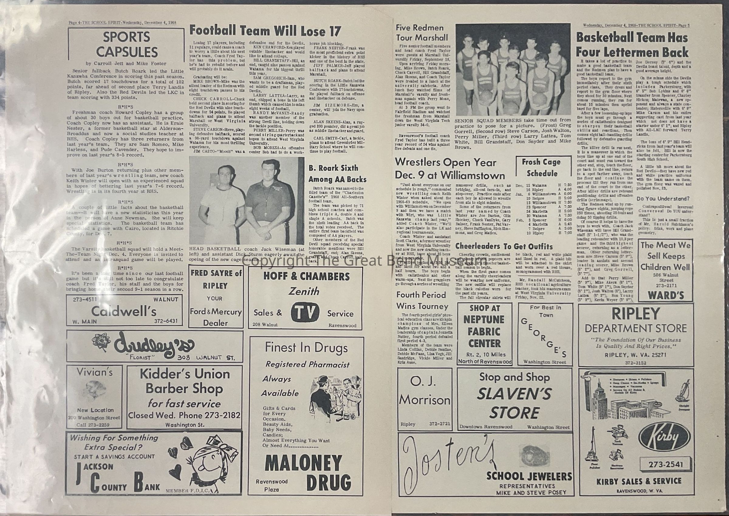vol.18, No5 12/4/1968 - articles: Bond issue is proposed (for $1,500,000 for new middle schools in Ripley and Ravenswood) college day held at RHS; school to get pay telephone and coke machine; body painting is new in thing; Mr.Clark fills drafting position; Junior wins VFW contest (Karen McCay, voice of democracy) RHS Receives shop equipment; new coffee house atmosphere created by entertainment; Glenville college sends new instructor (Mr.Carl Dodrill); state police speaks on law; Glenville state toured by students and Mr. Porter; junior class gets class rings; Freda Allman relates experiences in Japan; Europe, Hollywood, Caribbean Vacation spots for Sullivans; curriculum is survey topic; superintendent talks to PTA; football team will lose 17 players; Butch Roark Sixth among AA backs; five redmen tour Marshal; cheerleaders to get outfits; wrestlers open year Dec.9 at Williamstown; Baskeball team has four lettermen back; school seamstresses give sewing motives; US flags placed in classrooms; Jets zoom into being (Junior Engineering Technical Society); Glenville students boycott of college cadeteria.Acquisition