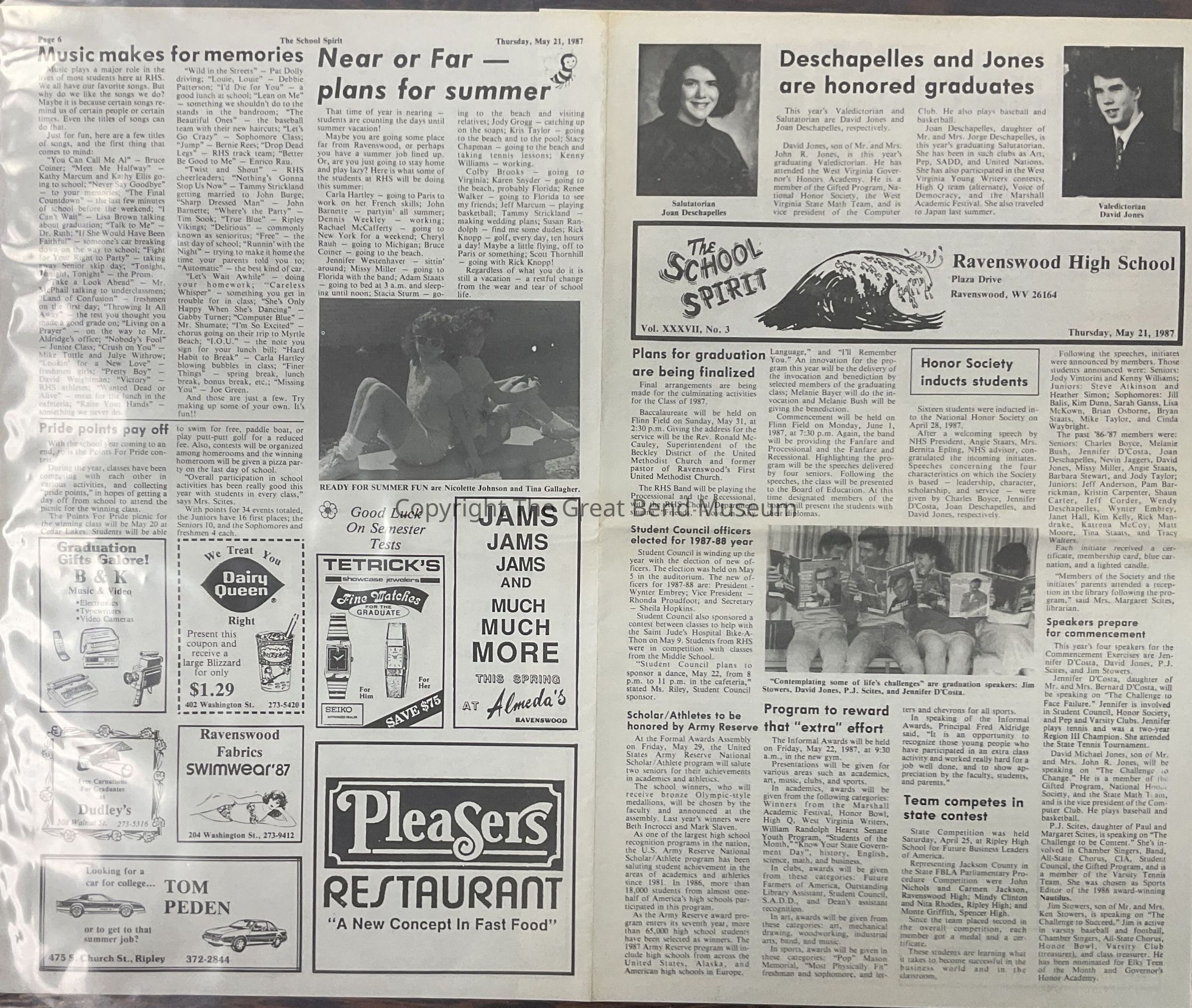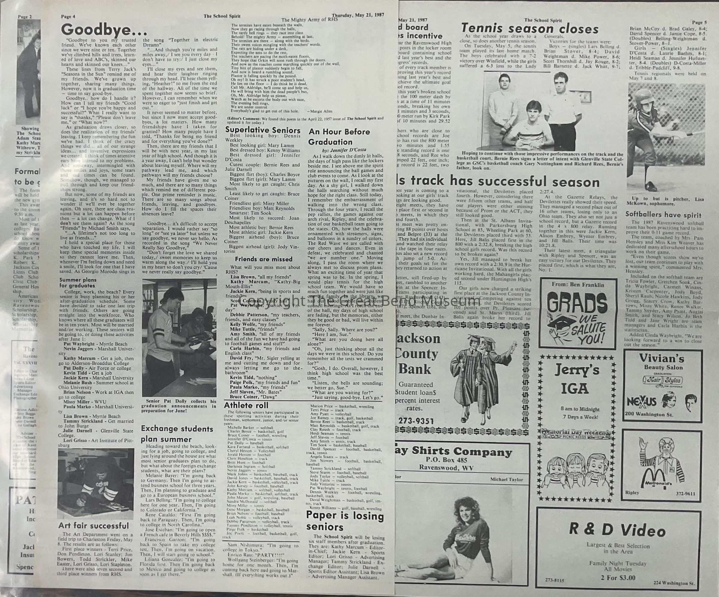 Articles: Joan Deschapelles - salutatorian and David Jones - valedictorian are honored graduates; plans for graduation are being finalized; honor society inducts students; student council officers elected for 1987-88 year; scholar athletes to be honored by Army reserves; program to reward that extra effort - informal awards; speakers prepare for commencement - Jennifer D'Costa, David Jones, P.J. Scites, Jim Stowers; RHS teachers are interested in coaching formal awards to be given; Elks select RHS girls as student of the month - Joni Deschapelles; poem: "Alone on an Saturday Night" by Kim Fisher; smoking is not smart; seniors will treasured items; childhood pictures of seniors; poem - "The Mighty Army of RHS" by Margie Allen (4/22/1957) poem - "An Hour Before Graduation" by Jennifer D'Costa; athlete roll of seniors; tennis season closes; girls track has successful season; picture of Bernie Rees Signing letter of intent with Glenville State College for track and basketball.