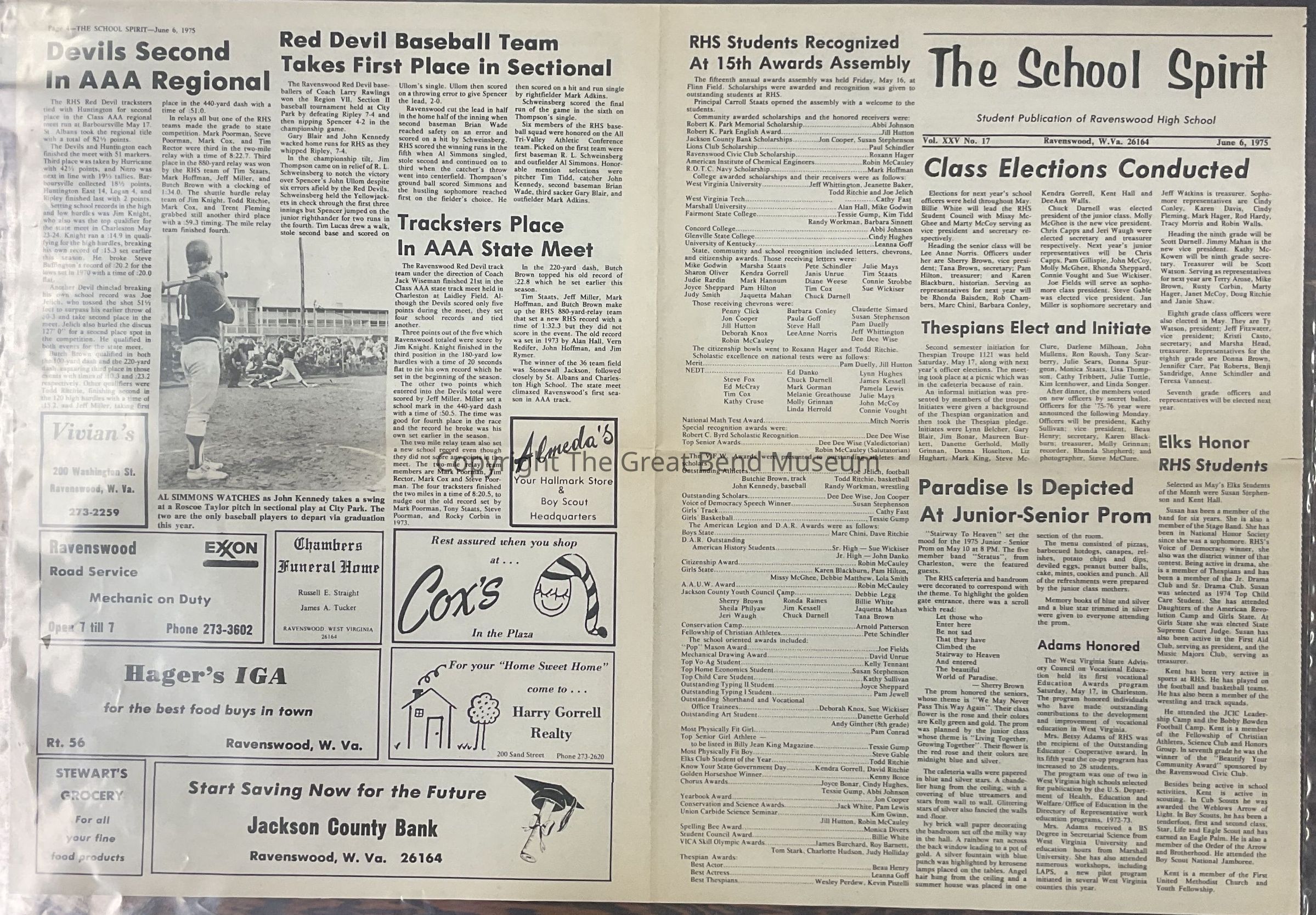 Vol. XXV, No. 17, 6/6/1975 Articles: RHS students recognized at 15th awards assembly; class elections conducted; Thespians elect and initiate; paradise is depicted at Junior - Senior prom; Adams Honored - Mrs Betsy Adams - outstanding educator - cooperative award; elks honor RHS students; Trent Fleming parachuting adventure; Olive Mason in retiring; RHS students participating in guided design lecture; Welcome seniors - collage of pictures (Juniors); Devils. second in AAA Regional; Red Devils Baseball Team takes first place in sectional; tracksters place in AAA state meet.