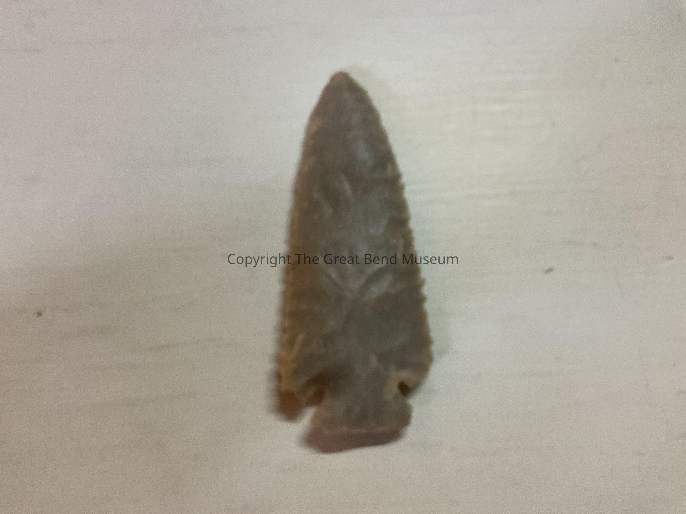 Large light gray blade. Leaf shaped blade, edges straight ending in barbed shoulders. Base strongly corner notched. Basal edge flared and straight. Likely functioned as a knife blade.Acquisition