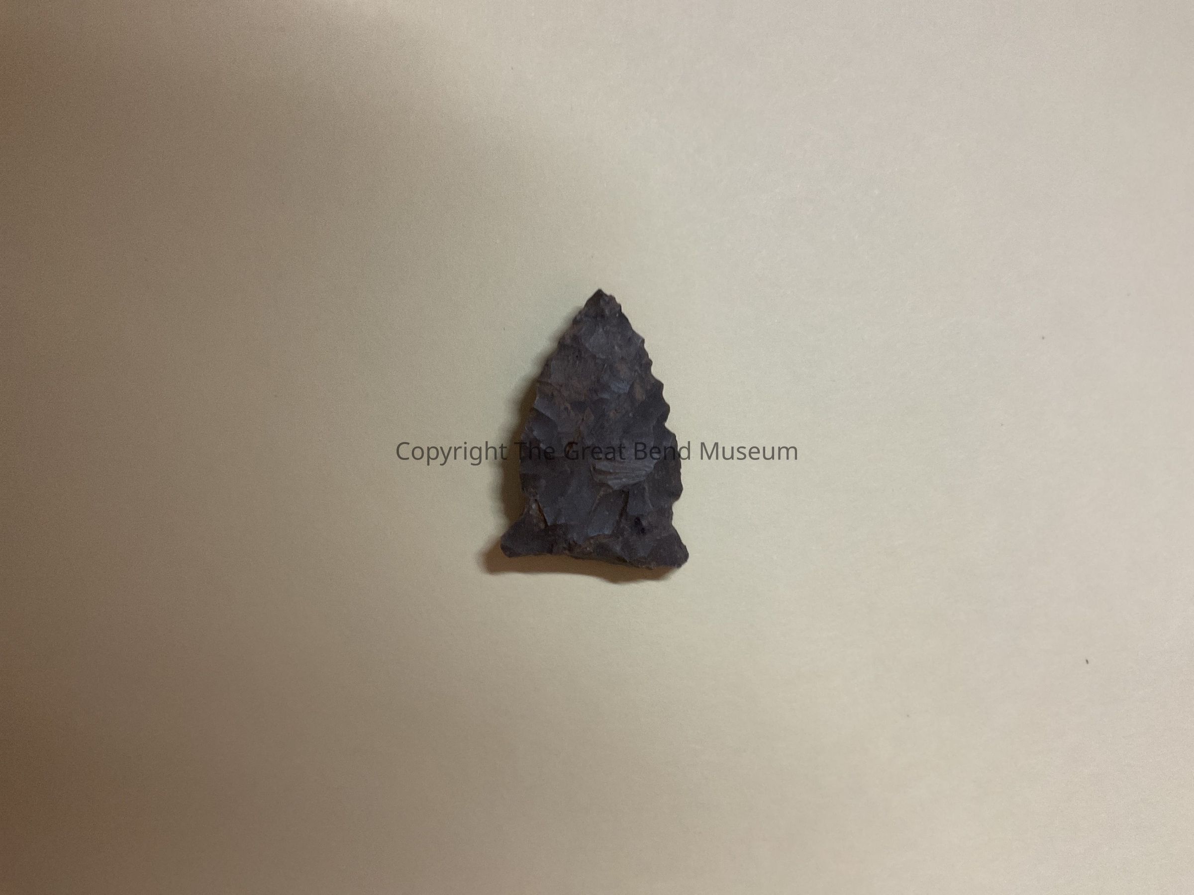 Small gray-brown triangular point . Side notches are slight and close to sides of point. Basal edge is straight and worked edge. Basal edge flares from the side notches.Acquisition