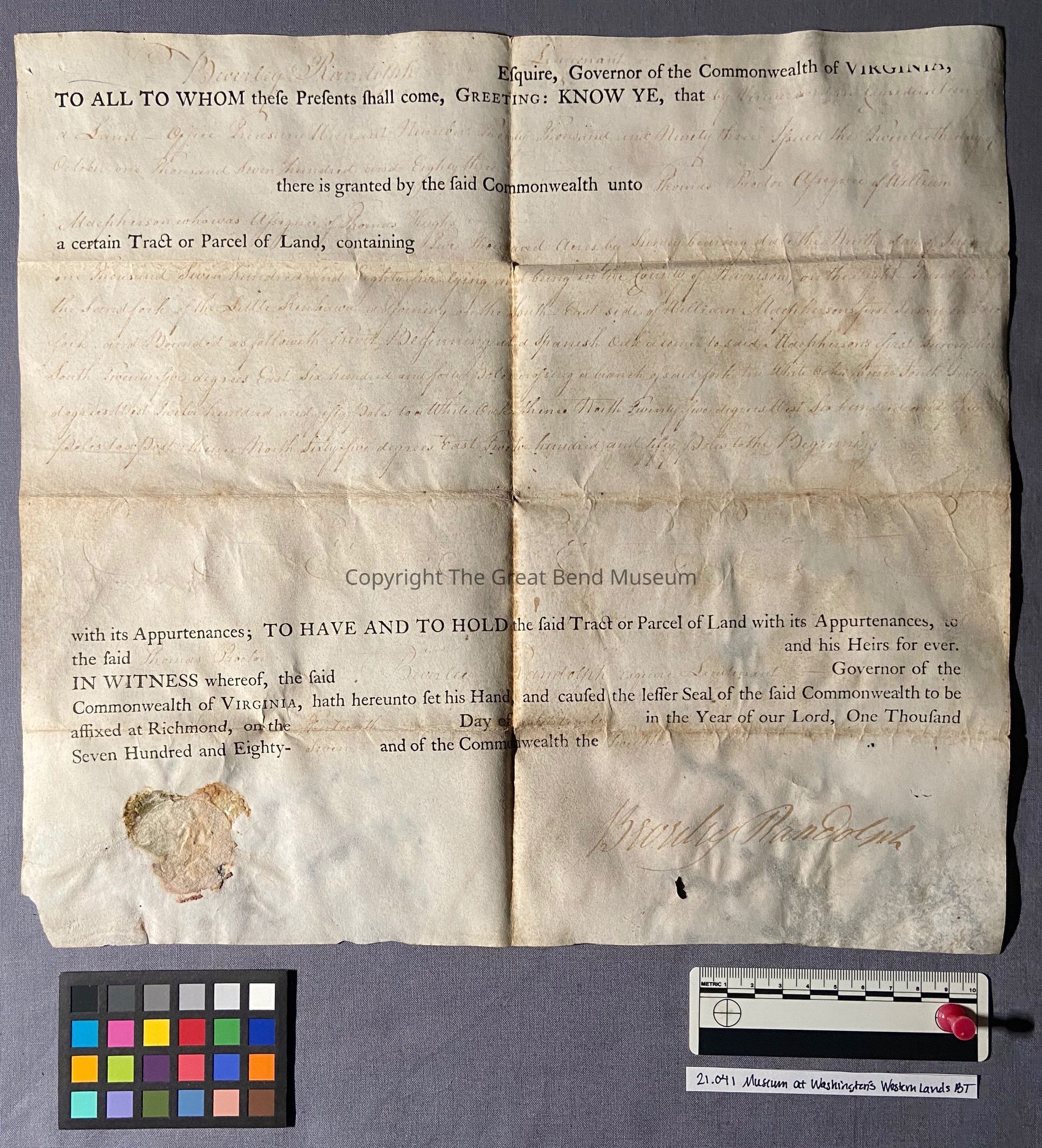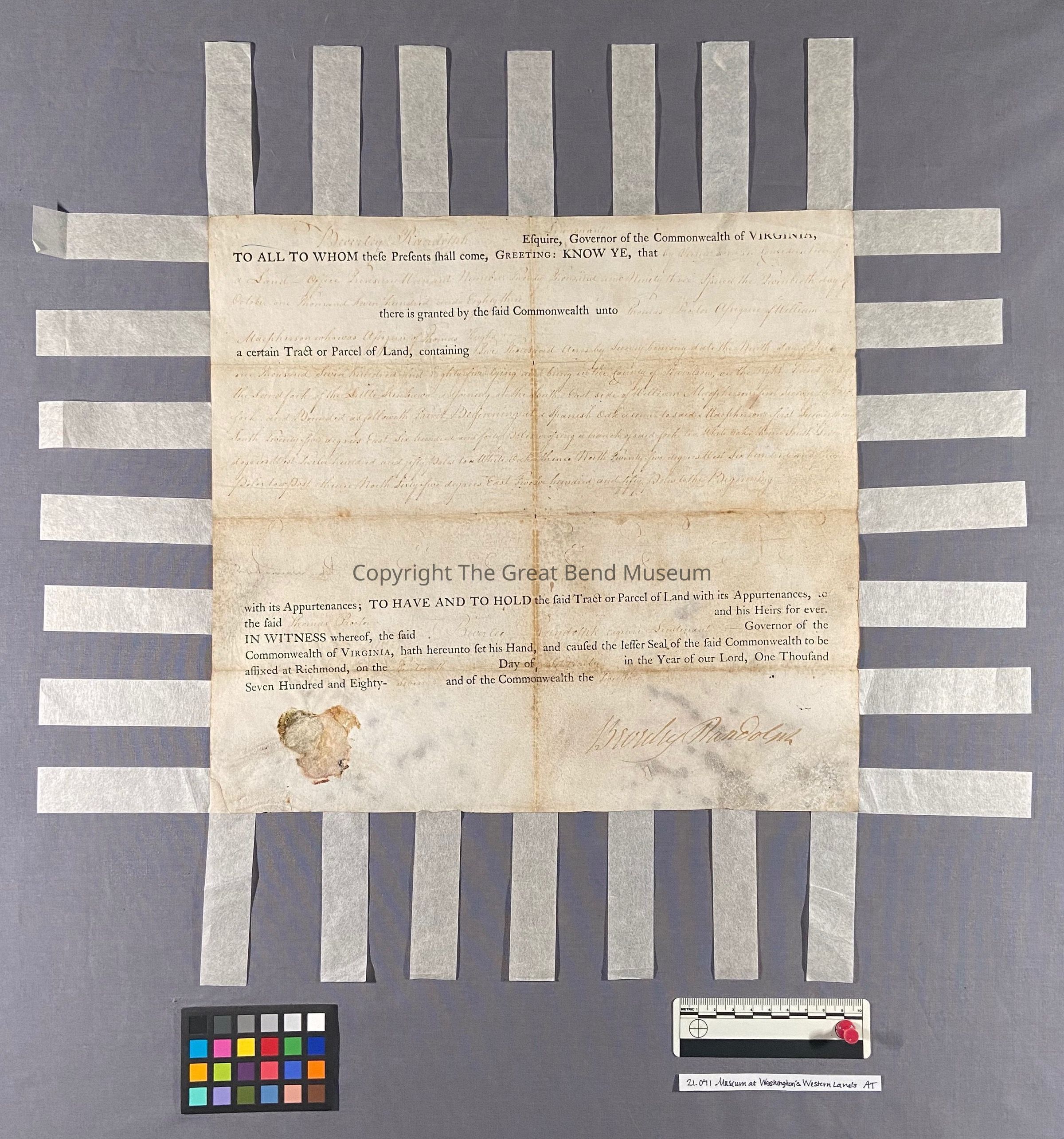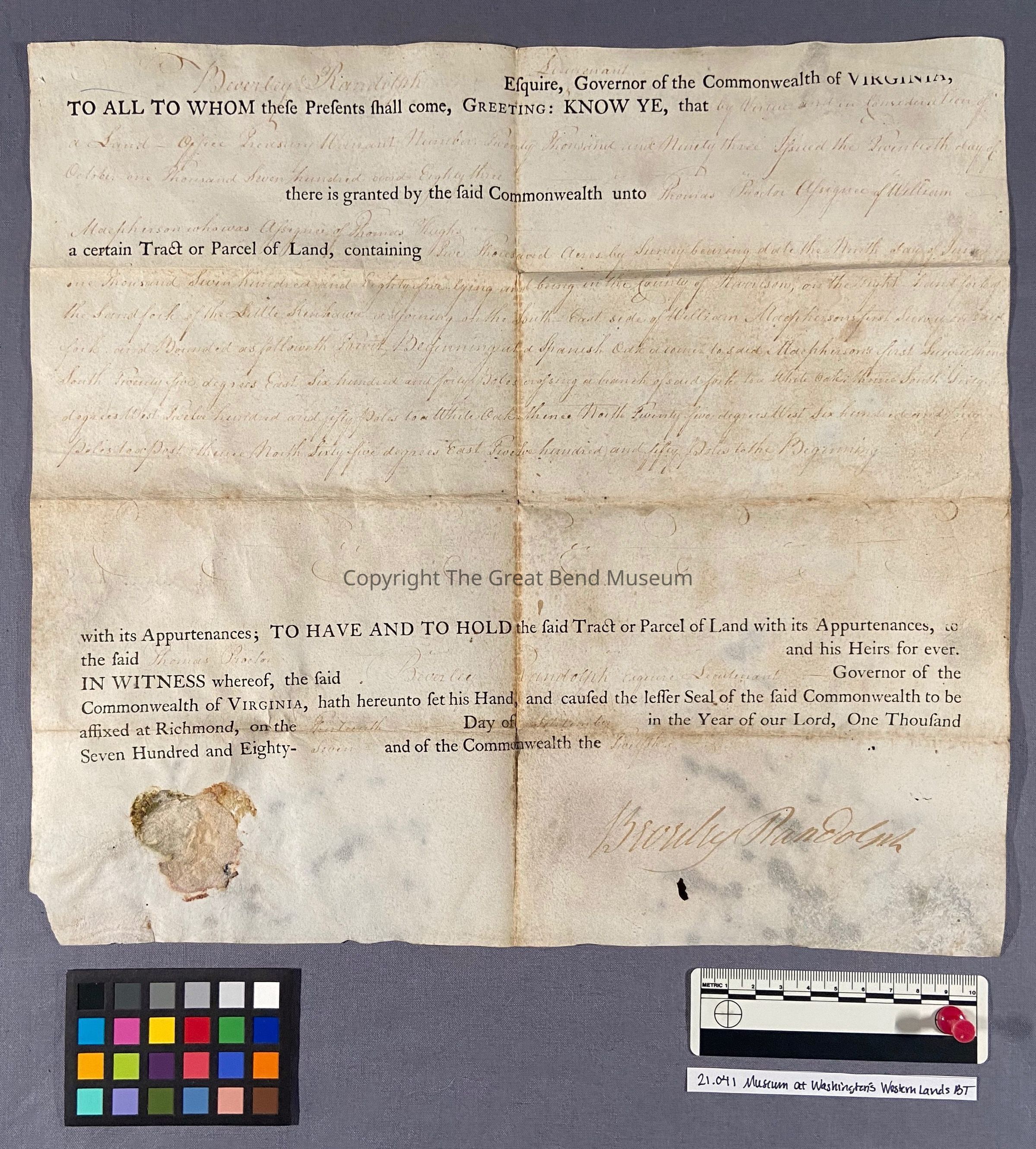 Printed on parchment, the land grant is a combination of letterpress printed form in a black, oil- based ink and manuscript handwritten in iron gall ink. There are remnants of a paper seal at the bottom left corner of the document.