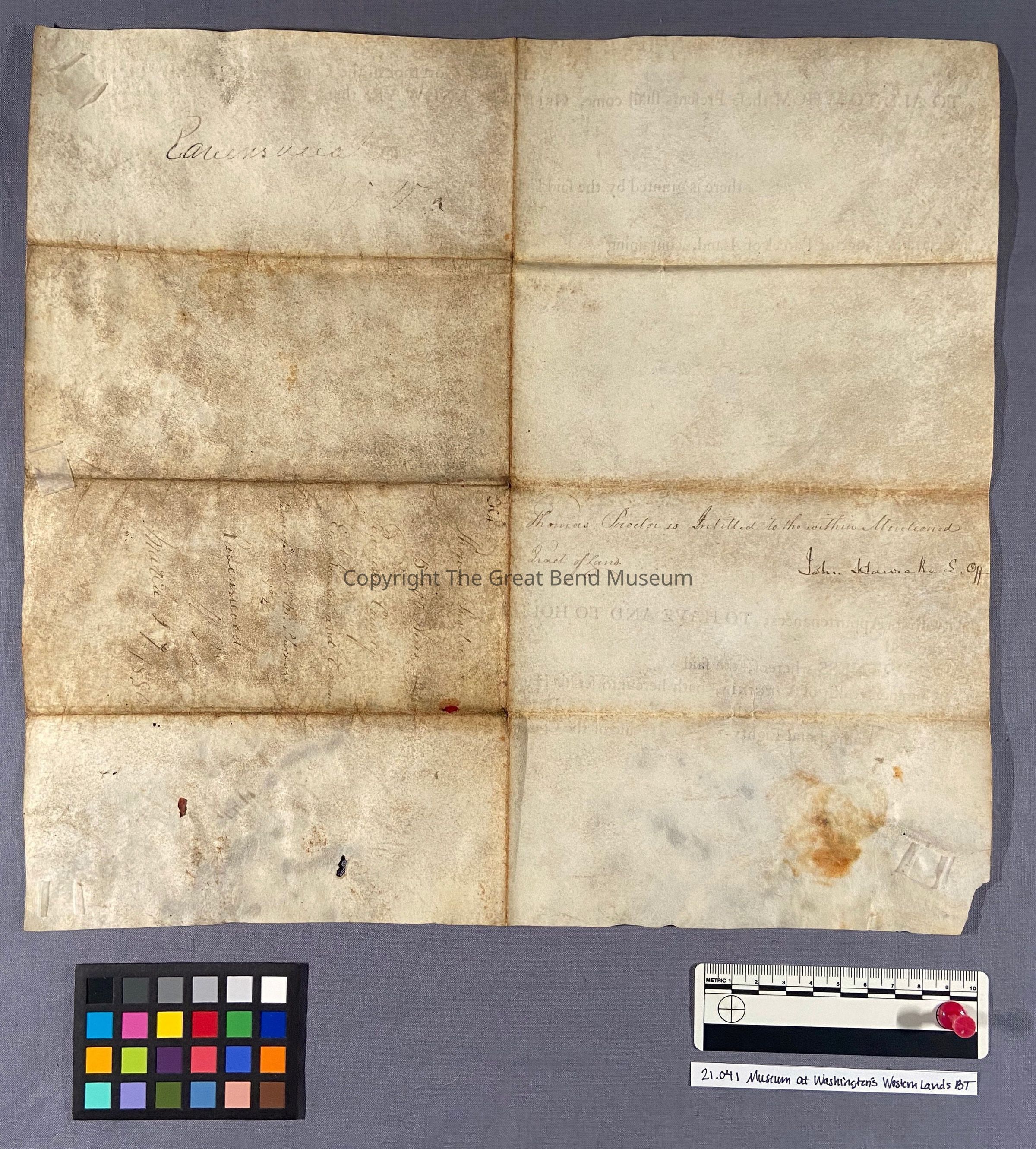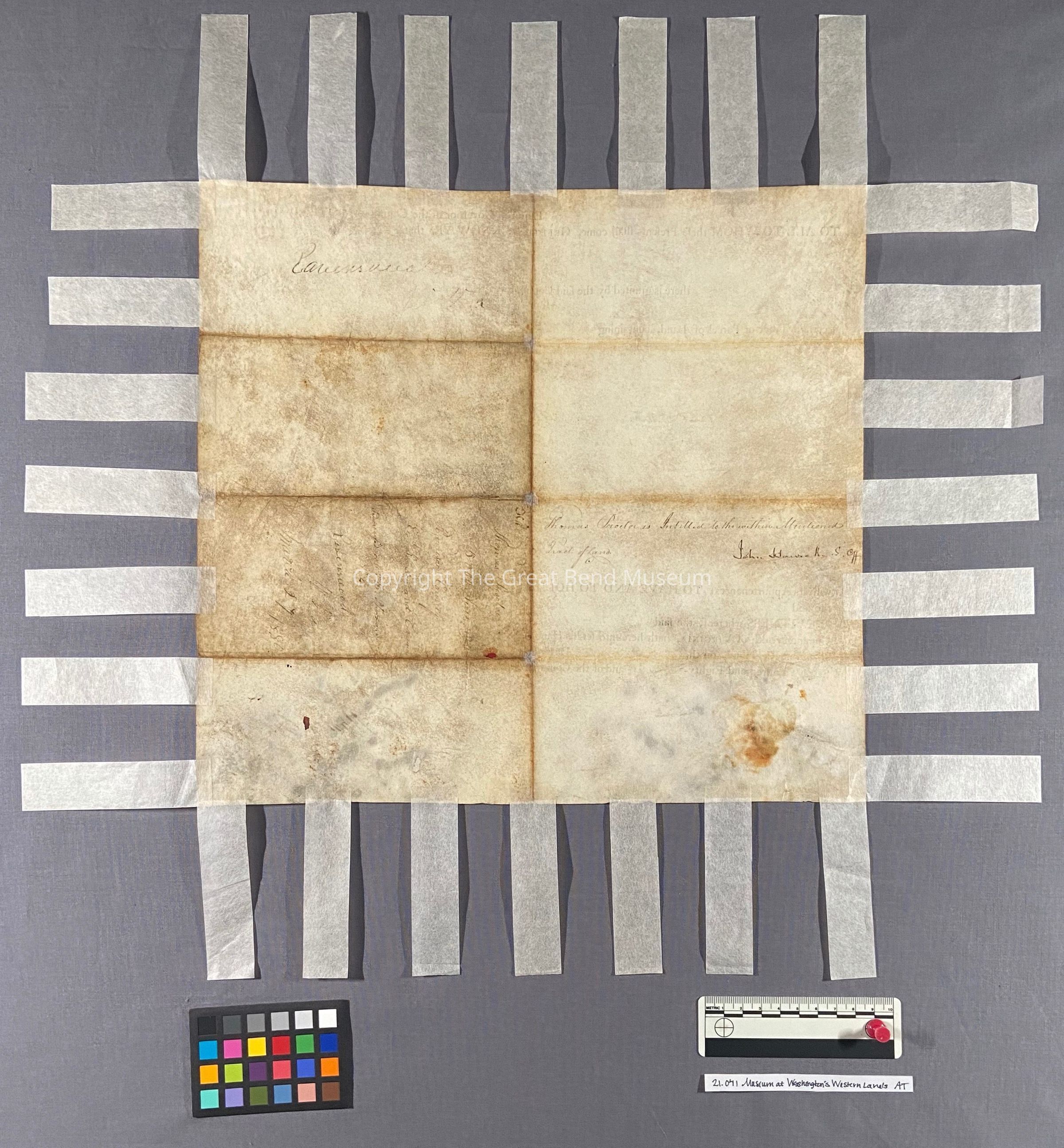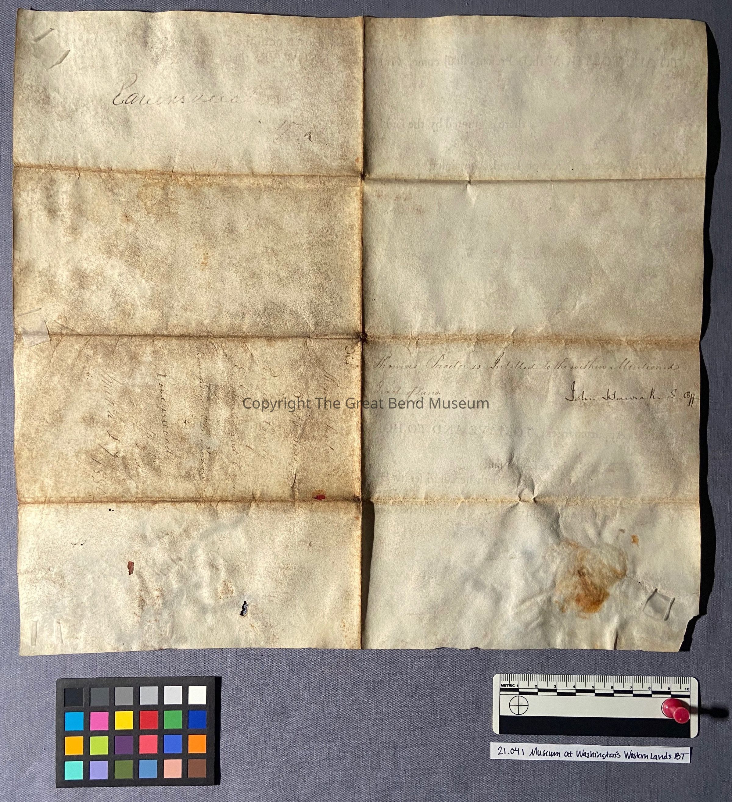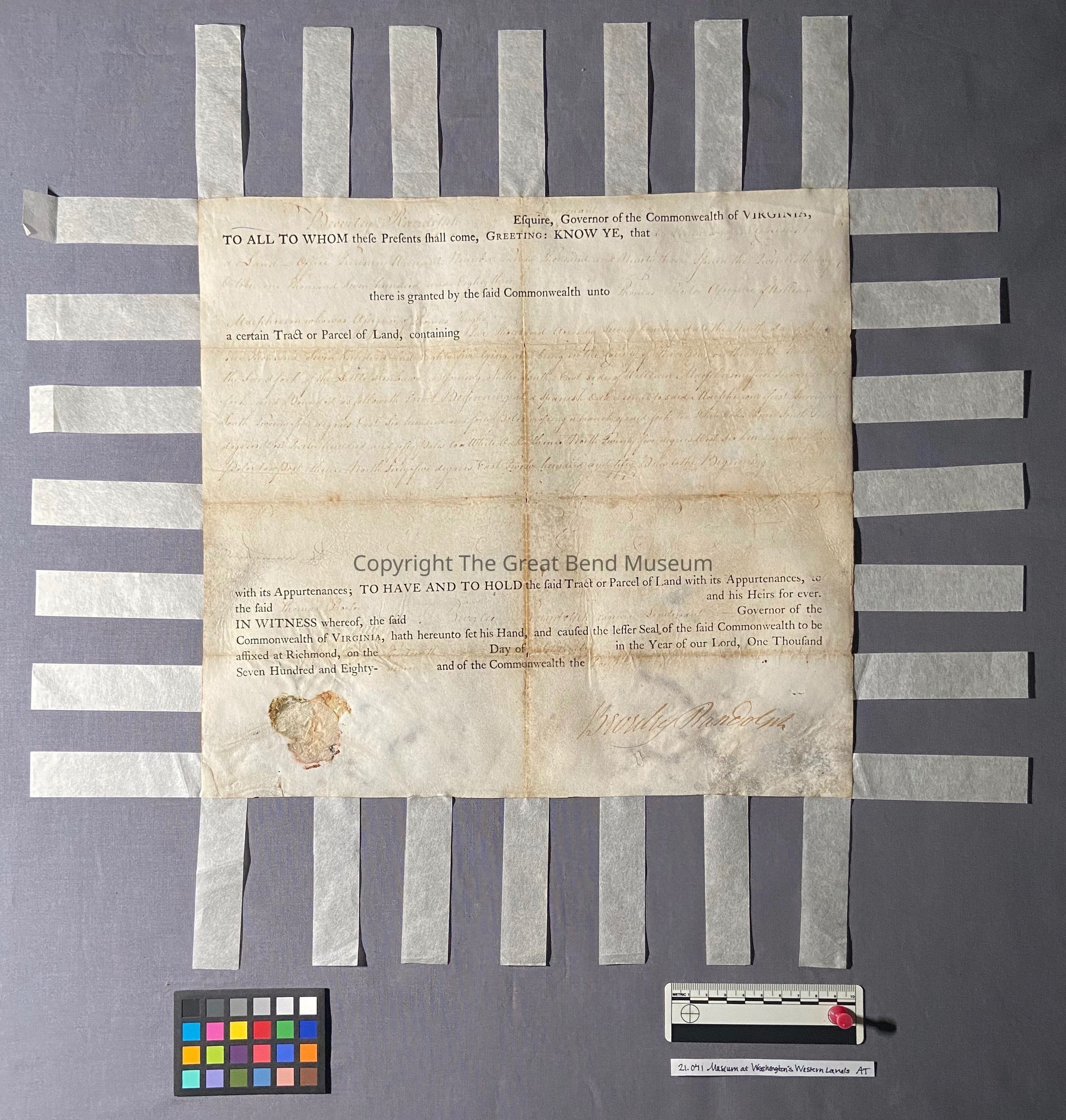 Printed on parchment, the land grant is a combination of letterpress printed form in a black, oil- based ink and manuscript handwritten in iron gall ink. There are remnants of a paper seal at the bottom left corner of the document.