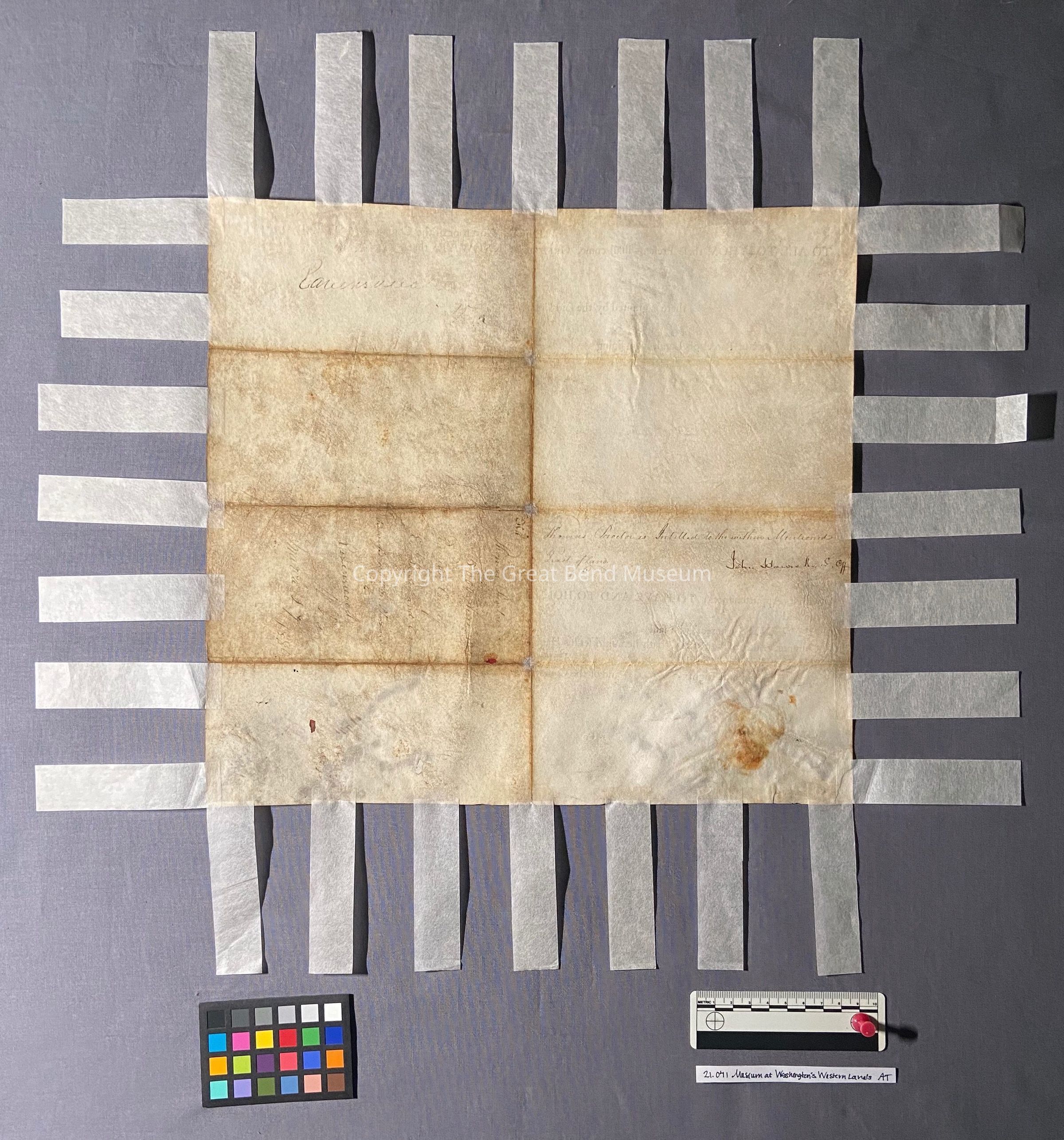 The parchment was folded multiple times: there is one central vertical fold and three evenly space horizontal folds. Apart from these folds, there are some gentle planar distortions overall and more more localized slight distortions along the lower edge of the document. The parchment is generally flexible, but the lower edge has hardened and slightly contracted, creating the distortions described above.