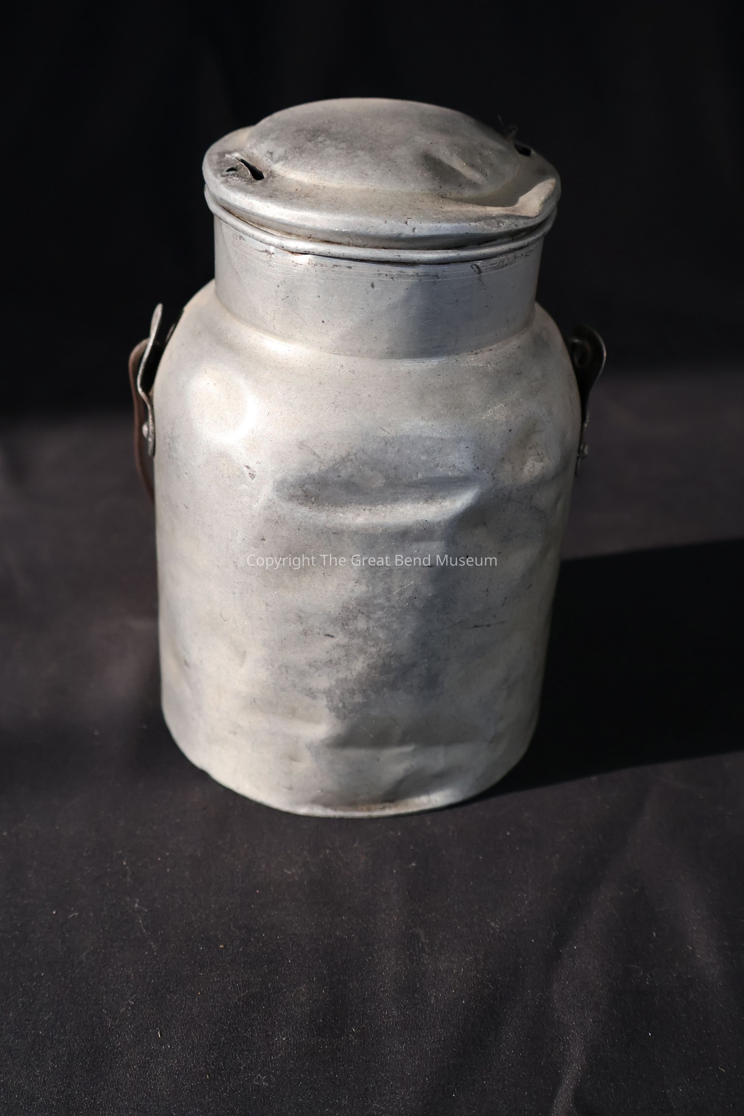 Small metal lunch container for liquids. Has a snap down lid and a handle riveted to it. Has dents from use. Has cut out on lid on both sides. handle on lid is missing. It is silver in color.Acquisition