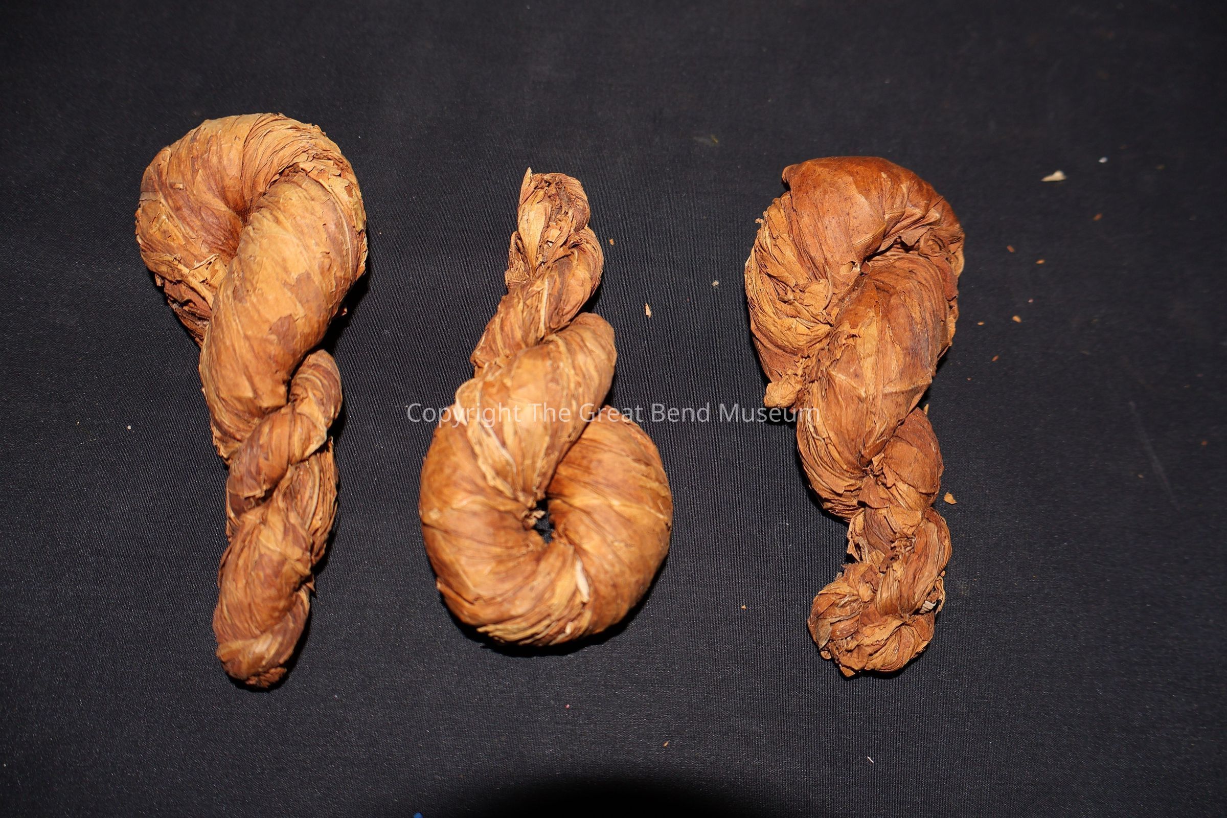 plugged tobacco chew, twisted up , looks like it braided, if you pick it up you can smell the tobacco, brown color.