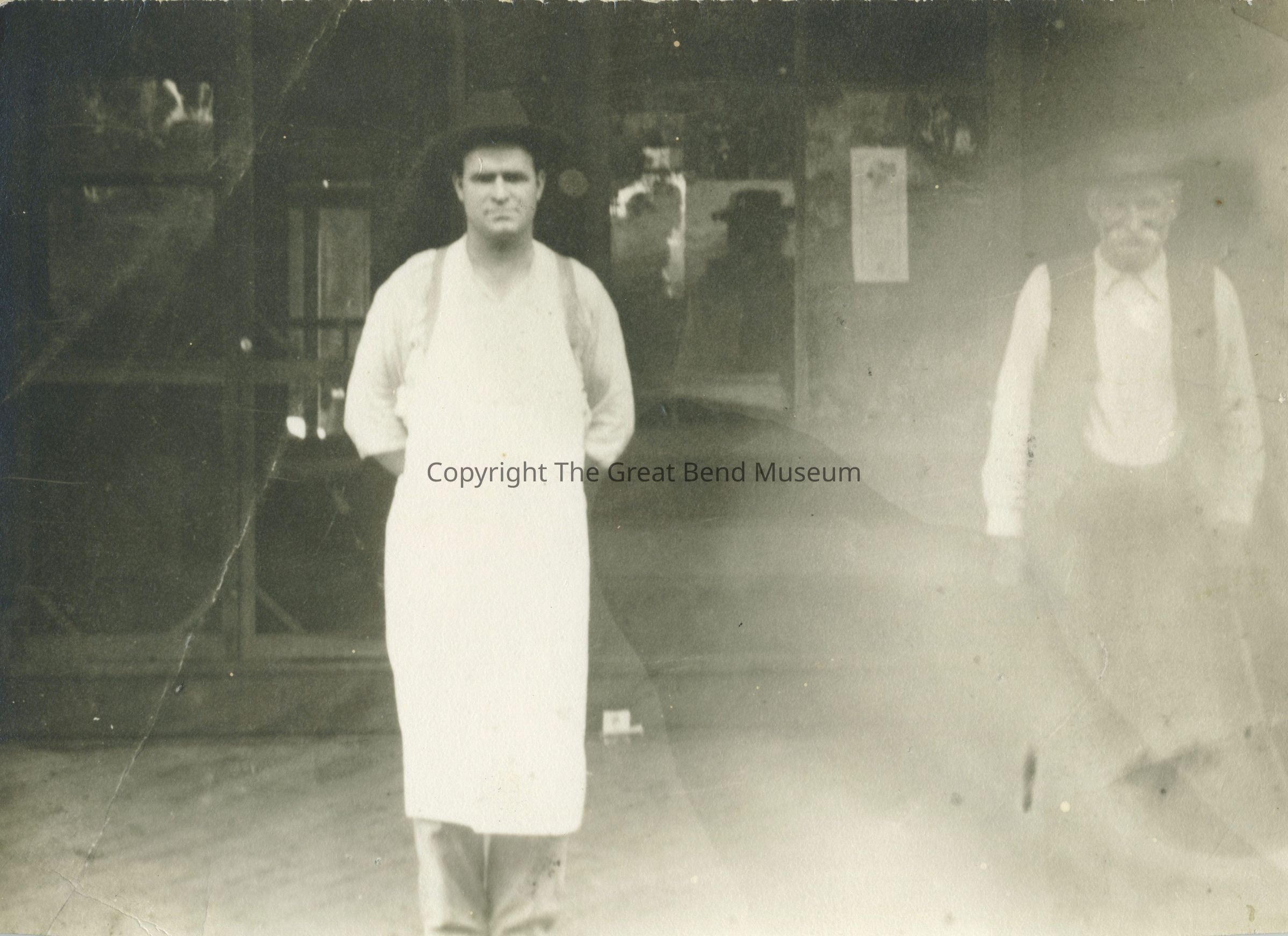 Tom Compston center in white apron, Henry Rowley right with vest and moustache. Both standing in front of darkened building, possibly garage or shop. Tom Compston was the local butcher, and Henry Rowley was mayor around that time.Photograph Details