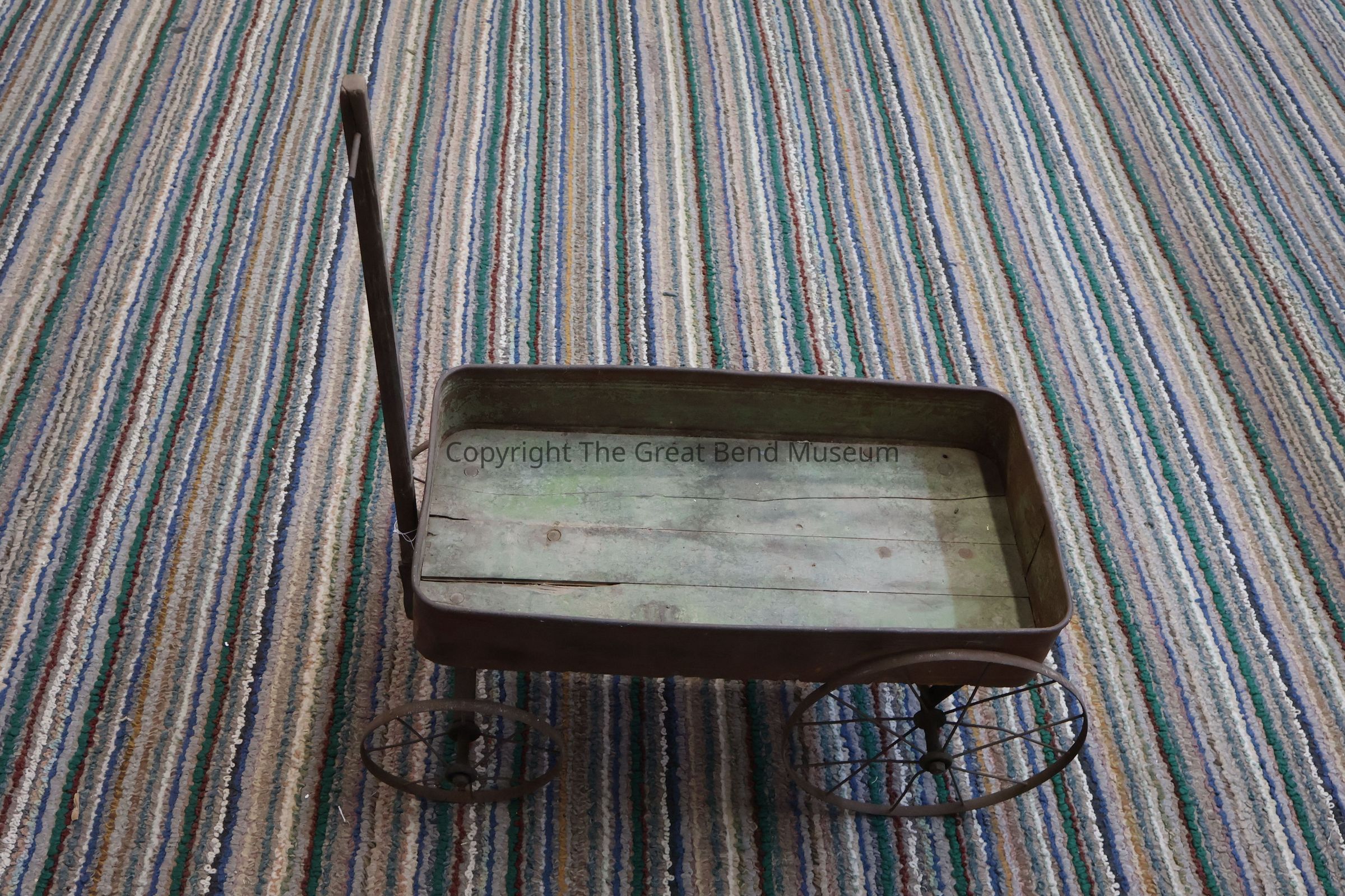 Wagon has wood bottom and pole with metal through end for a handle. The sides of wagon is made of metal There are screws through the bottom to the axe for front/back wheels, which are screwed on, The front wheels are smaller than the back. The wheels have spokes. The handle is attached to the axle, front wheels move to turn direction There is faded letters on each side that say "American Express.Acquisition