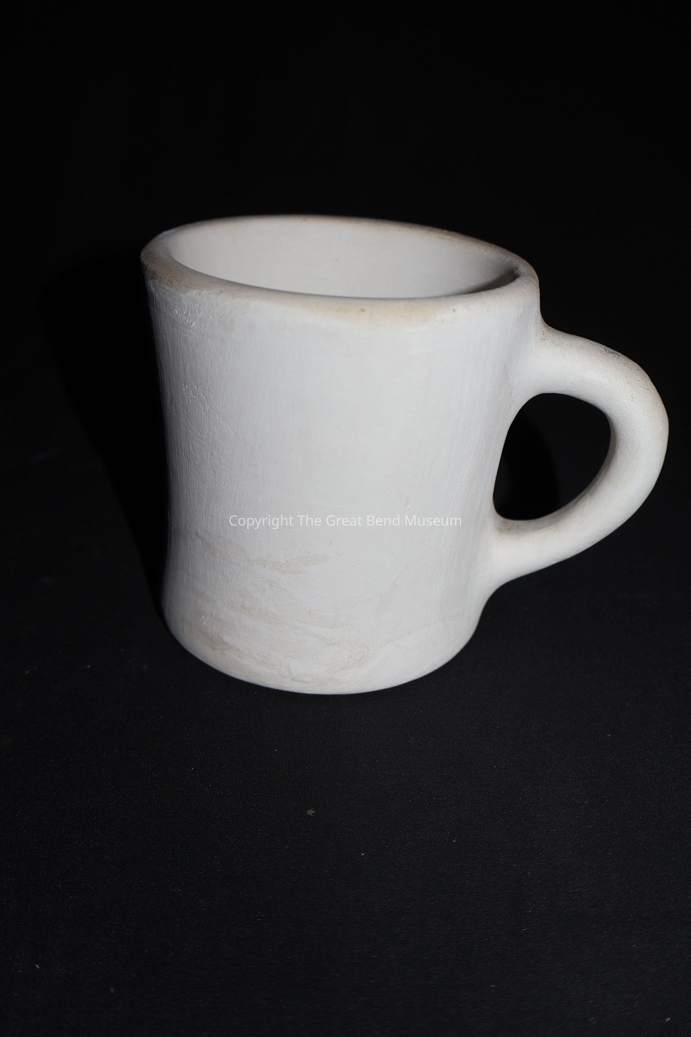 Pottery made on dish jigger- unfinished, white, cup/mug. Has a chip on outside rim. Bisque ware is fined clay that has not been glazed or re-fined. It is halfway finished.Acquisition