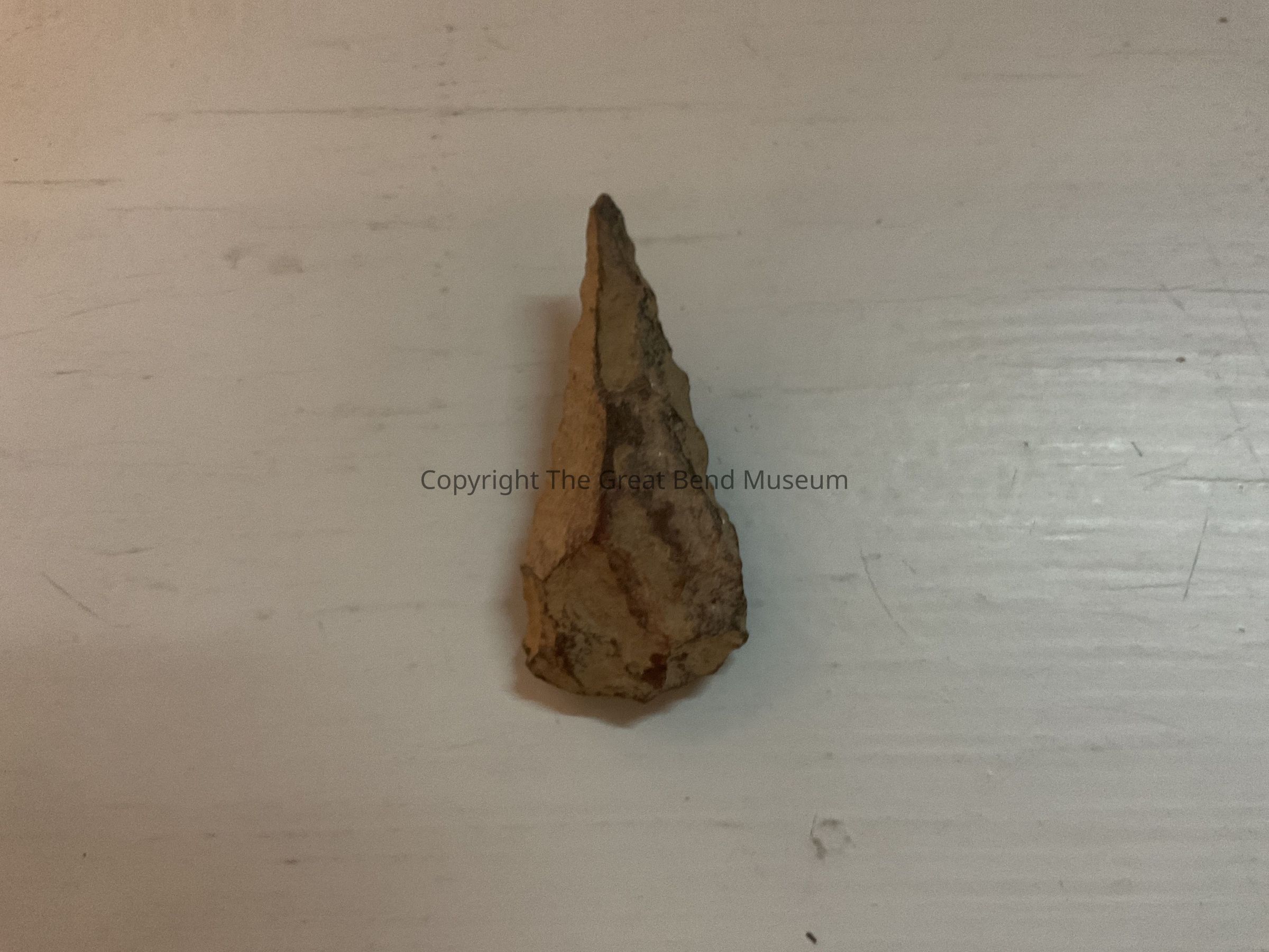 Loner, narrow point used by all prehistoric cultures for drilling holes in shells, bone or stone. Base is flared to give overall triangular shape, Thick cross section and base. Edges slightly serrated from resharpening.Acquisition