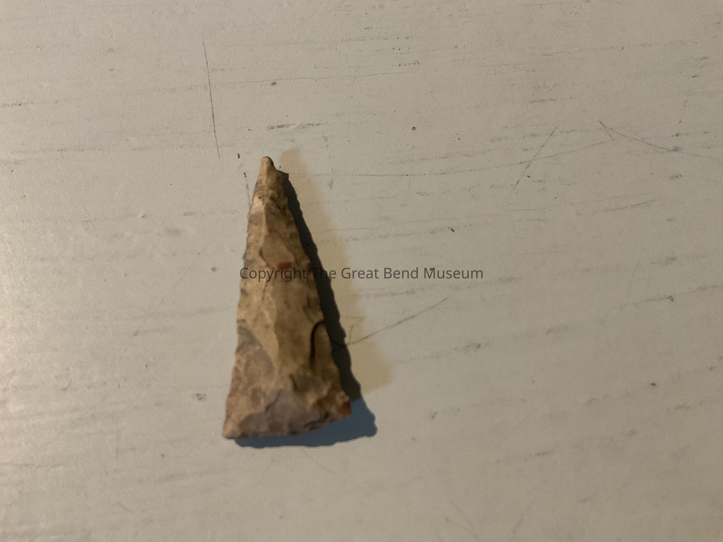 Triangular shaped drill point used for drilling holes in shell, bone, or stone. Base is flared giving its triangular shape. Has a thicker cross section. Light brown in color with gray mixed in. Edges slightly serrated from resharpening.Acquisition
