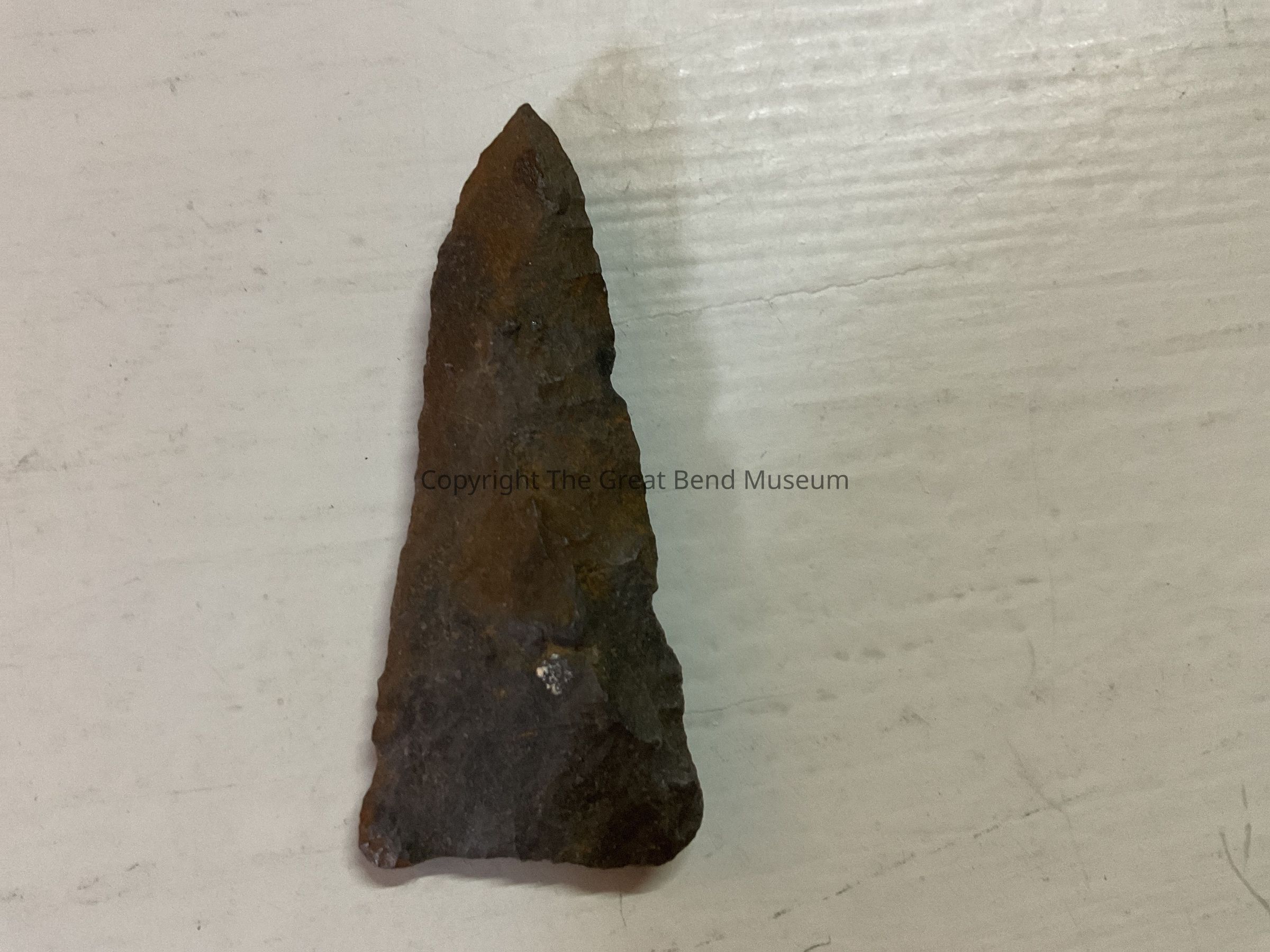 Long slender almost black point. Basal edge is straight. Shaped as an Isosceles triangle. Sides are serrated from resharpening. Blade is thickest in midsection.Acquisition