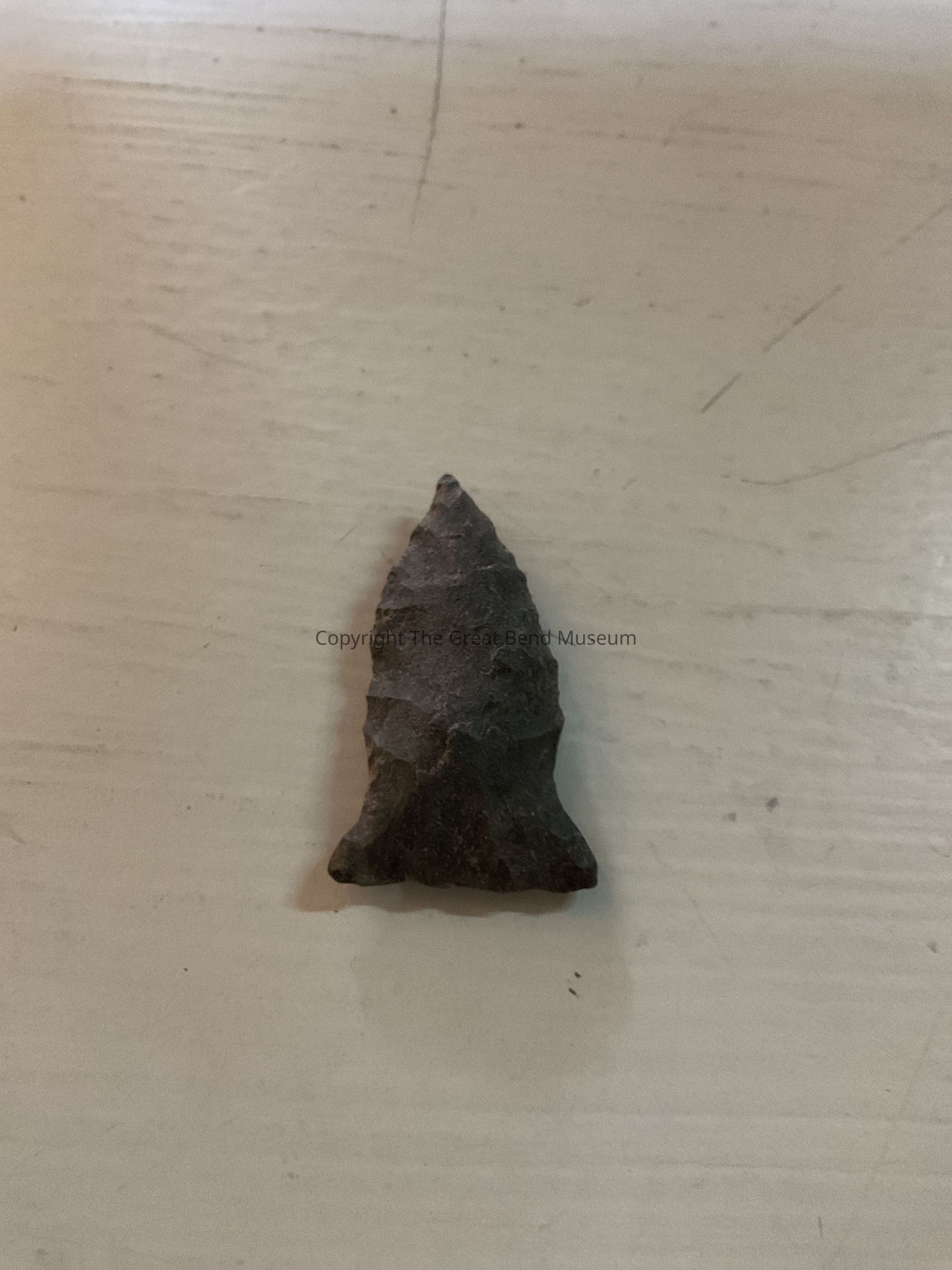 Small triangular shaped blade with serrated edges. Side notches very close to base. Base is straight and worked thin.Acquisition