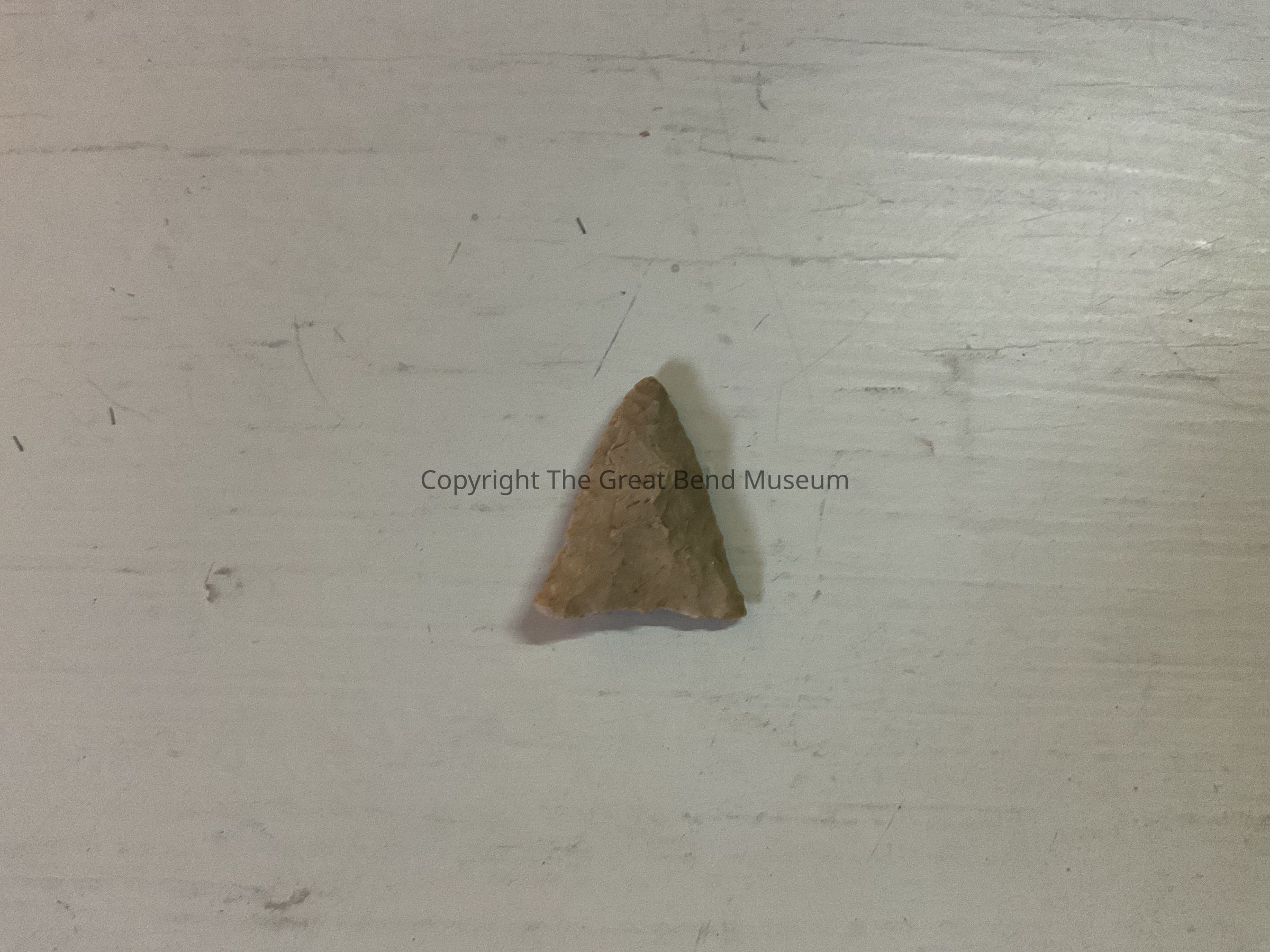 Small light brown triangular shaped point. Basal edge is straight. Sides are beveled. All points of triangle are sharply pointed.Acquisition