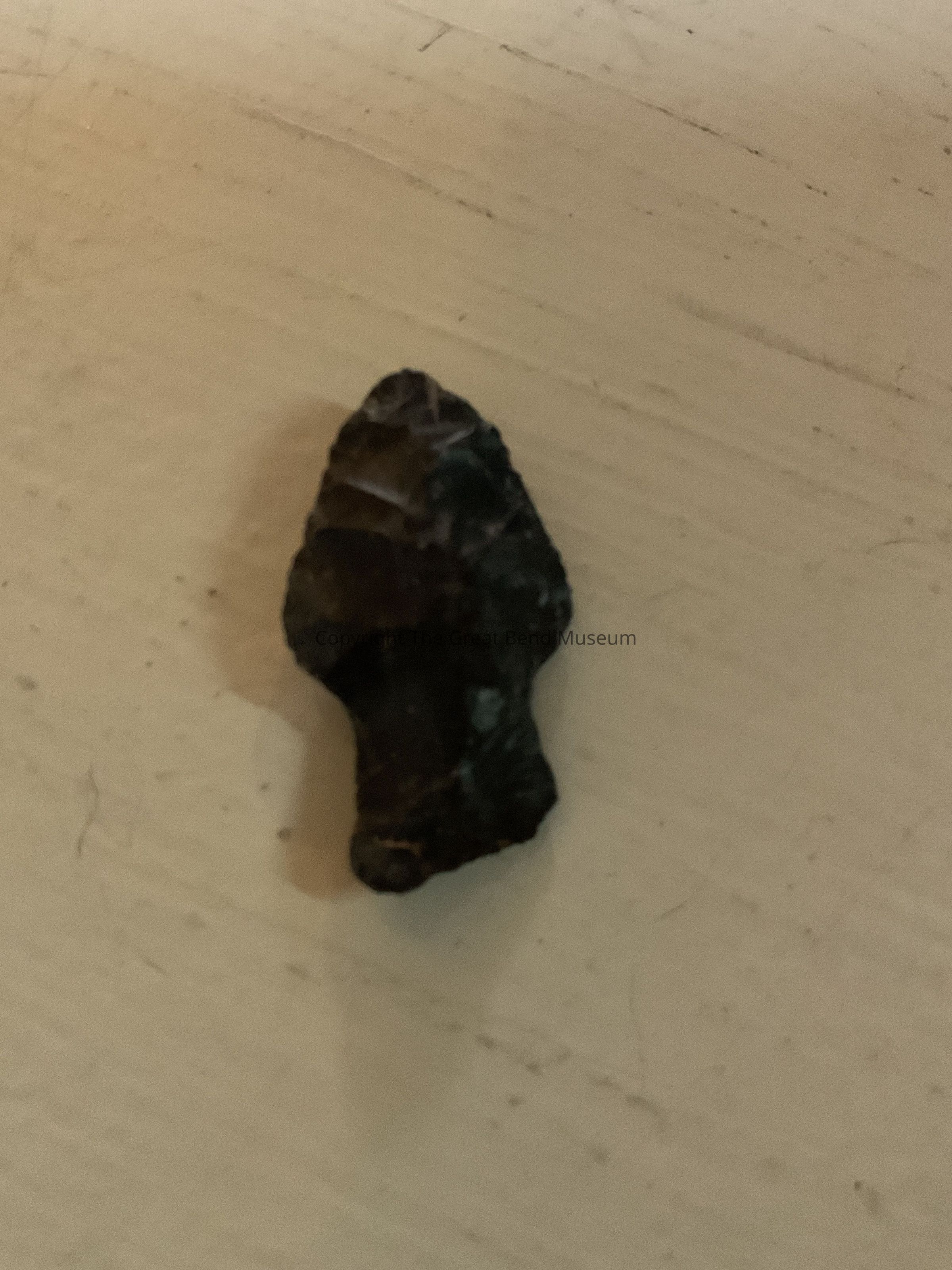 Small triangular shaped point with weak shoulders and stem. Almost black in color. Has asymmetrical base, one side longer.Acquisition