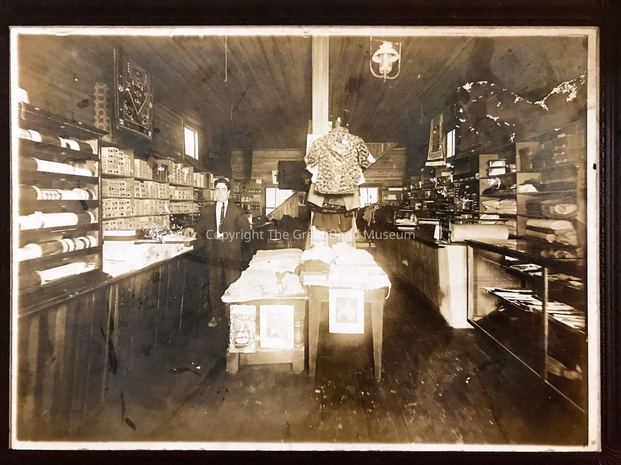 Photo of unidentified store, possibly Hunt's in Cottageville. Fabric, ribbons, rugs, clothes, etc. Man in photo (?) in suit and tie. Light hanging from ceiling, Shelves, display cabinet, tables.