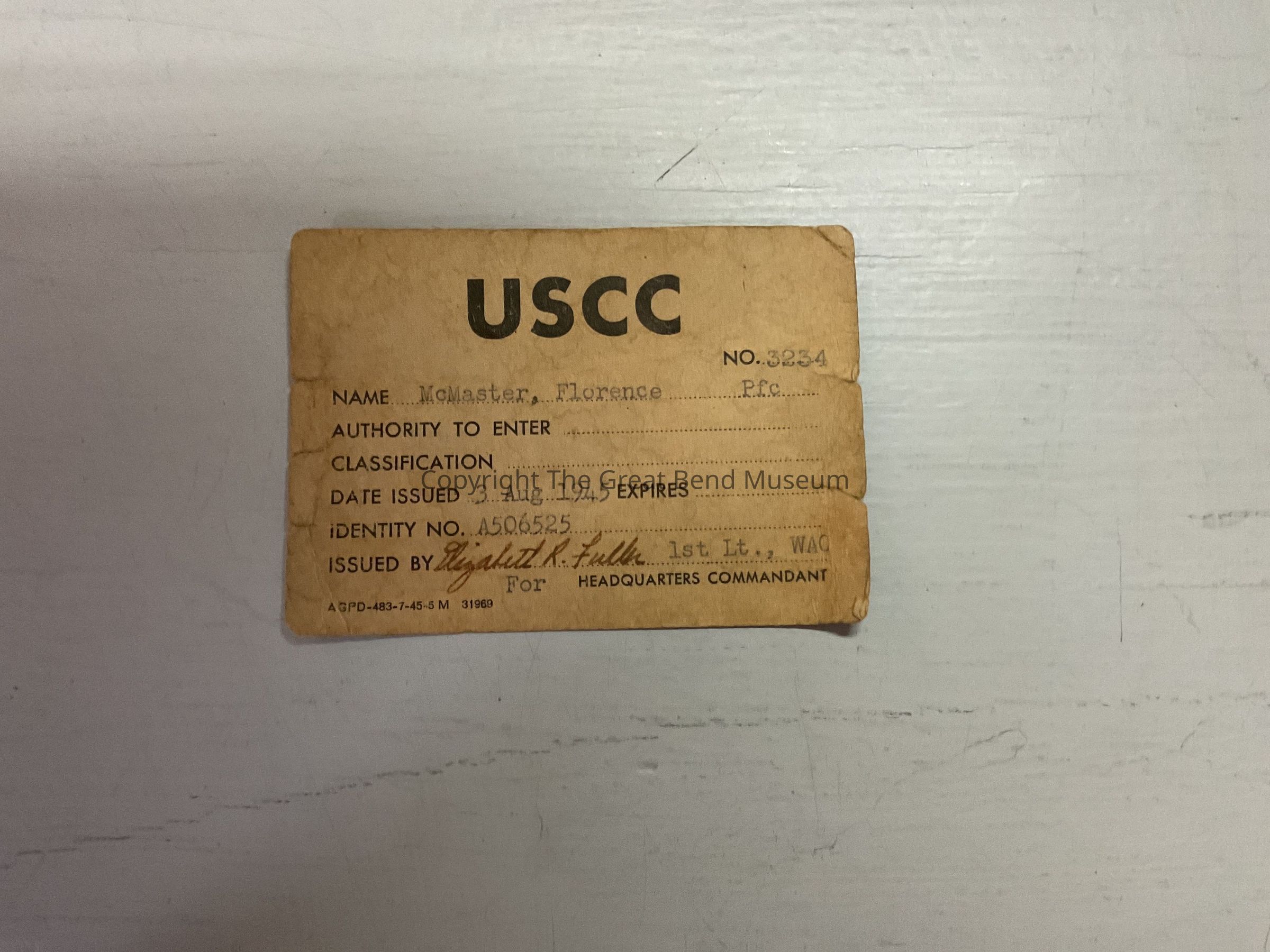 USCC pass to be let in building or base - to Florence McMasters PFC #3234 - issued by Elizabeth R. Fuller, 1st Lt. WAC. McMaster's signature is on reverse of card. USCC.Acquisition