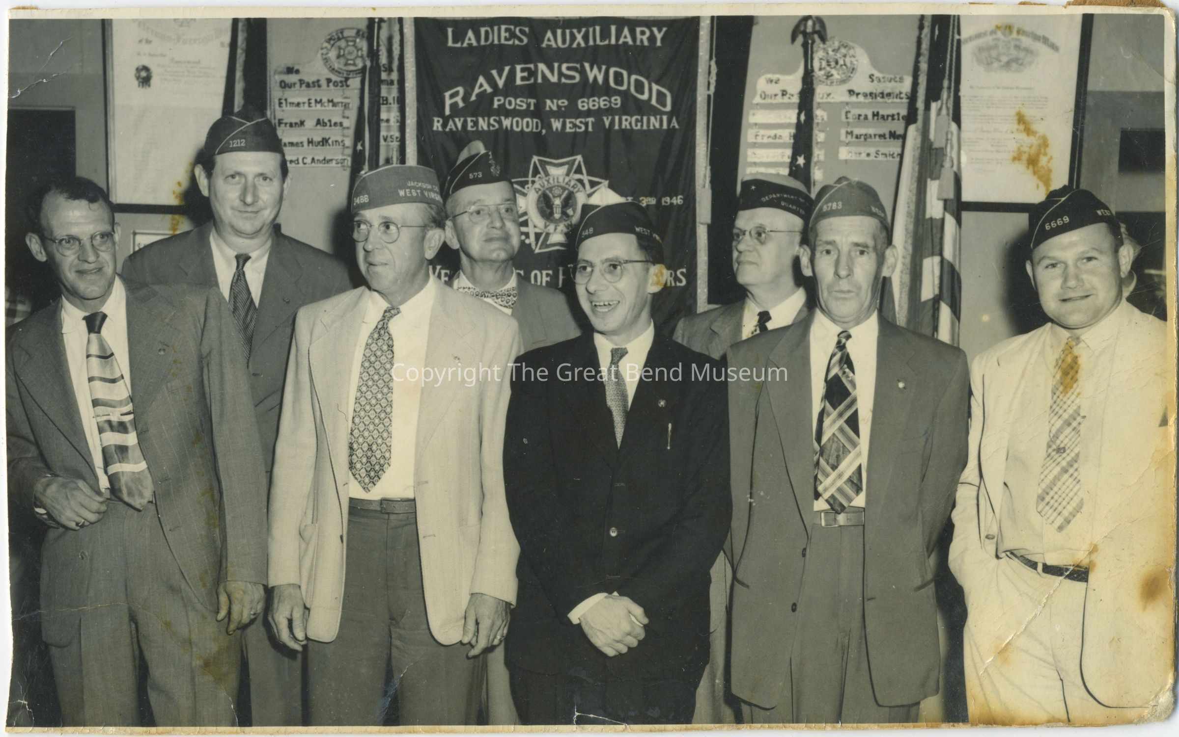 Photo of 8 men standing in front of Ladies Auxiliary - Ravenswood, Post number 6669, Ravenswood WV Sign. Men are wearing military hats from VFW? Plaques on the wall behind them - not legibleAcquisition