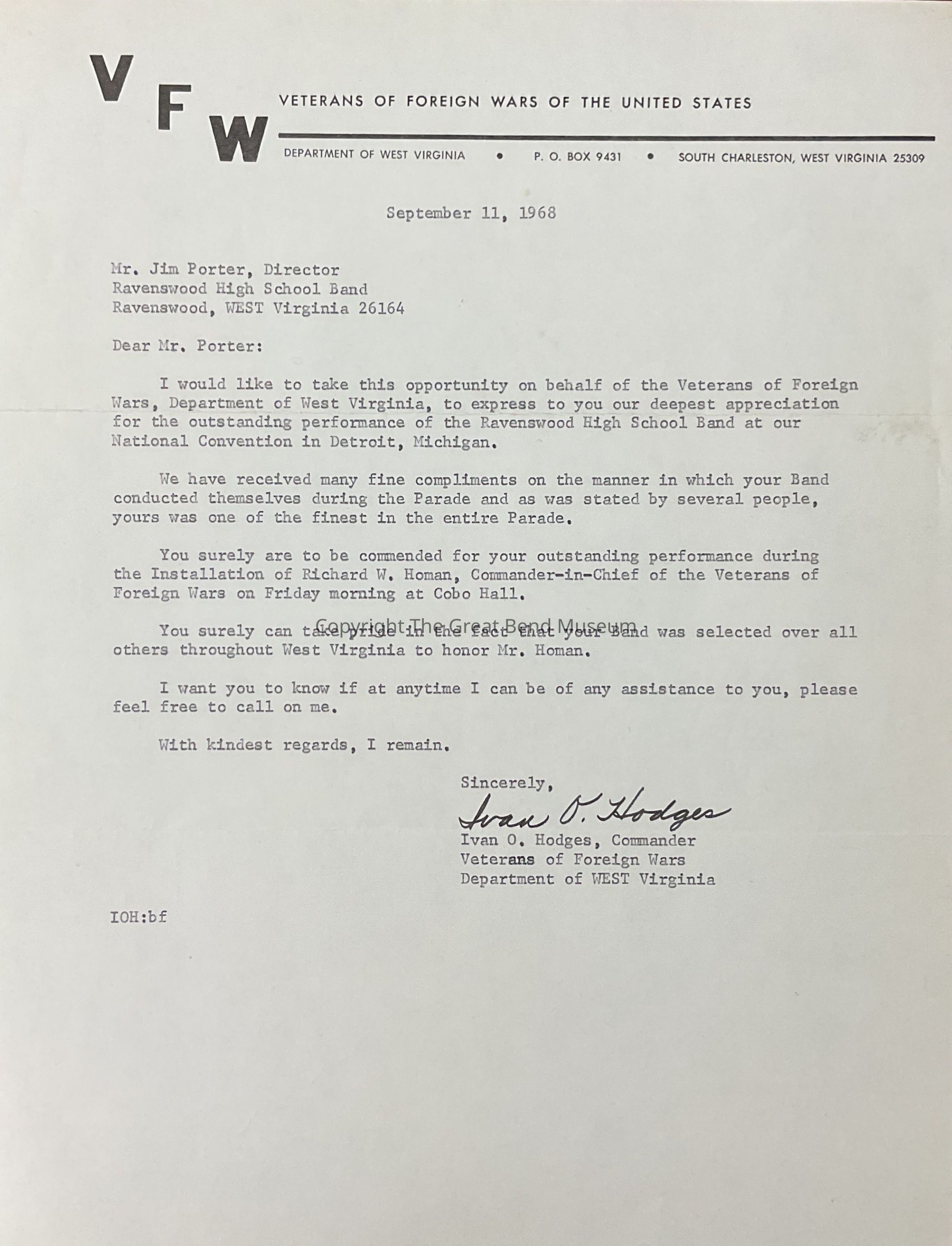 Ravenswood VFW letter to Jim Porter regarding RHS bands outstanding performance at National VFW Convention - September 11, 1968Acquisition