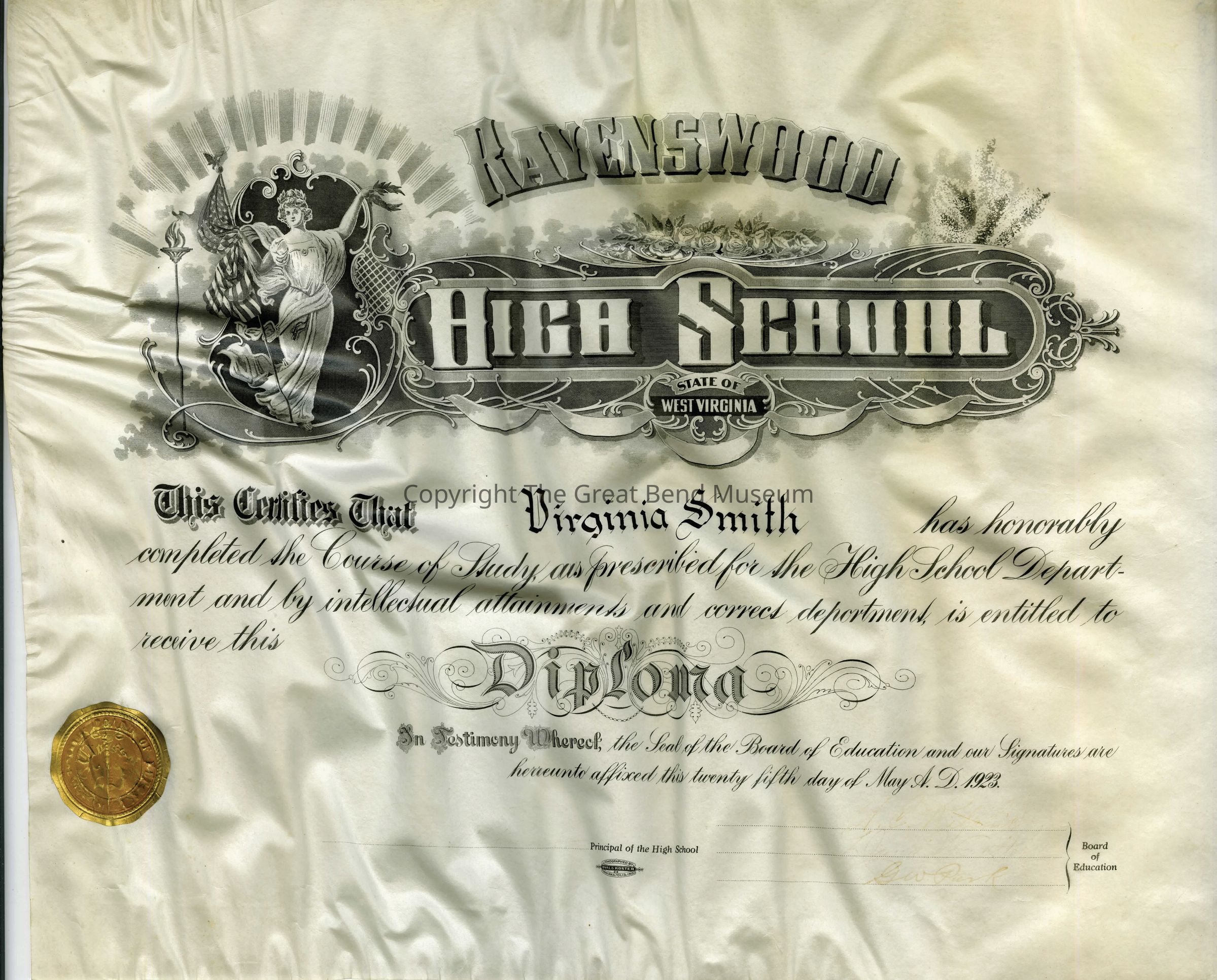 Ravenswood High School Diploma - State of WV - Virginia Smith, 5/5/1923. Signed by: Board of Education members - G.W. Pack, ____(?), ______(?) - Principal of High School ___(?); Gold Seal - Class 23 (in middle)