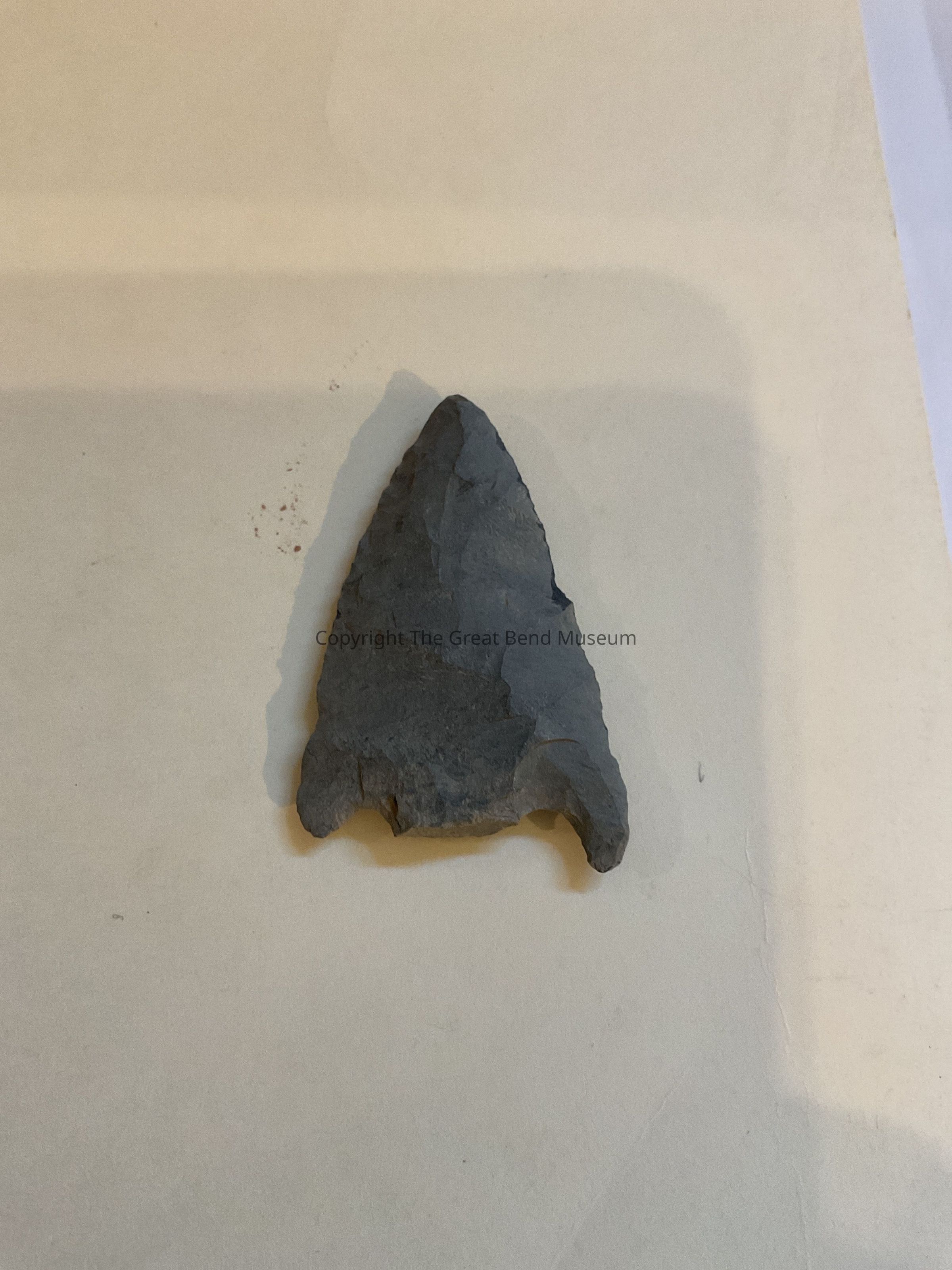 Larger point Medium gray thicker in middle of blade. Shoulders are prominent with barbs, with very minimal stem. Large equilateral shaped triangle with straight sides. Basal edge of stem is not worked.Acquisition