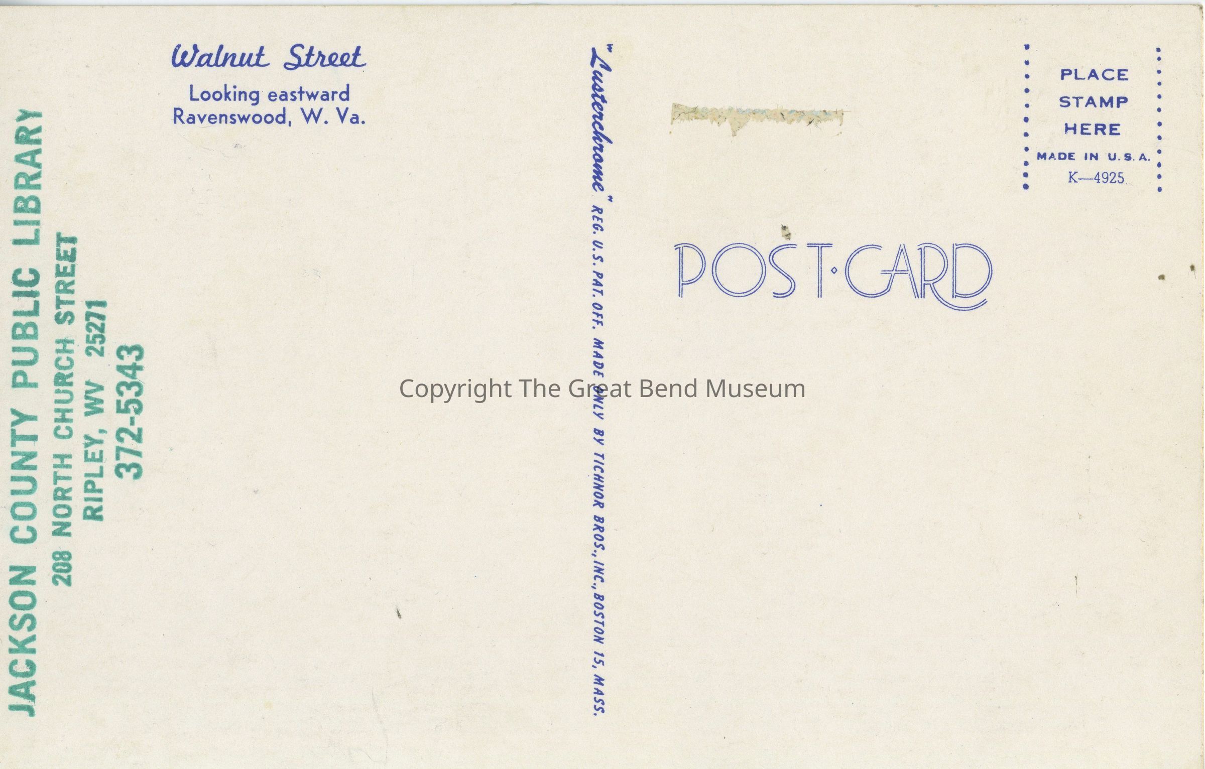 Color photo postcard intersection of Washington St and Walnut St at stoplight. Gray car turning onto Walnut; lady with mechanical lawn mower crossing street. Almeda's on left; Hardware on right, brick buildings. Back: Stamped green ink "Jackson County Public Library 208 North Church Street, Ripley, WV 25271, 372-5343" - Walnut Street looking eastward Ravenswood, W.Va.