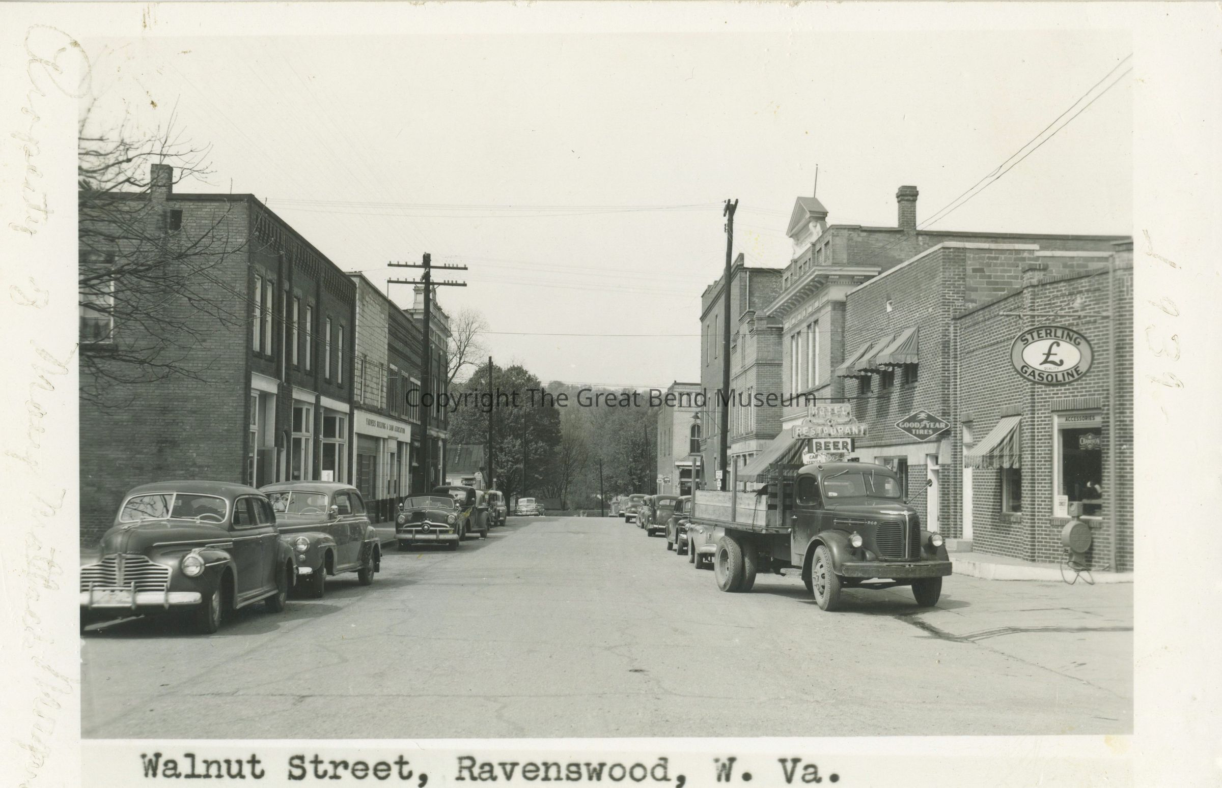 B/W Picture Postcard -- white border "Walnut Street, Ravenswood, W. Va." (ink faded - written at either end => "1939" (right end); "Property of Mary Mattack Morgan" (left end). Cars parked both sides of street -- cars facing away from Washington St (River). Photo taken facing river Walnut/Washington at intersection Walnut/Virginia. Sterling Gas, Goodyear tires, Kodak Paper, place stamp here on back.Acquisition