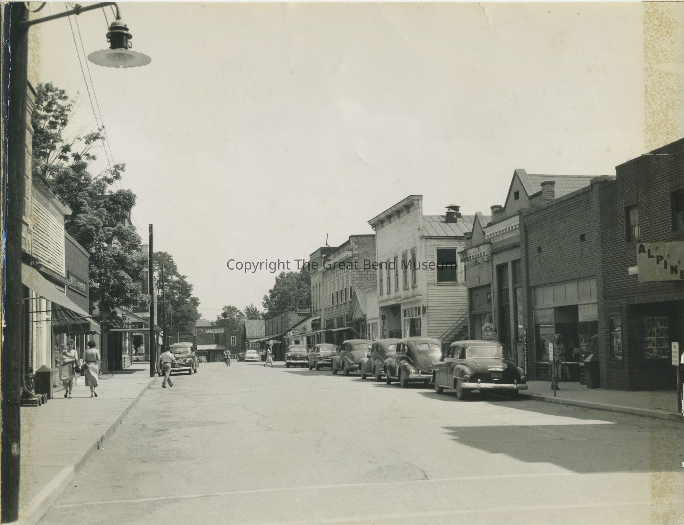 B/W (sepia) photo - no border - Washington St early 1950's - light pole; 2 ladies walking (L); gentleman crossing street L to R; old cars parked on street; Alpine theater right side (appears to be facing Walnut St intersection)Acquisition