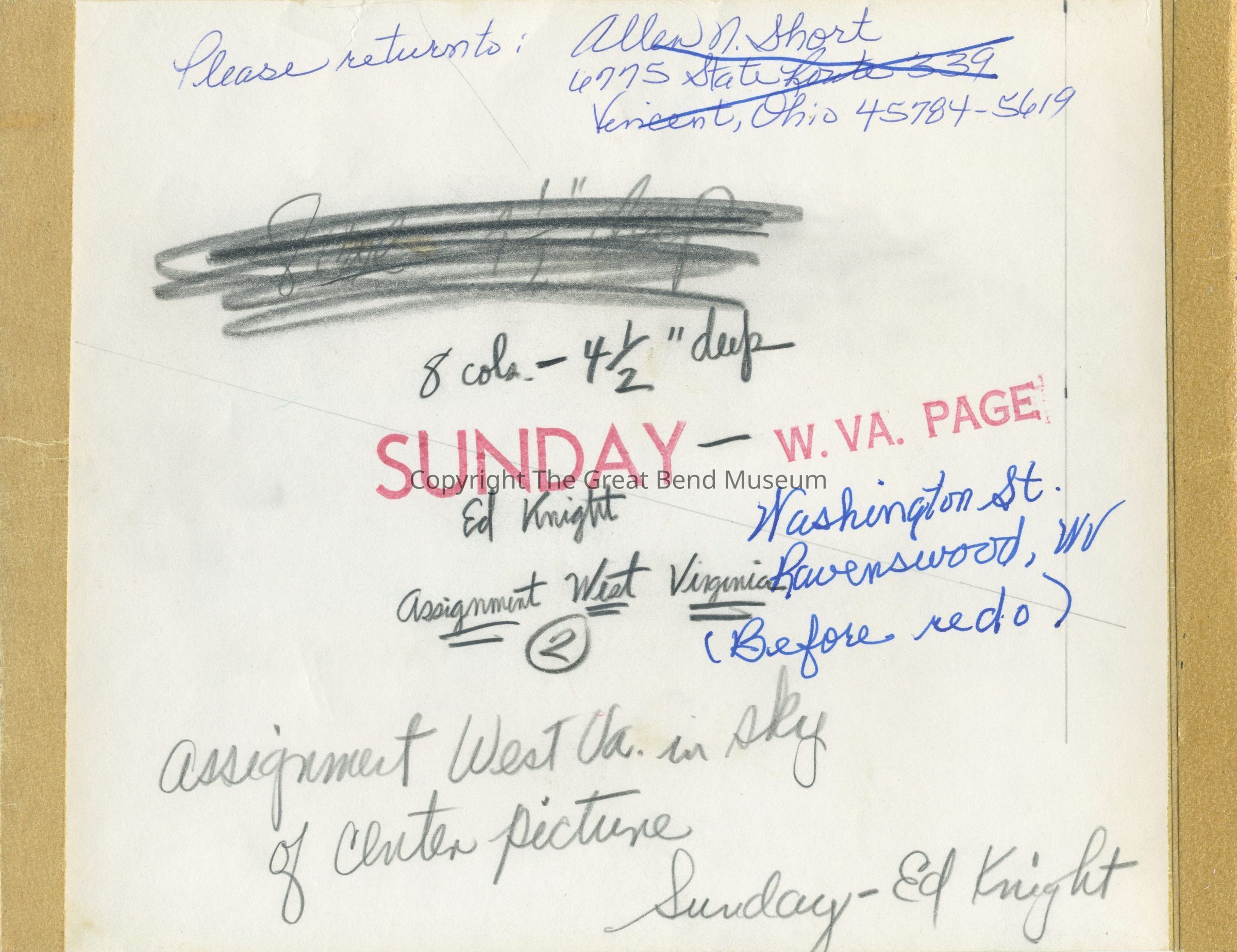 Please return to Allen N. Short, 6775 State Route 339, Vincent Ohio 45784 - 5619 (marked out). 8 co/R - 4-1/2" deep Ed Knight assignment West Virginia. (2) Assignment West Virginia in sky of center picture. Sunday - Ed Knight, Washington St., Ravenswood (before redo)Material/Technique