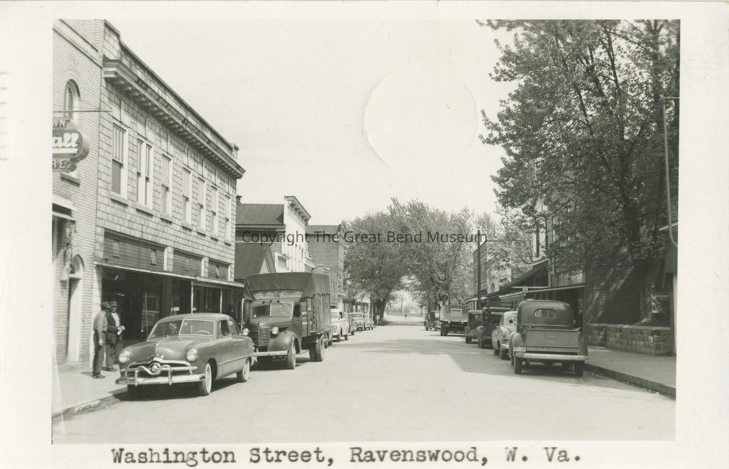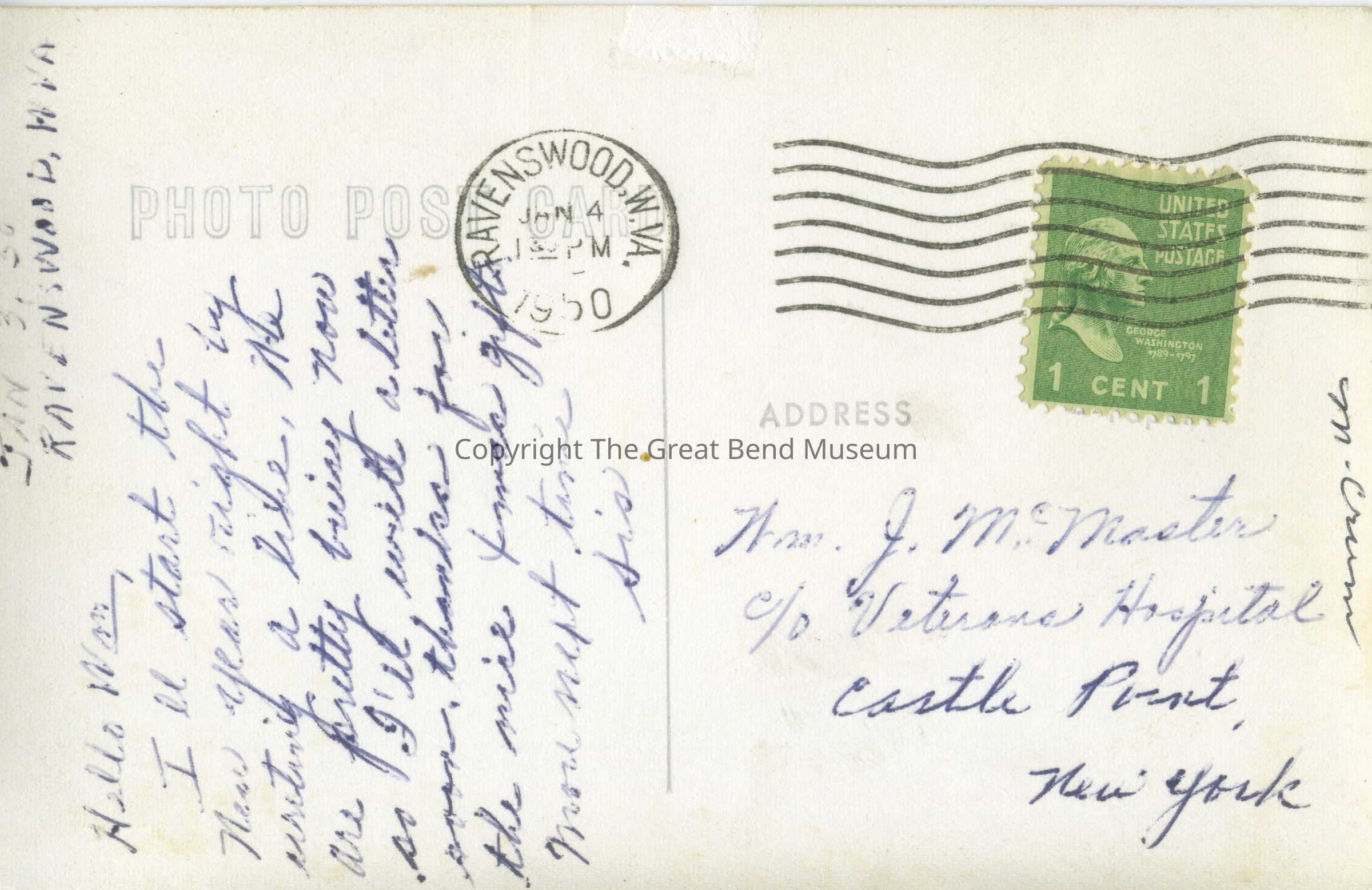 B/W Photo postcard of Washington Street, Ravenswood, WV (Typewriter script on card lower border) Used postcard. Rexall Drug Store sign and 2 men left side photo; cars parked both sides. Taken in street facing north through town. On back: Sent to: "Wm. J McMaster C/o Veterans Hospital, Castle Point, New York" Corresp = "Jan 3, 50, Ravenswood, WV: Hello Wm, I'll start the New Year right by writing a line. We are pretty busy now so I'll write a letter soon, Thanks for nice xmas gift. More next time. STS"