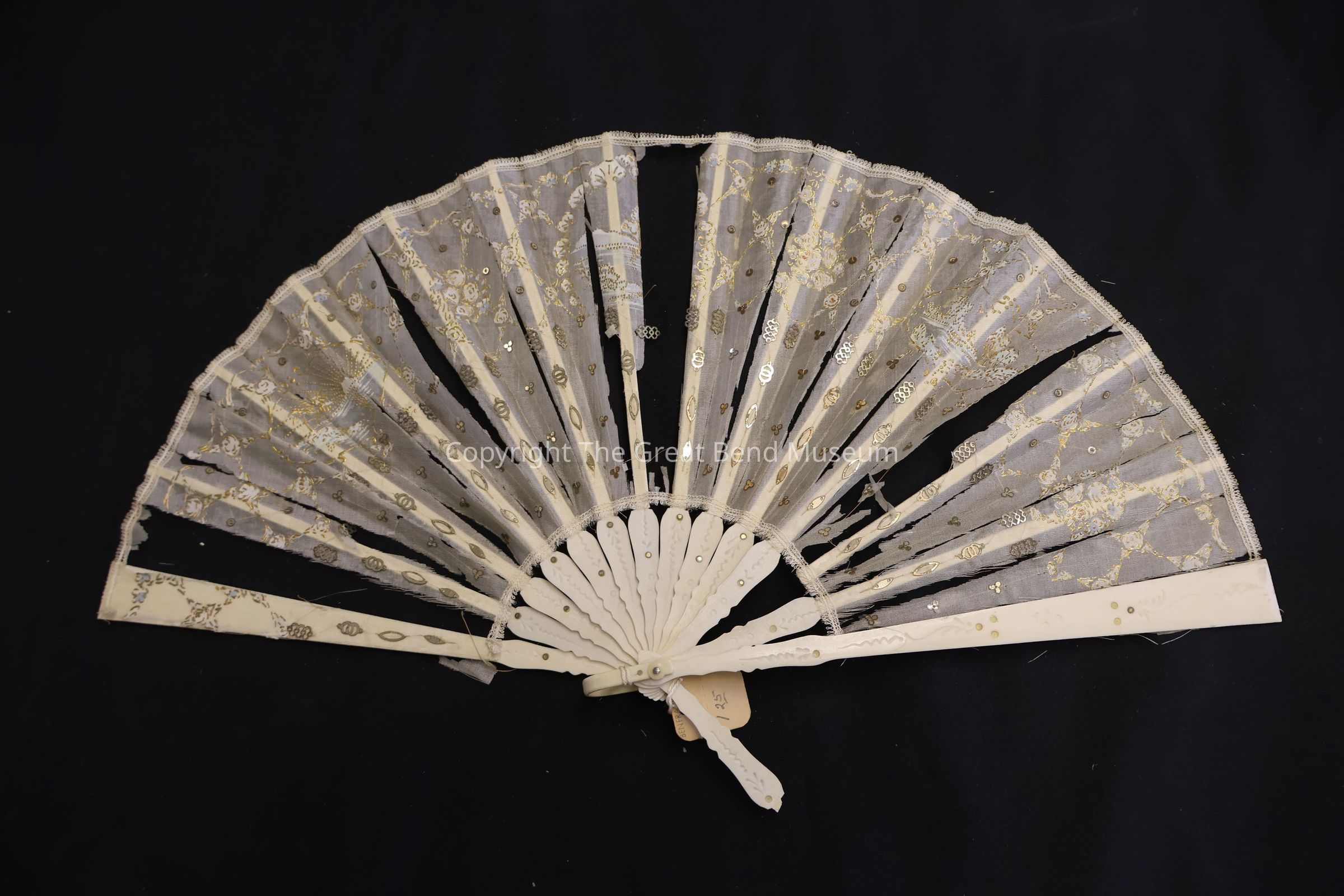 Wedding fan of Mary Thomas Fowler, daughter of the Mayor of St. Louis. She married Robert Fowler on April 24, 1872; white lace fan - decorated with sequins, plastic holder - white, with flower engravings on the plastic.