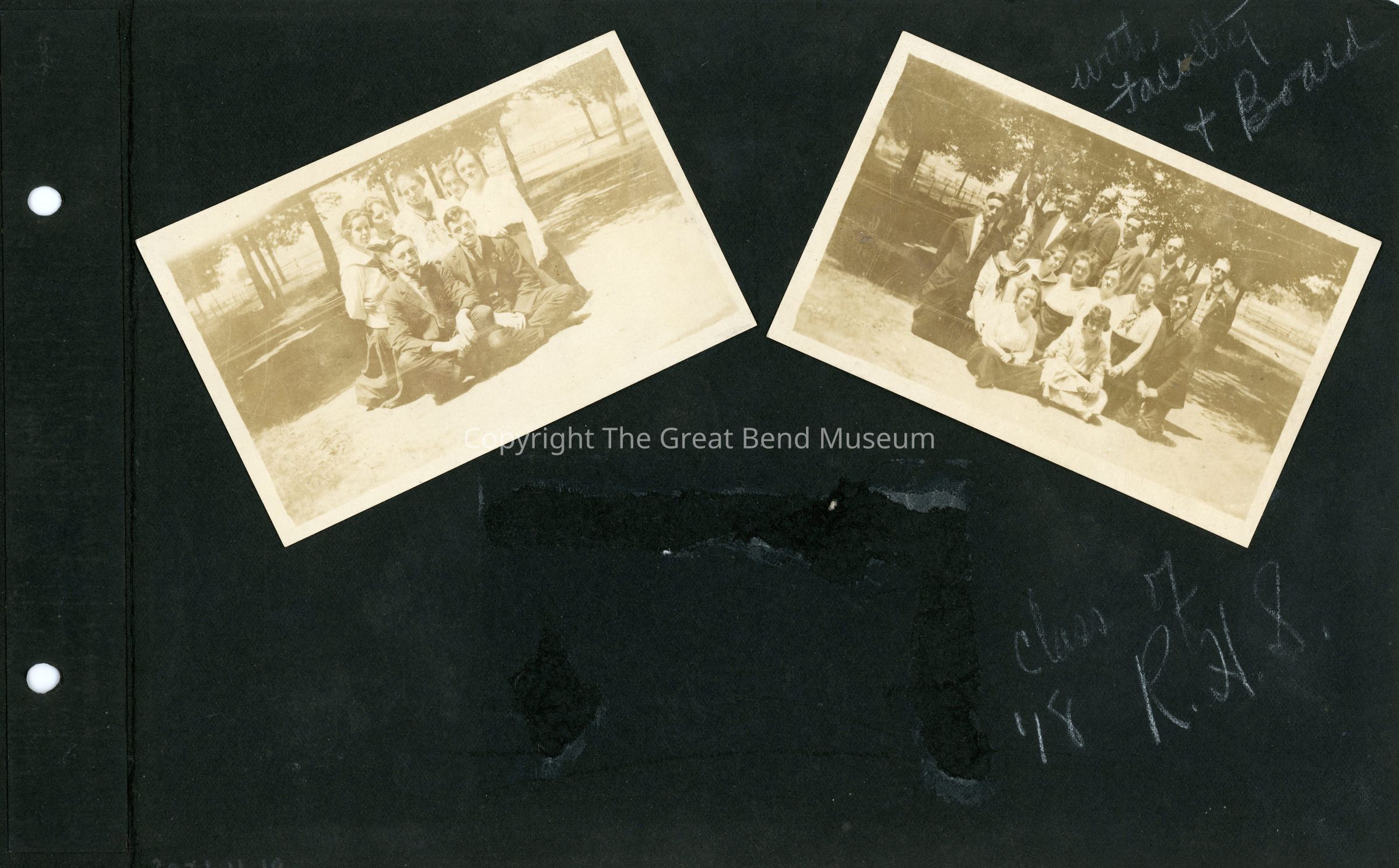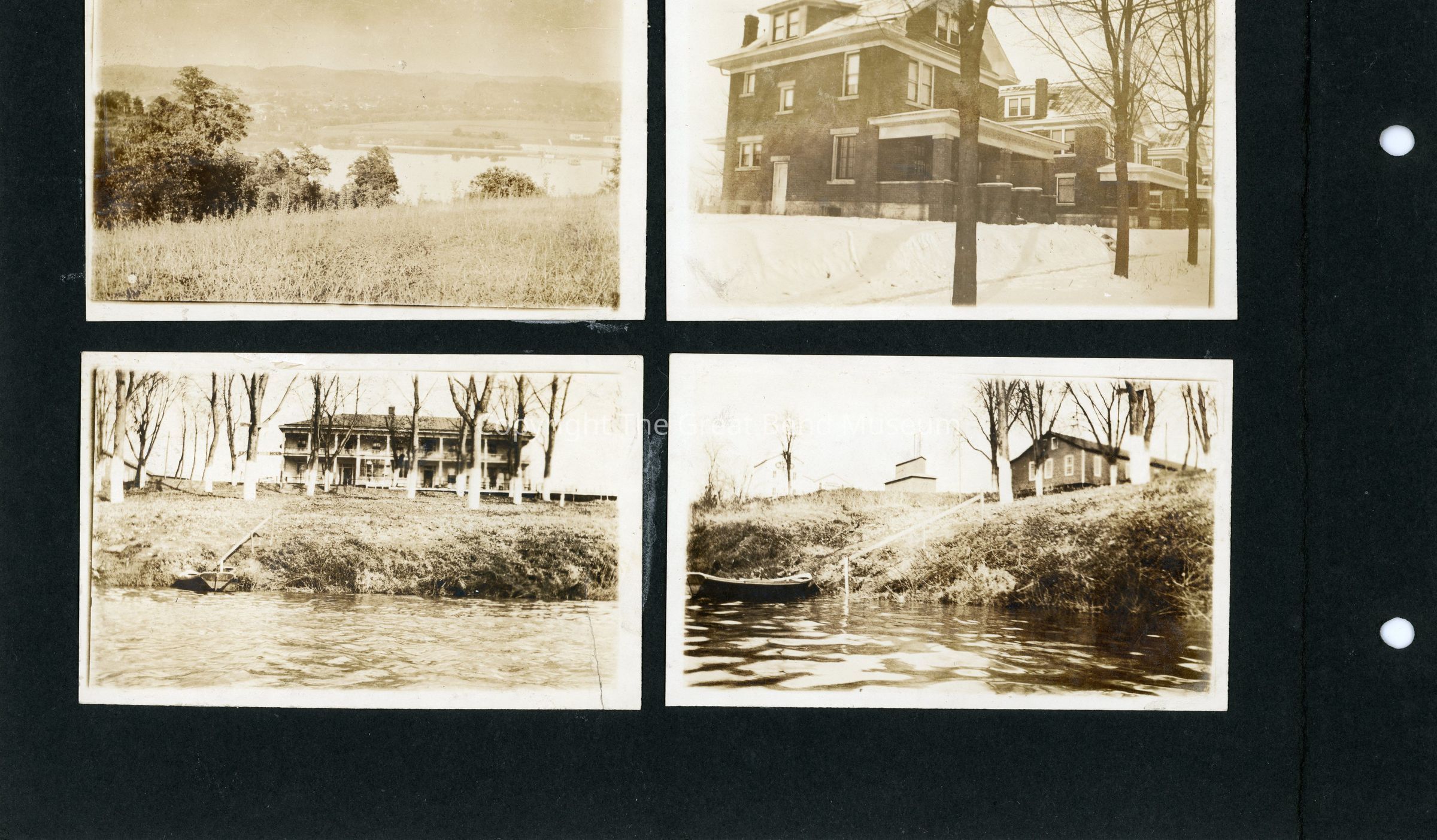 Black paper scrapbook album page, landscape oriented with 2 hole punches on short edge. 4 photos on one side (Weisheit home in snow, river scene, ravenswood house from river, and st dennis mills/cannery from river). 1918 class photos on other side (2 present, one missing). 1 photo just students, other students with faculty.Photograph Details