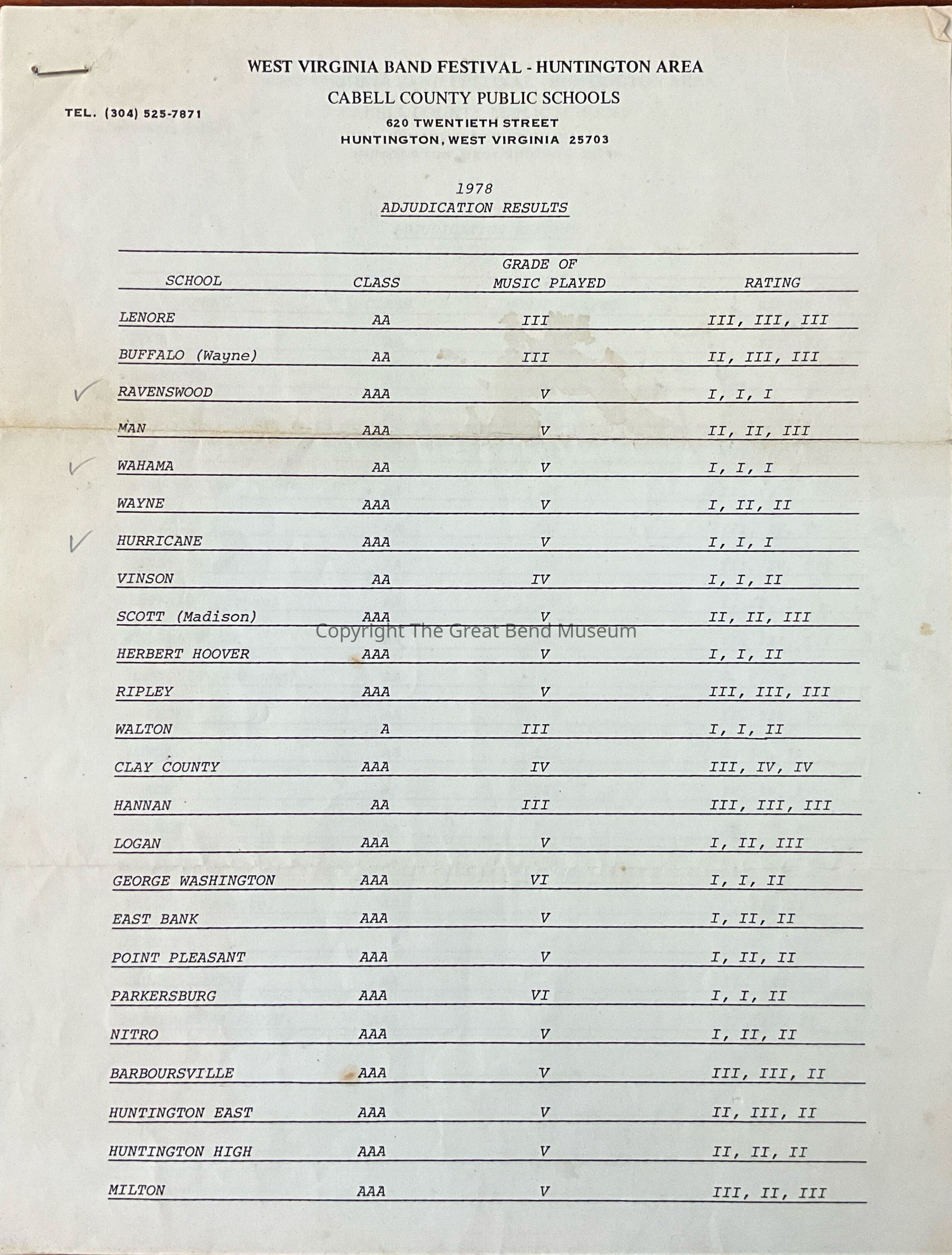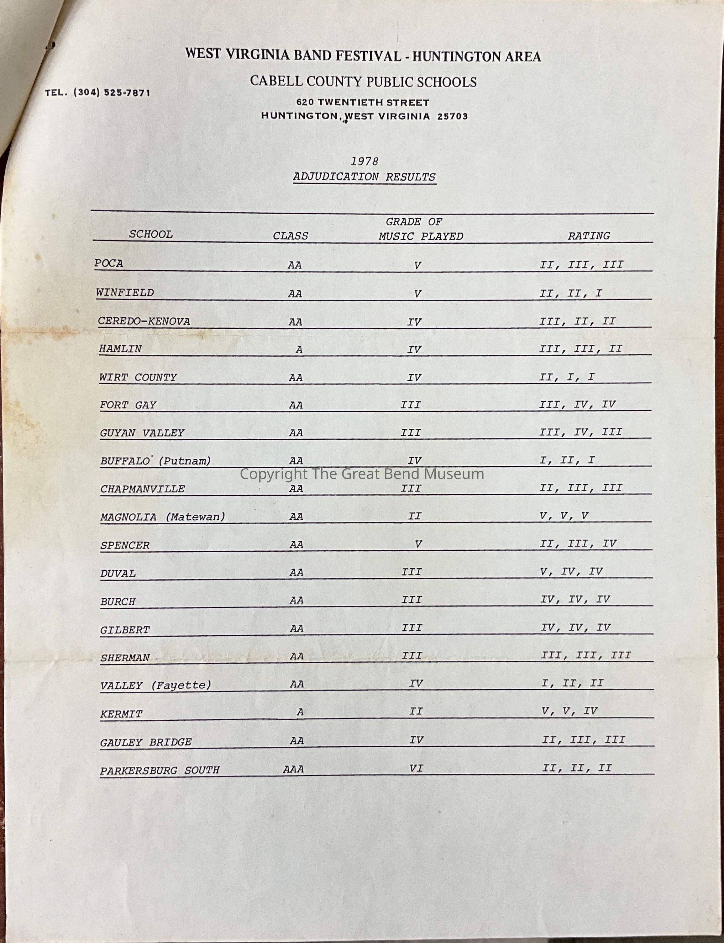 West Virginia Band Festival - Huntington Area - 1978 Adjudication ResultsEntry/Object ID