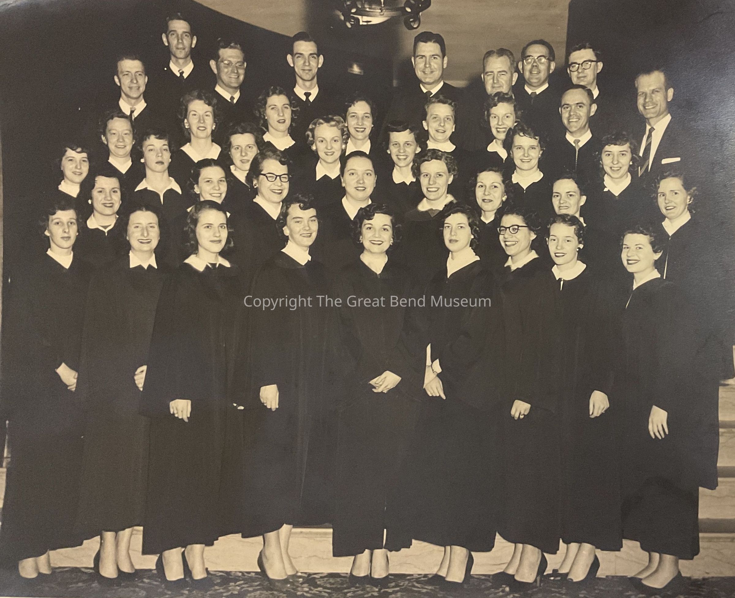 Photo - Women and men in WV Telephone Chorus. Director top right in suit. Approximately 38 members standing on stairsteps. Members names are on reverse of photo.Acquisition