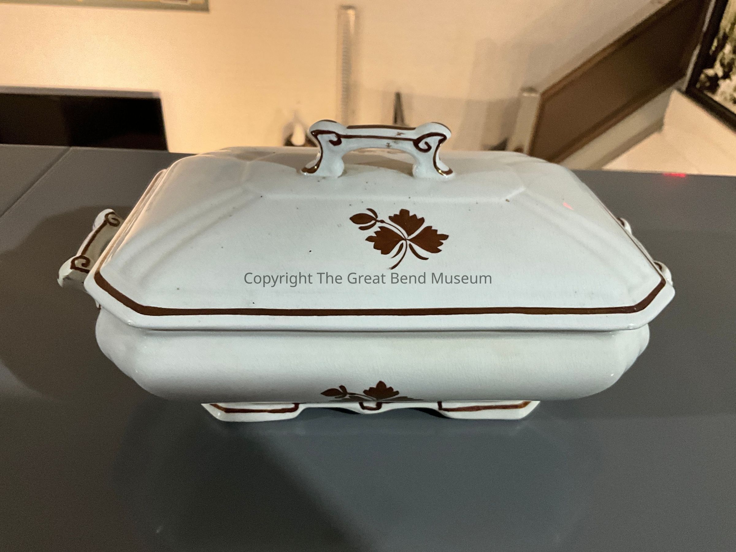 med size white with gold edging and "tea leaf" design lidded casserole dish - flat platform bottom - shape of dish is squared with handles on the sides. It has "Royal Ironstone China, Alfred Meakin, England" on bottom.Acquisition