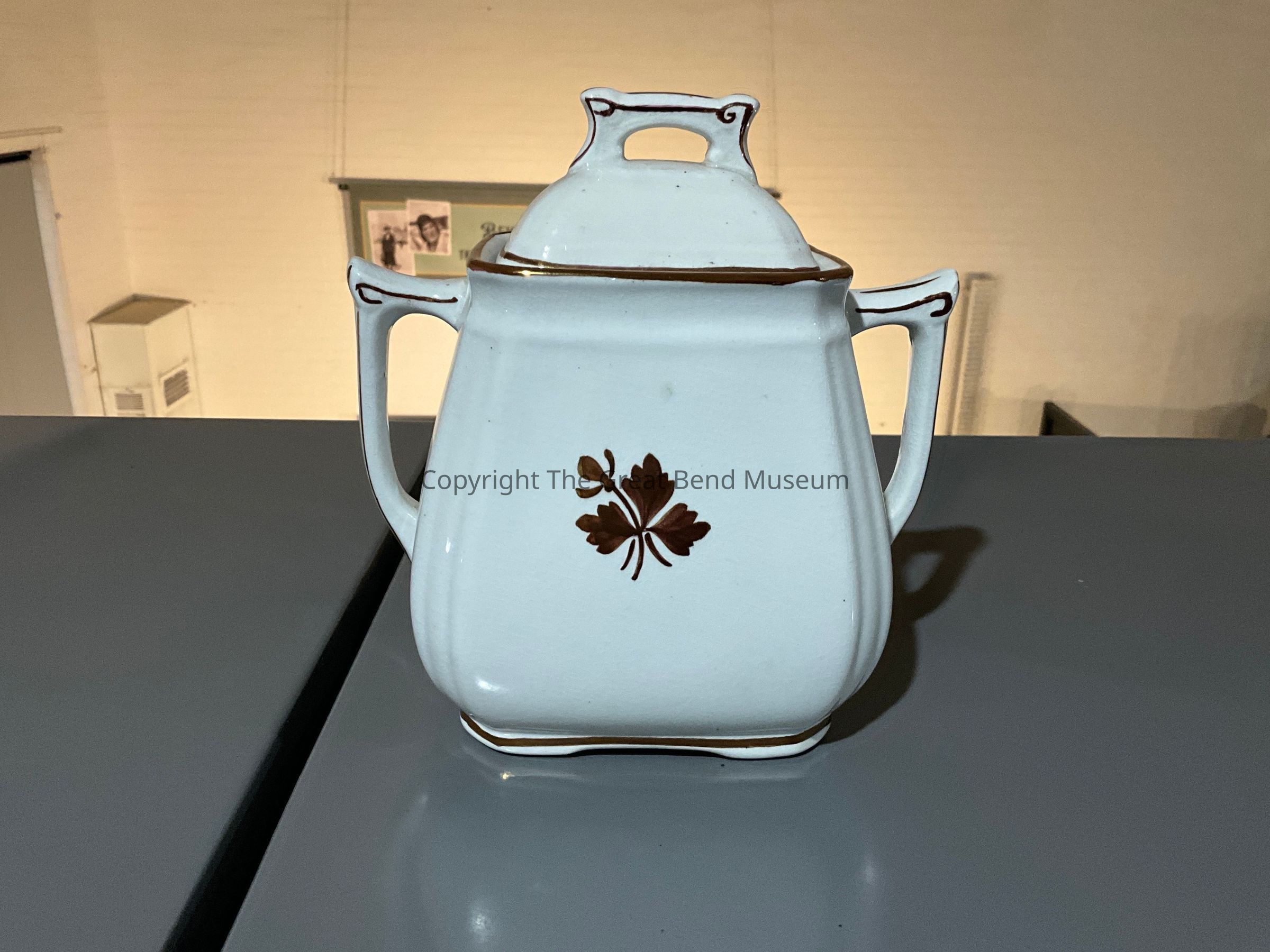 Large white ironstone china sugar bowl. Has gold edging on lid and handles on either side with tea leaf design on front and back. Has "Royal --- Alfred Meak. England stamped on bottom. Part of stamp is missing - not sure if its from wear or misprint, sugar bowl has lid and 2 handles on either side.Acquisition