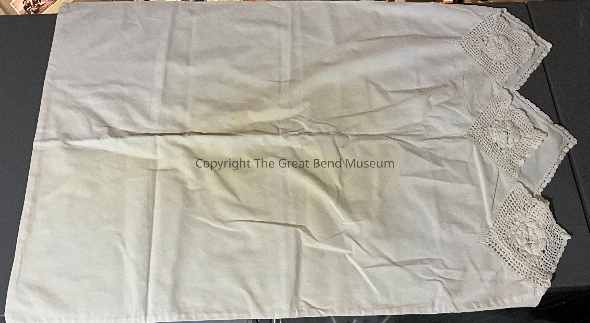 Pair of white linen pillowcases made by Catherine A. Murray in 1915. White with crocheted edging - linen has yellowed where exposedAcquisition
