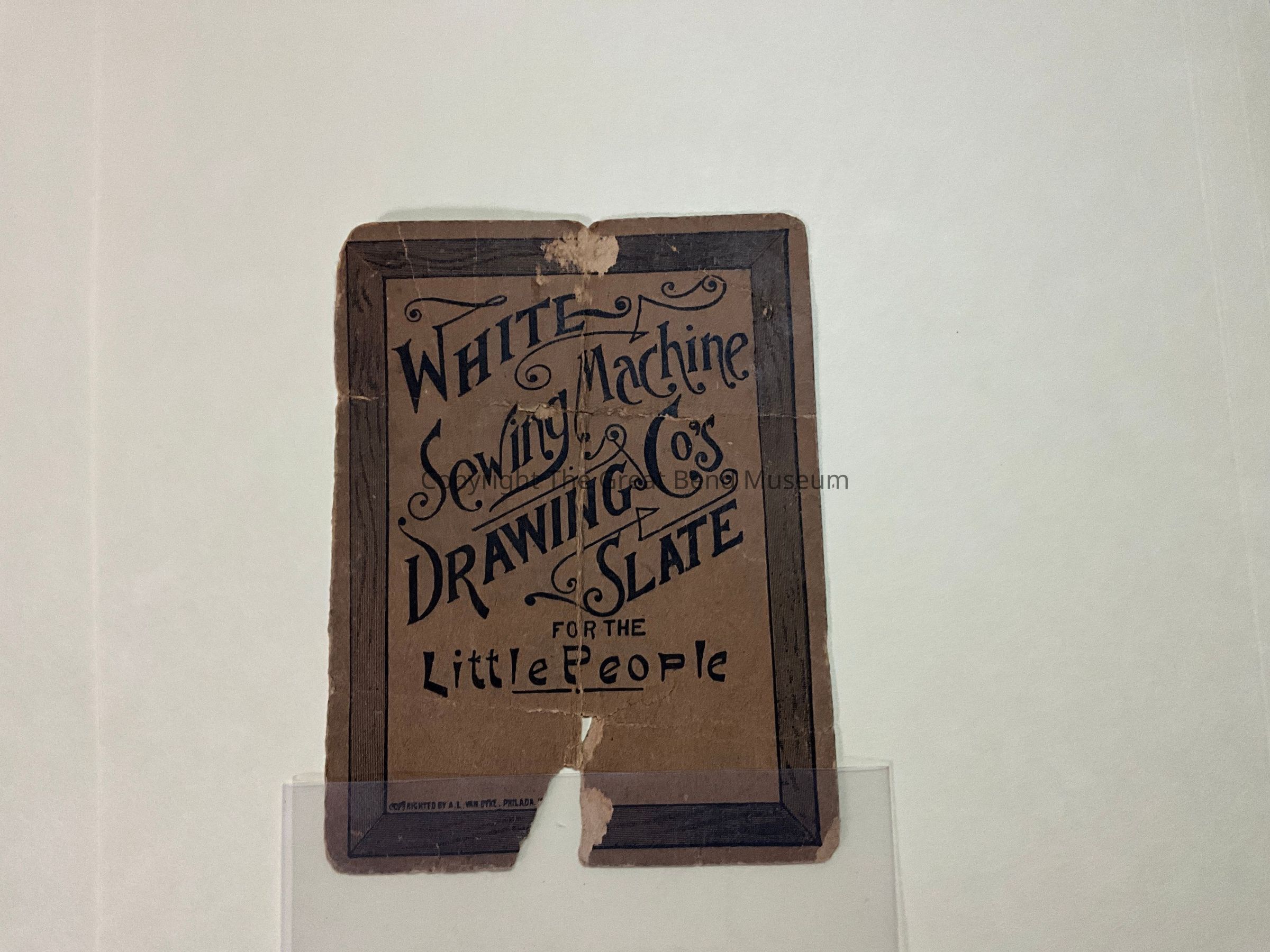 Small dark card with White Sewing Machine Co. advertised on front. Back was a slate that kids could draw a picture on. It was advertised as a slate for the "Little People". Haas black border - paper has darkened quite a bit. Back has drawn pictures of box, pitcher, man. leaf, glass, coal bucket, scissors, jug, stairs, bell company.Acquisition