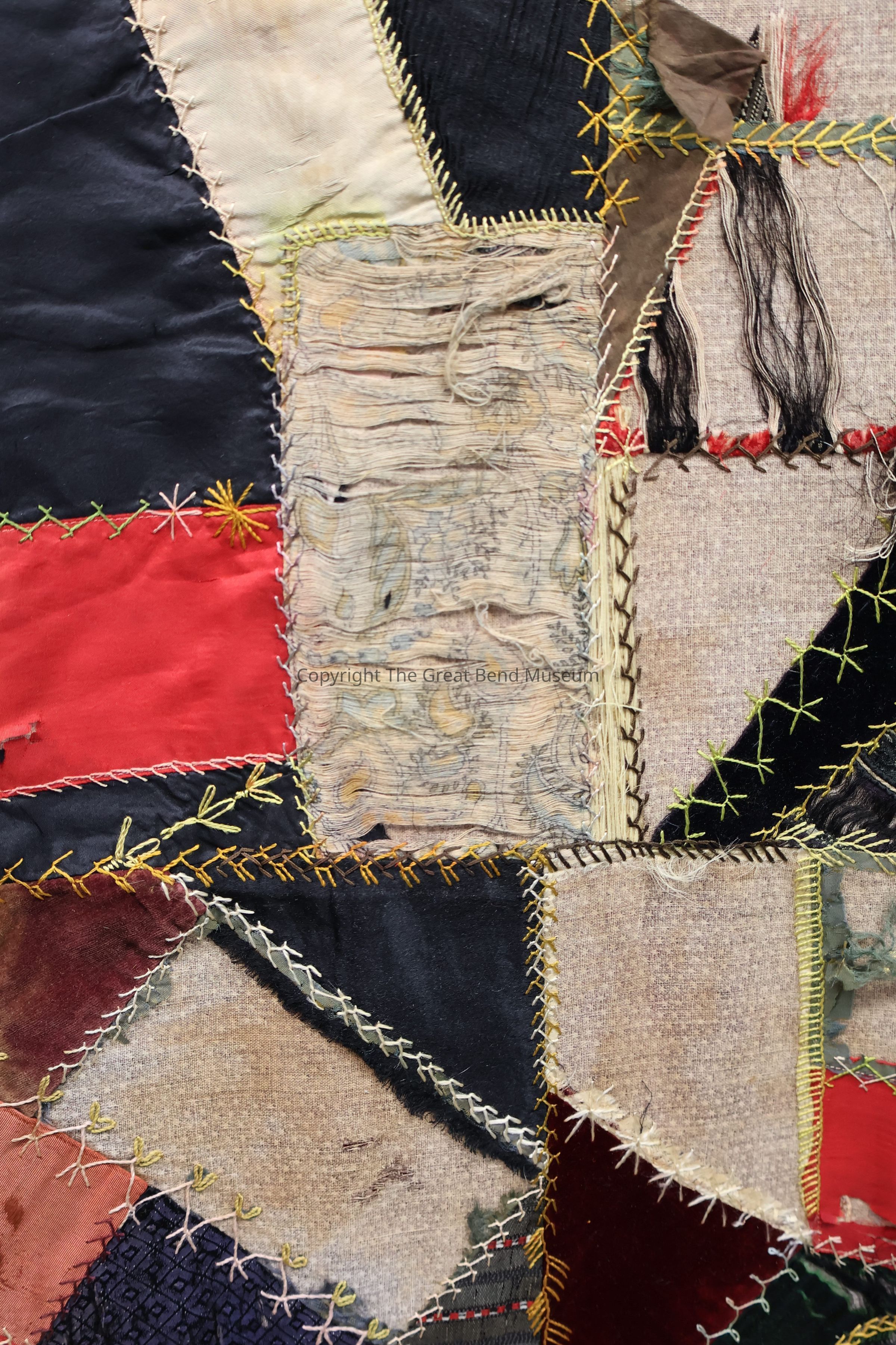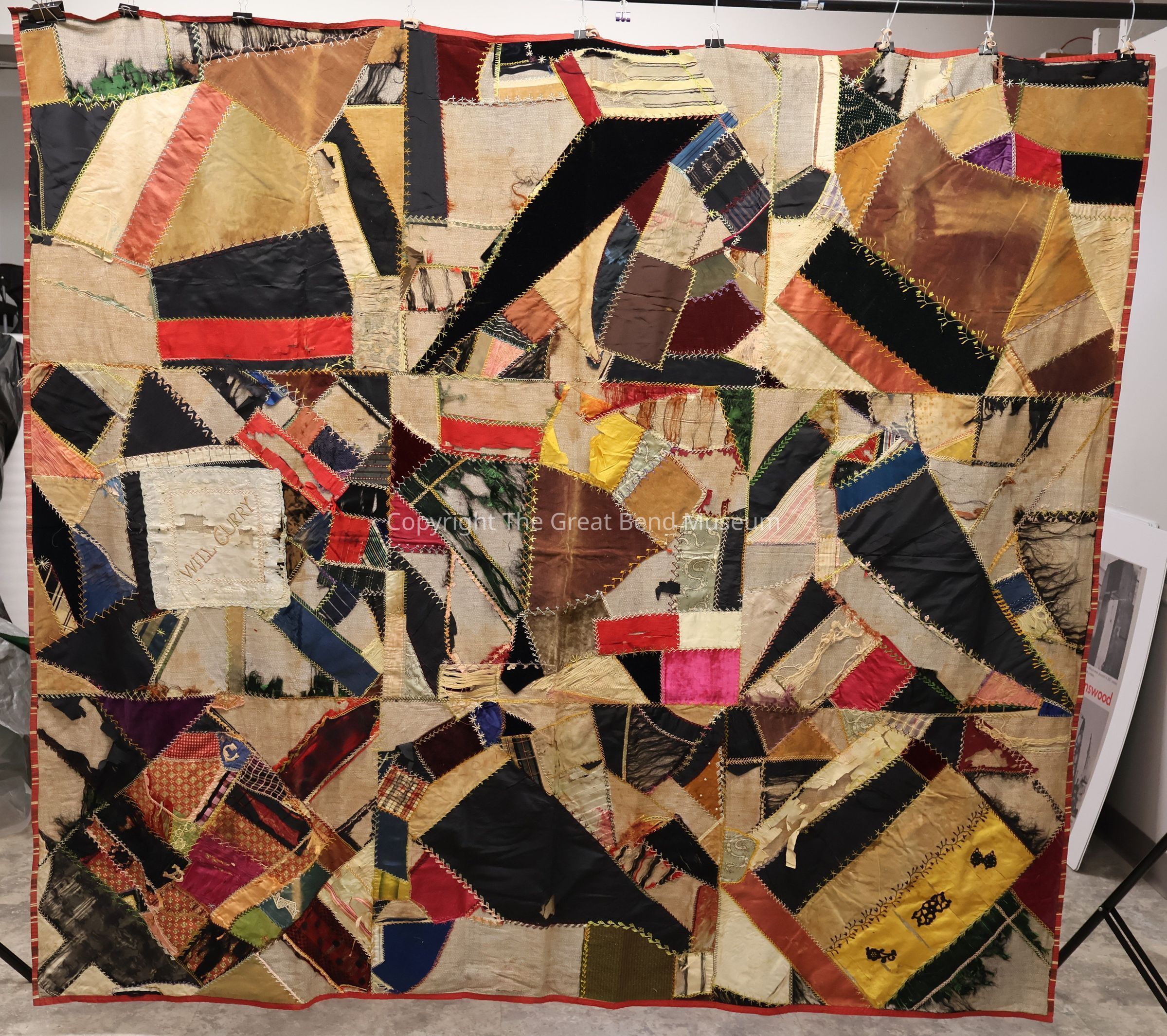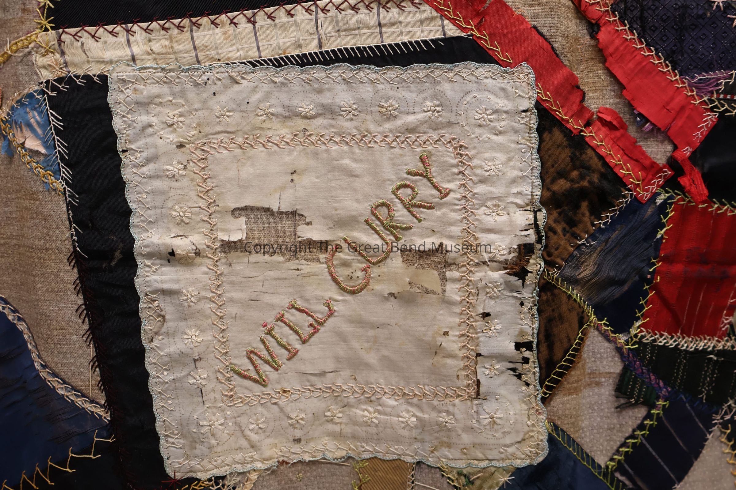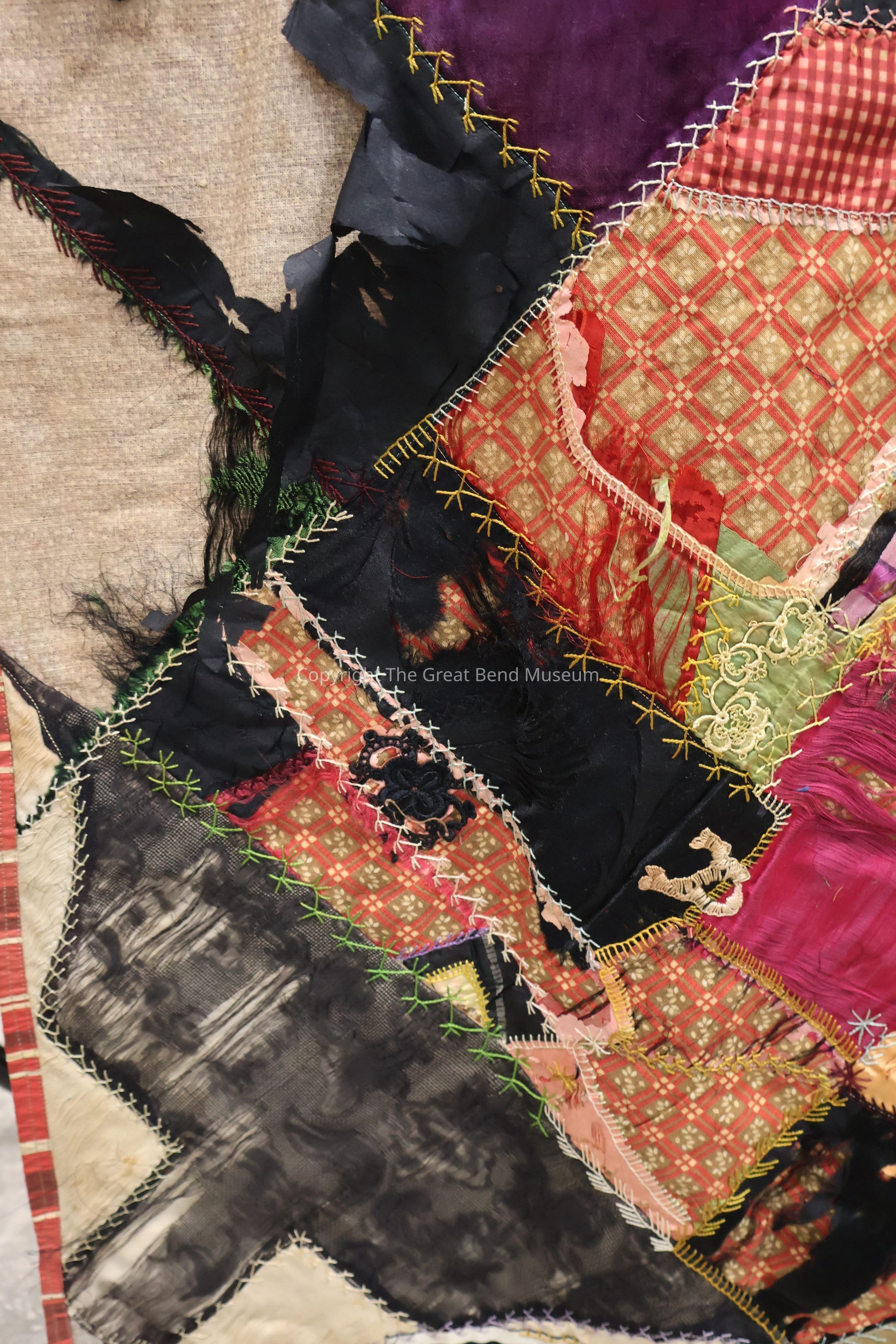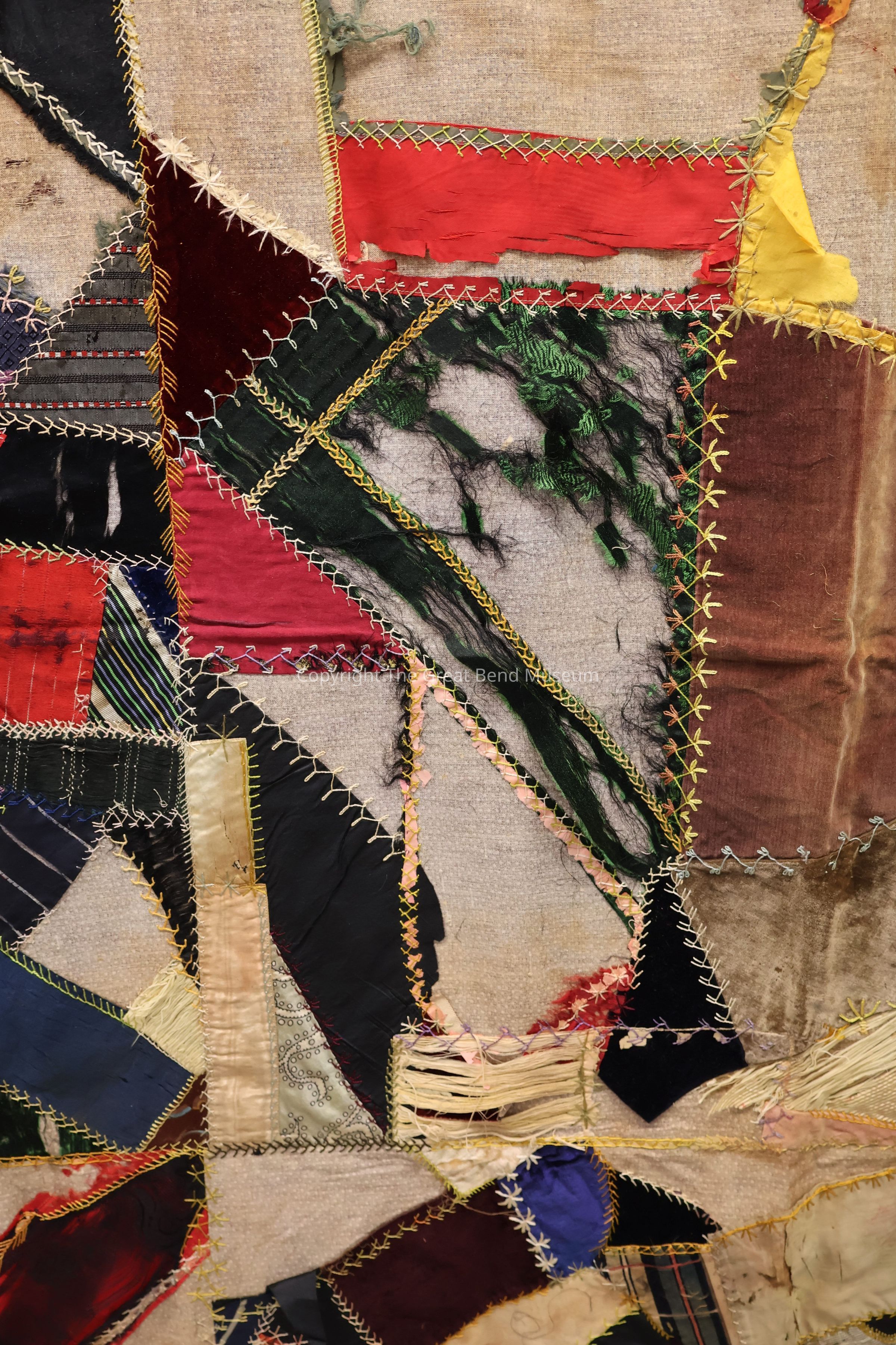 All colors crazy patch quilt. Blue, pink, orange, tan, etc. has one square with the name Will Curry. Patch are sewn together to form the quilt. Quilt was given to Esther Hutchinson. Fabric was acquired from various sources. Each with interesting origin stories. For example old draped, lace lined hand kerchiefs. Esther's relation to Will was uncertain, but she kept the quilt until her death.Acquisition