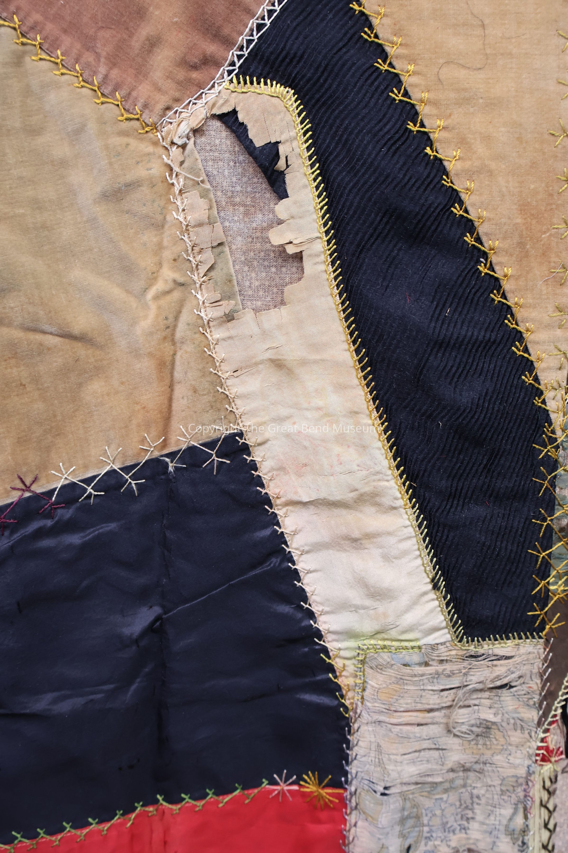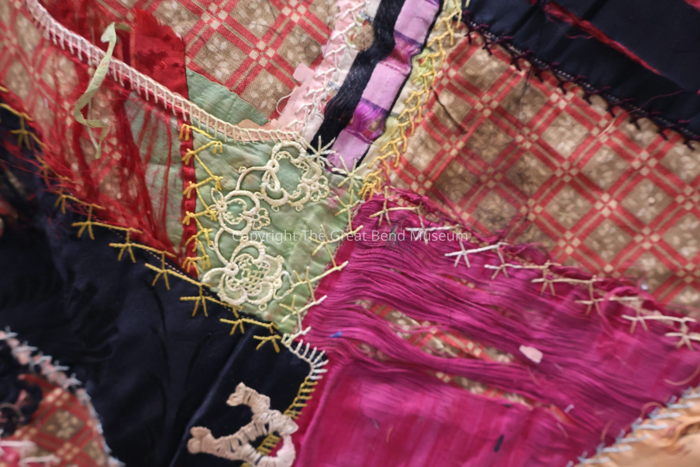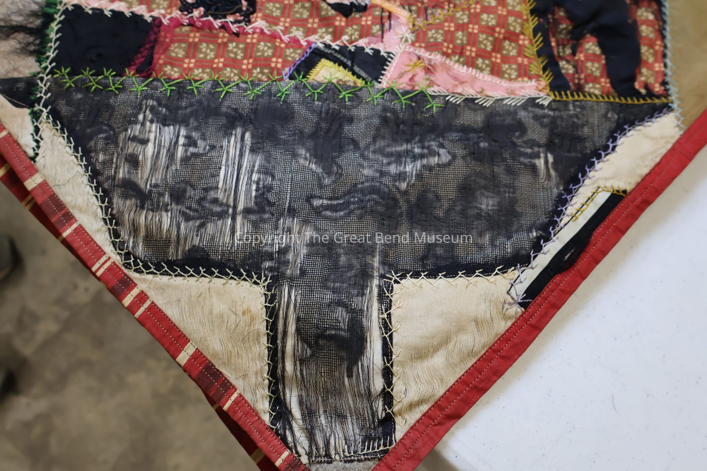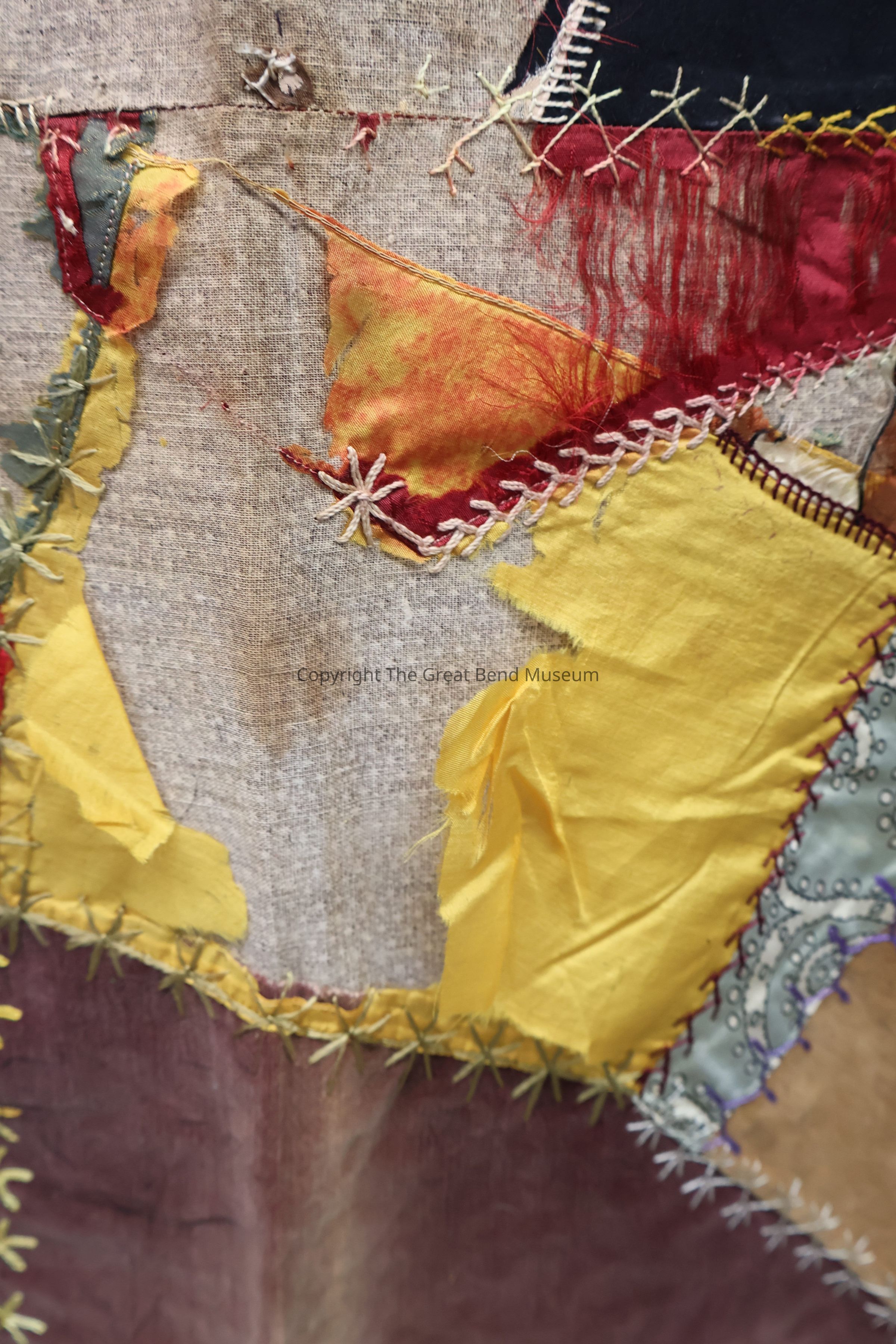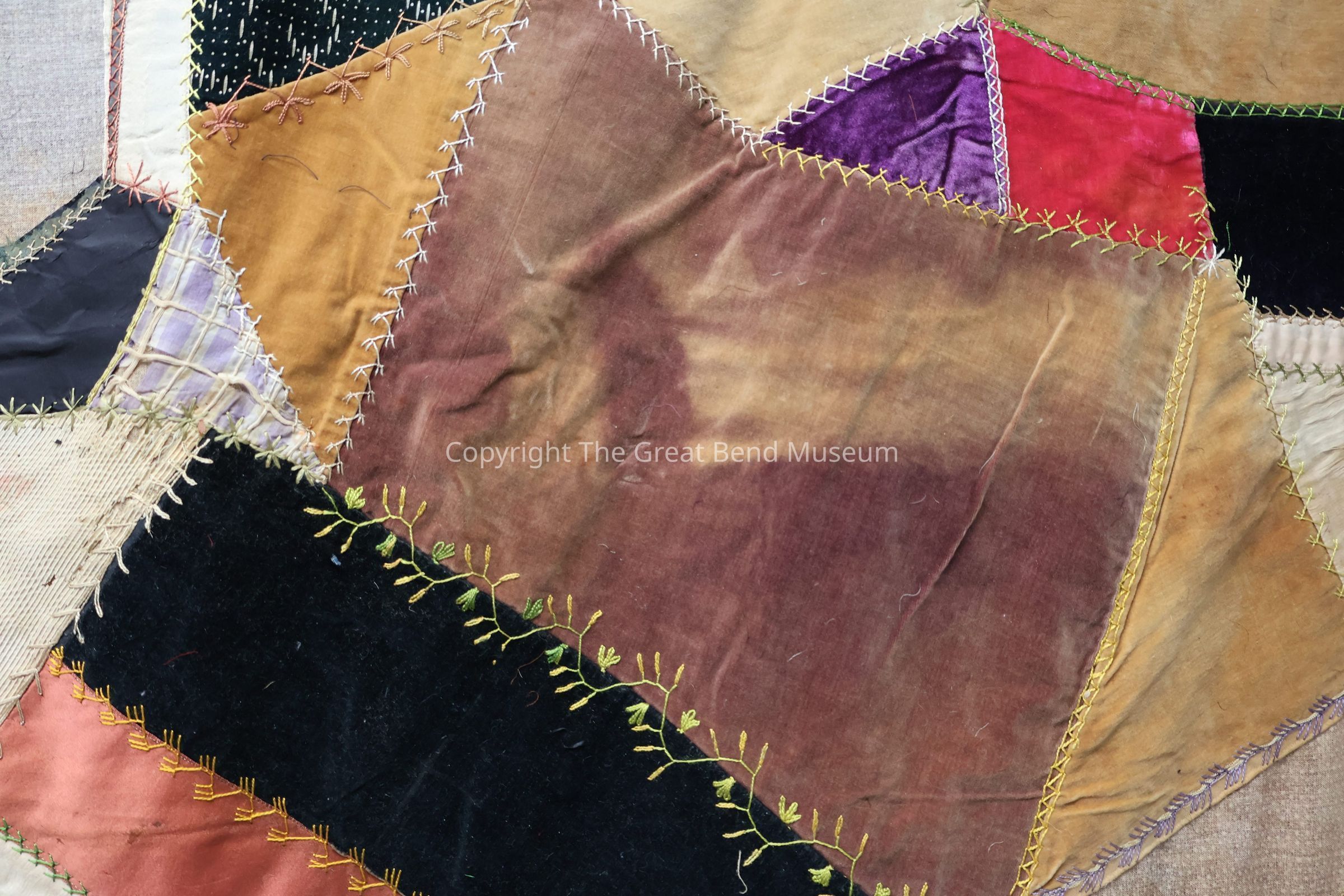 All colors crazy patch quilt. Blue, pink, orange, tan, etc. has one square with the name Will Curry. Patch are sewn together to form the quilt. Quilt was given to Esther Hutchinson. Fabric was acquired from various sources. Each with interesting origin stories. For example old draped, lace lined hand kerchiefs. Esther's relation to Will was uncertain, but she kept the quilt until her death.Acquisition