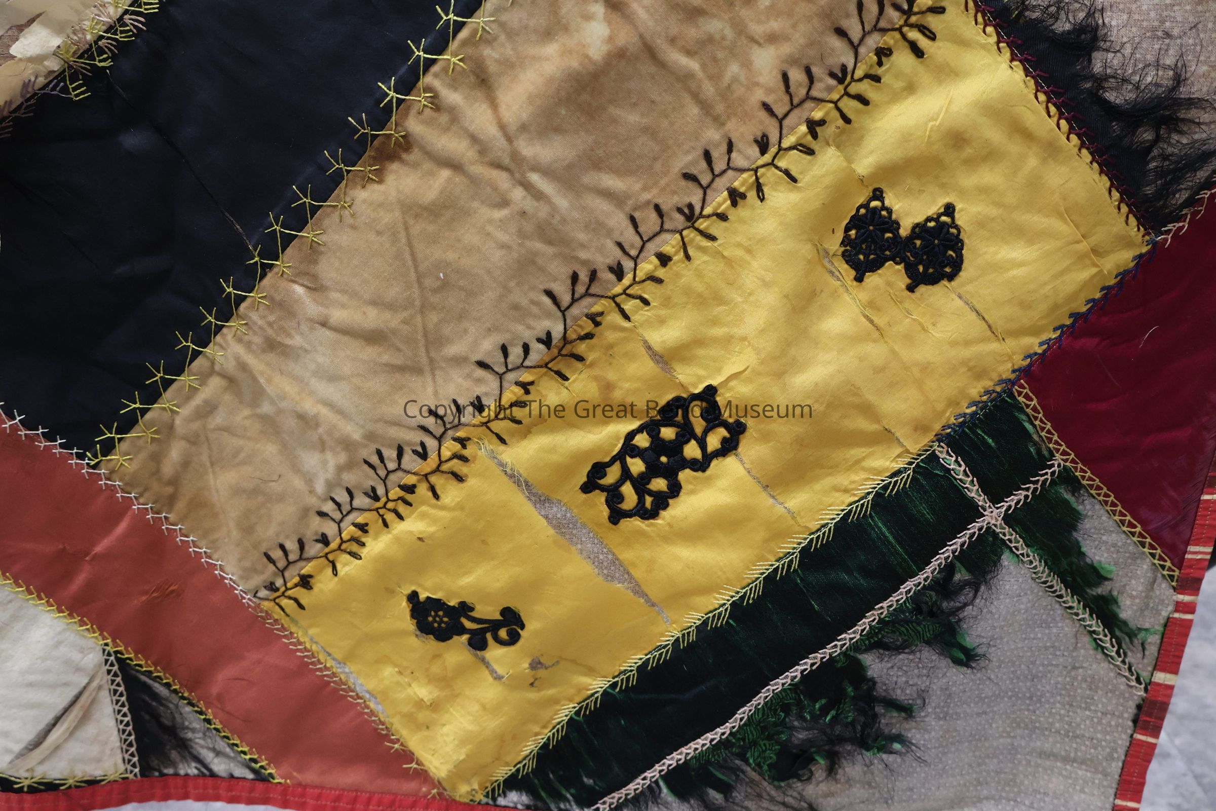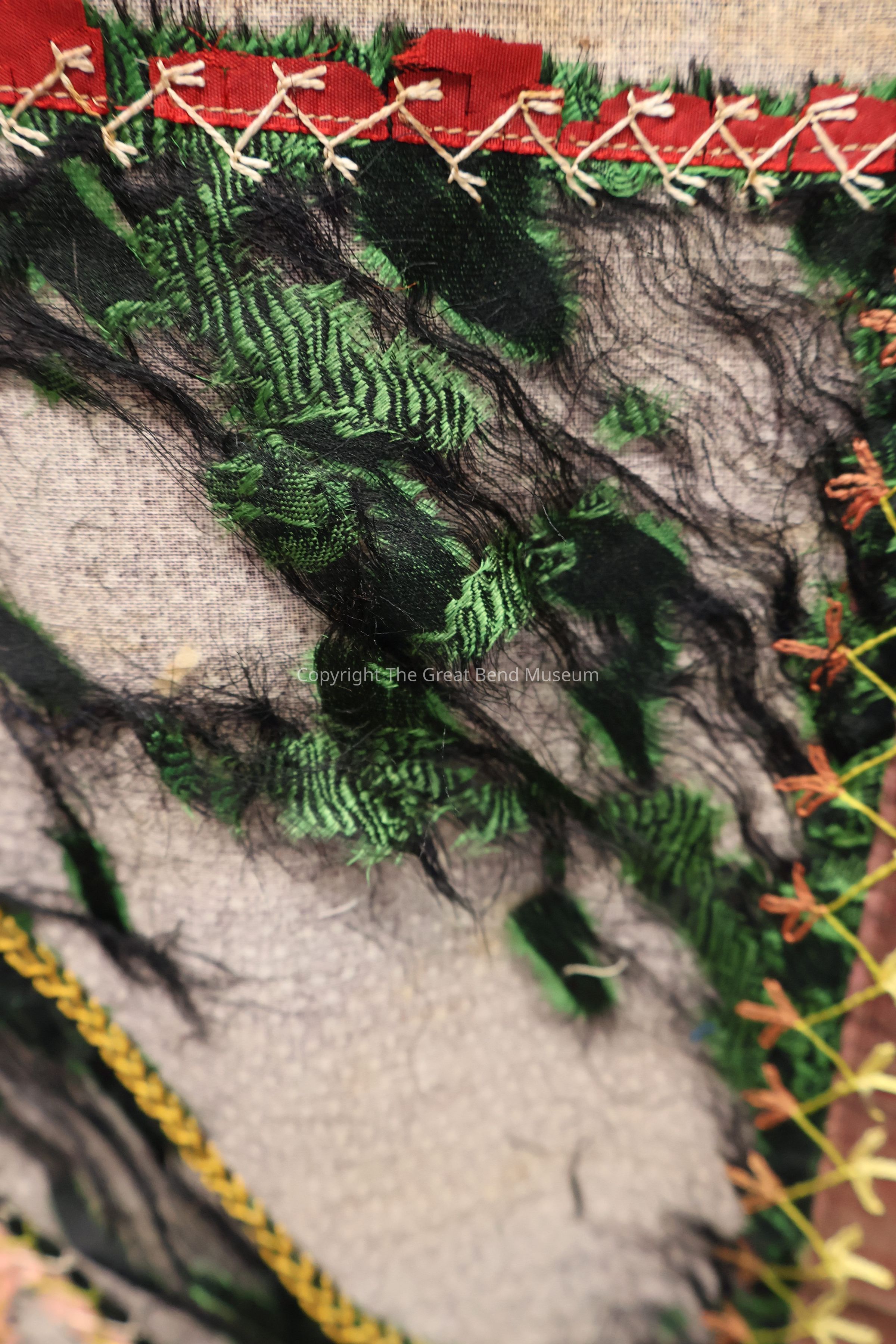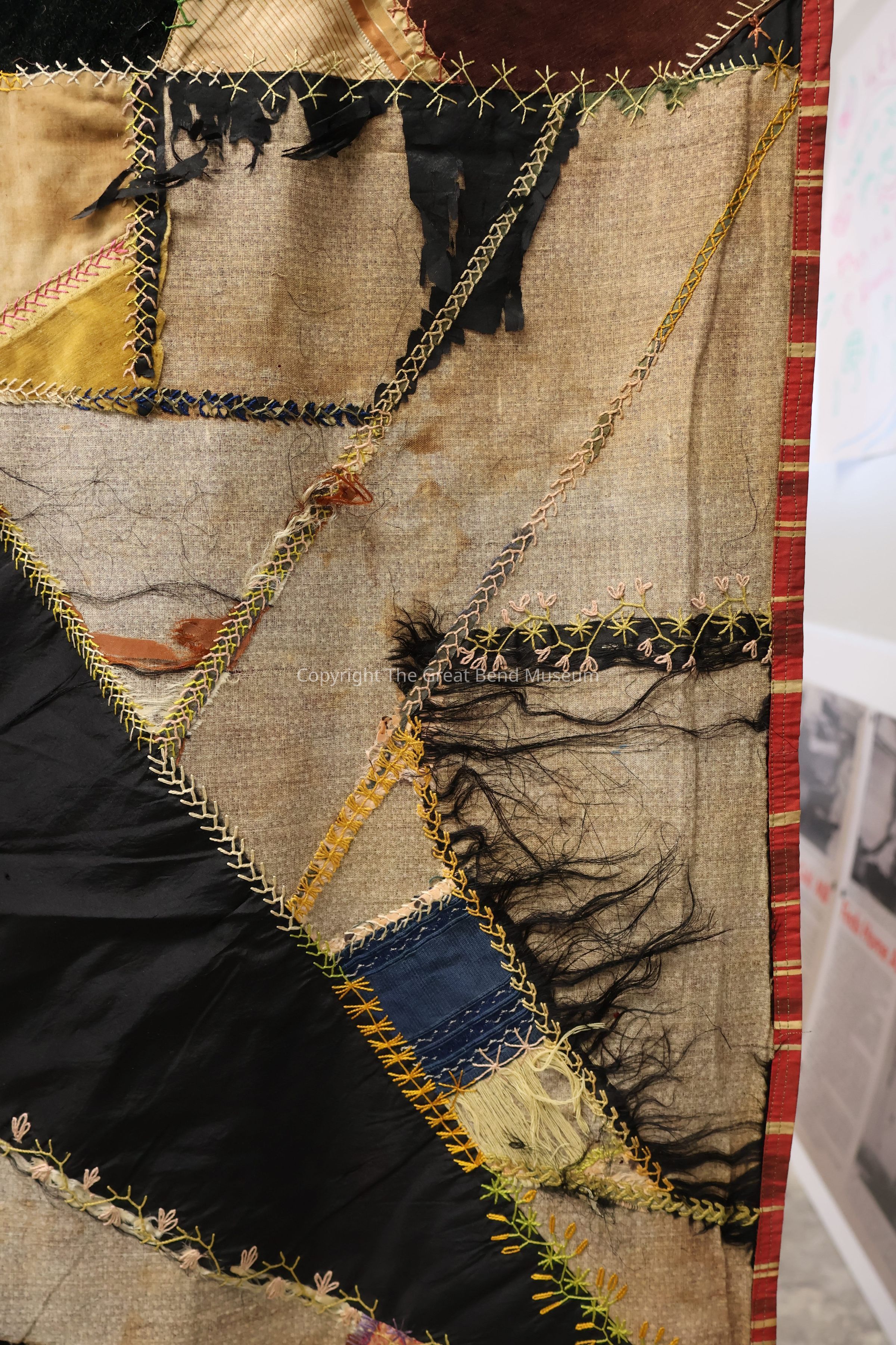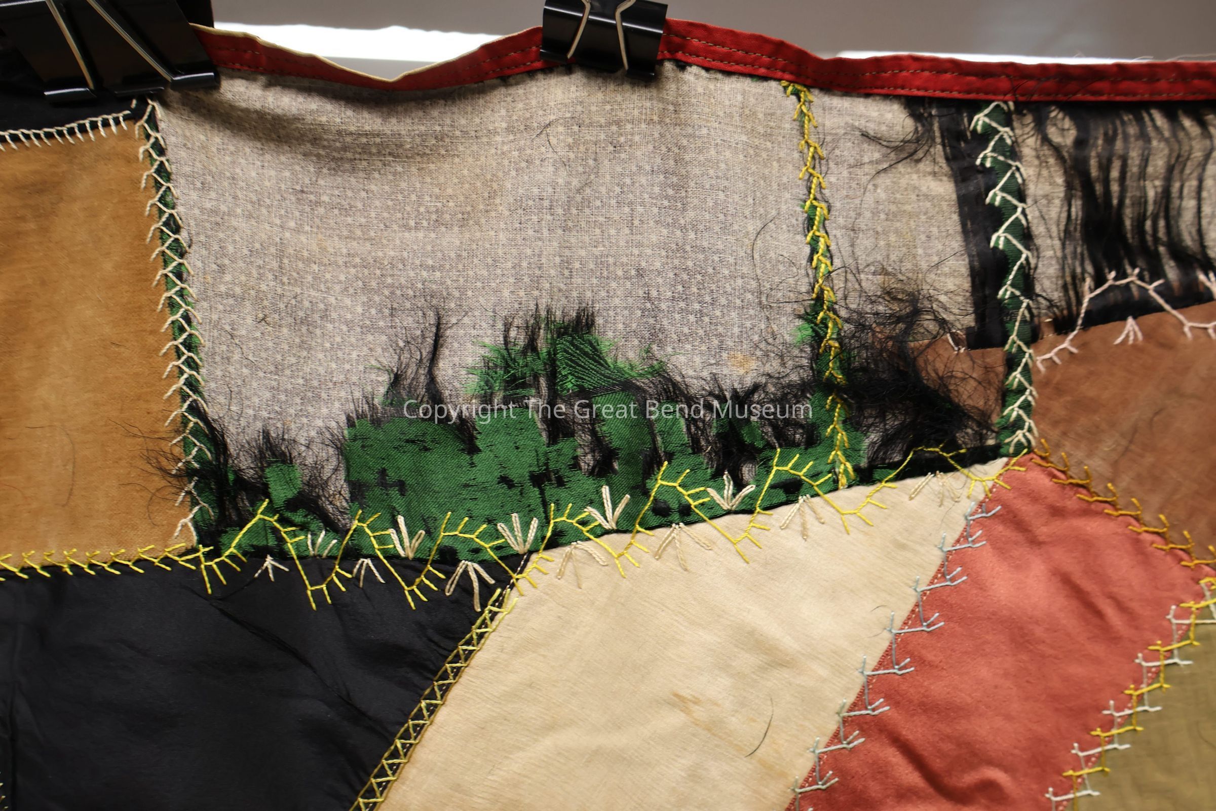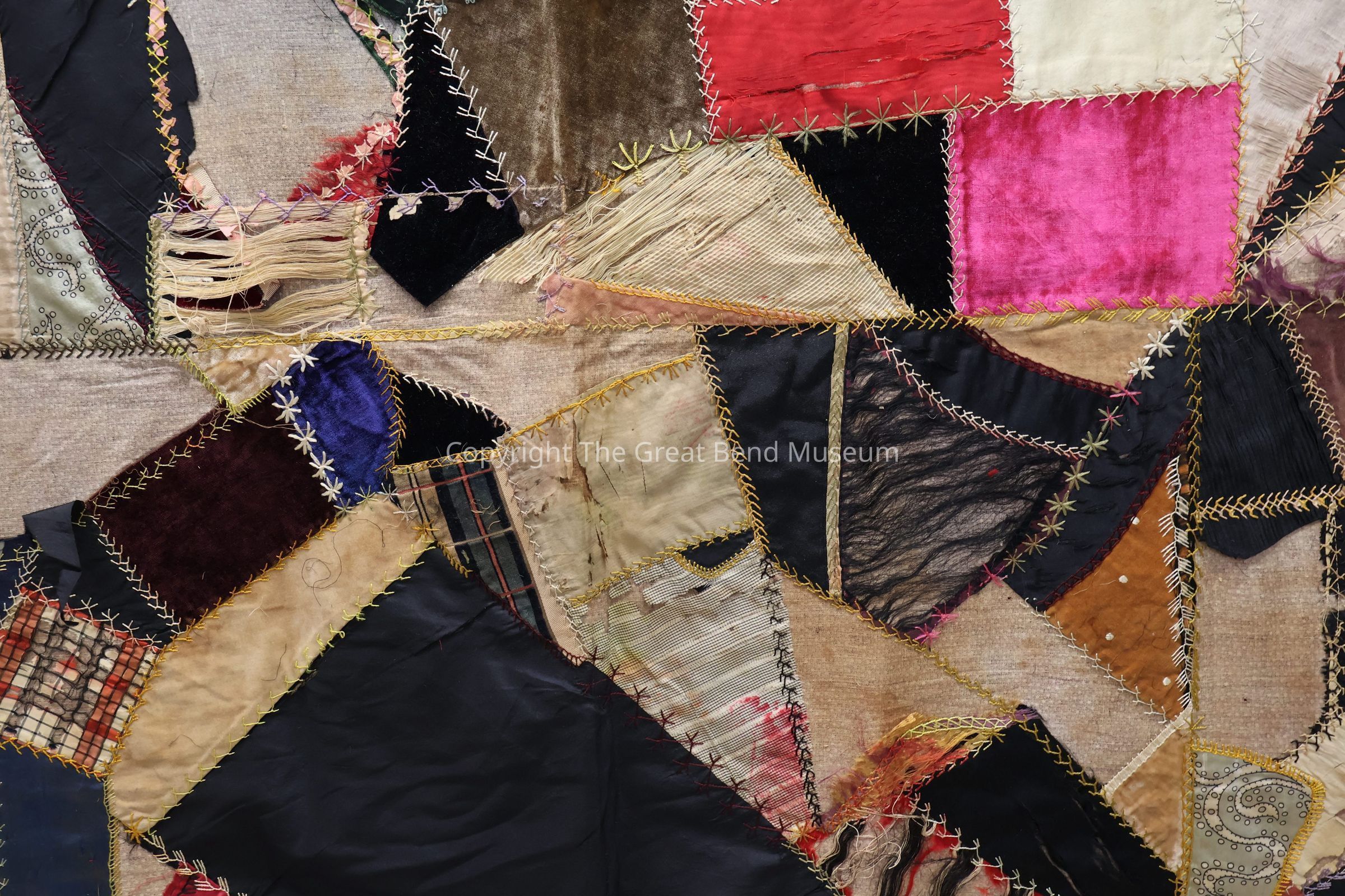 All colors crazy patch quilt. Blue, pink, orange, tan, etc. has one square with the name Will Curry. Patch are sewn together to form the quilt. Quilt was given to Esther Hutchinson. Fabric was acquired from various sources. Each with interesting origin stories. For example old draped, lace lined hand kerchiefs. Esther's relation to Will was uncertain, but she kept the quilt until her death.Acquisition
