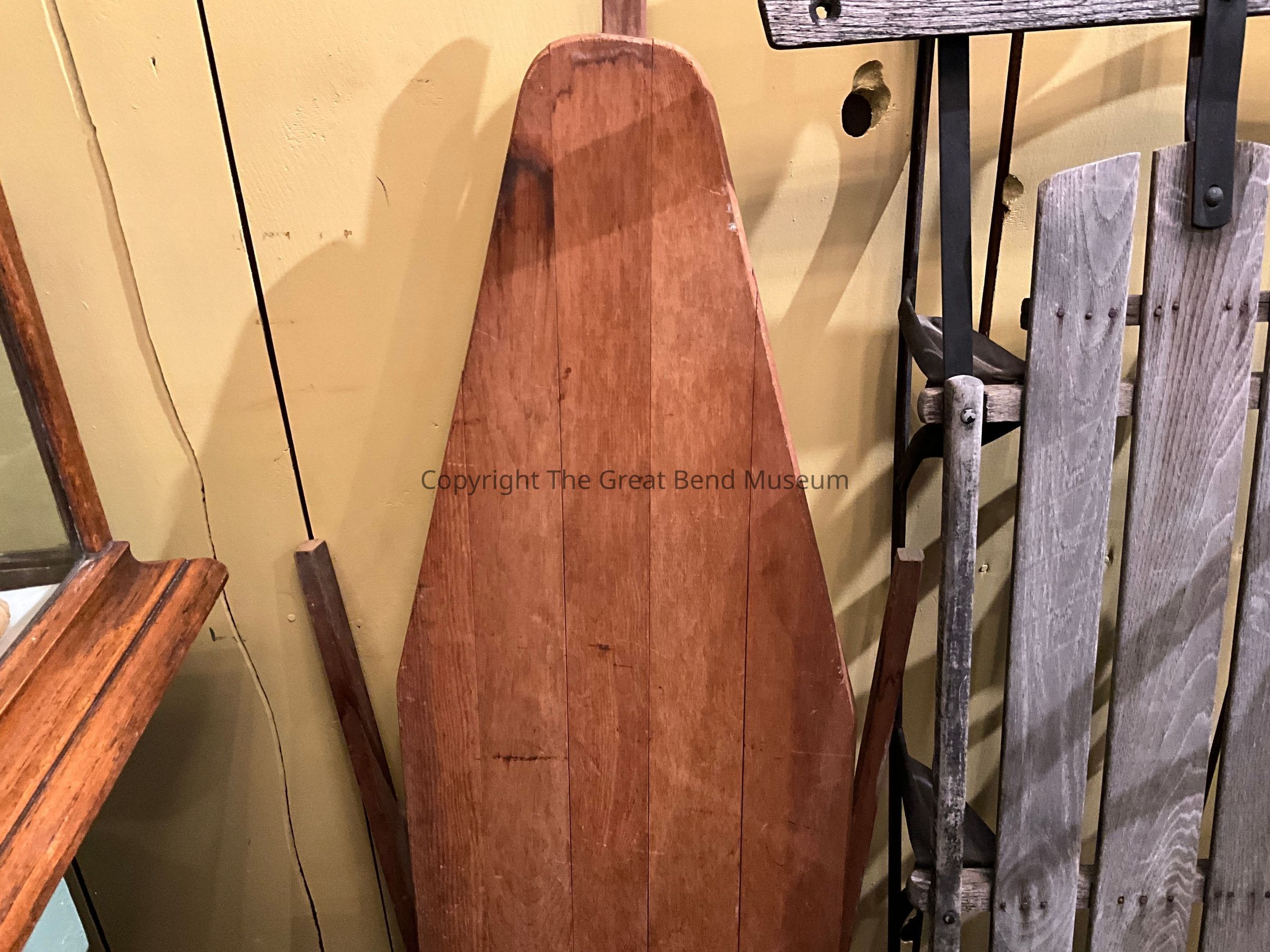 Wooden ironing board - has metal round brace between fold down top. Top has 5 flat boards glued together and cut out shape - then edges roundedAcquisition